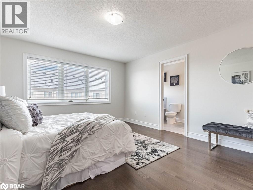 Bedroom featuring a textured ceiling, wood finished floors, and connected bathroom