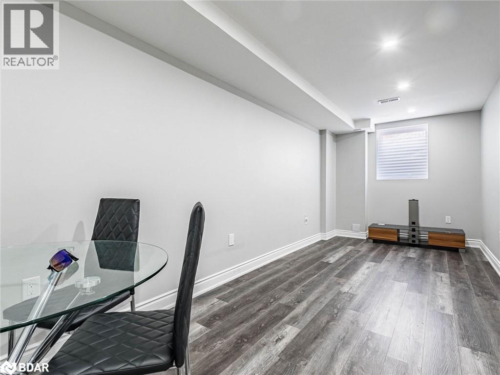 Basement featuring dark wood-type flooring and recessed lighting