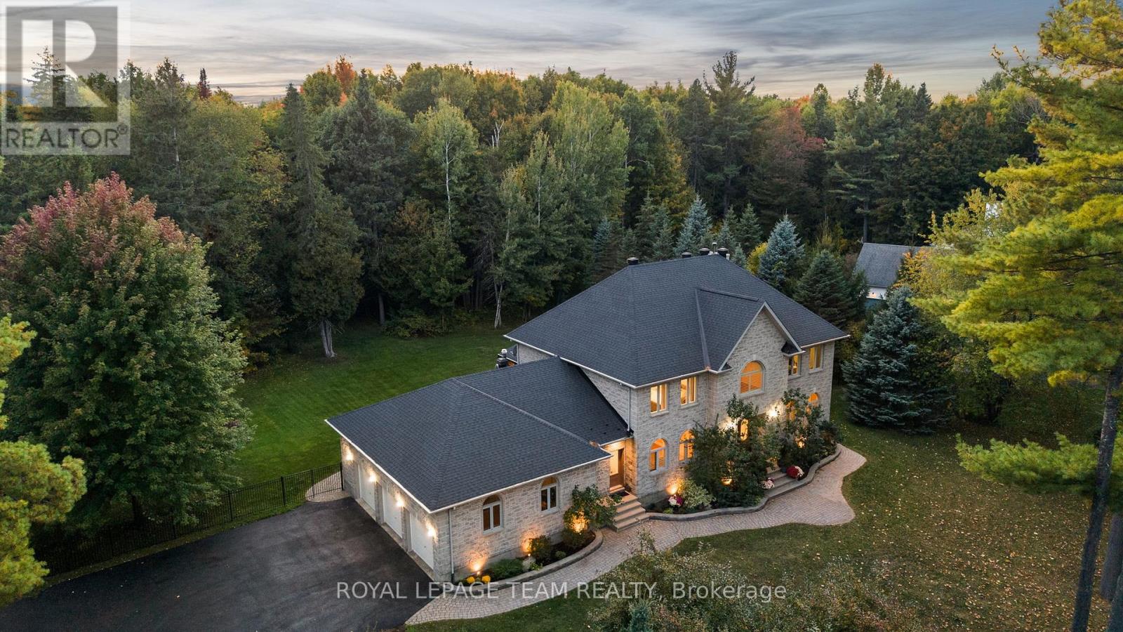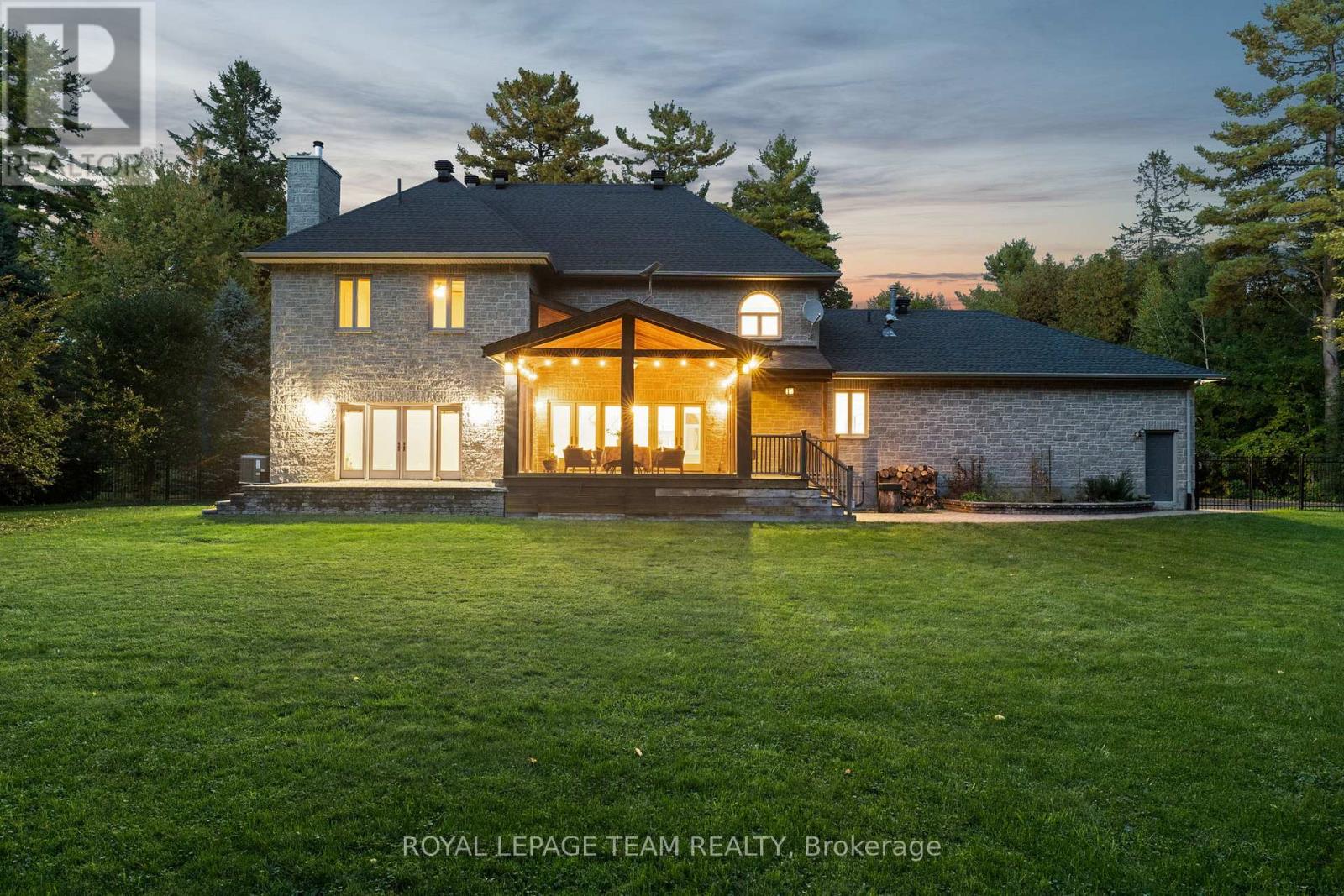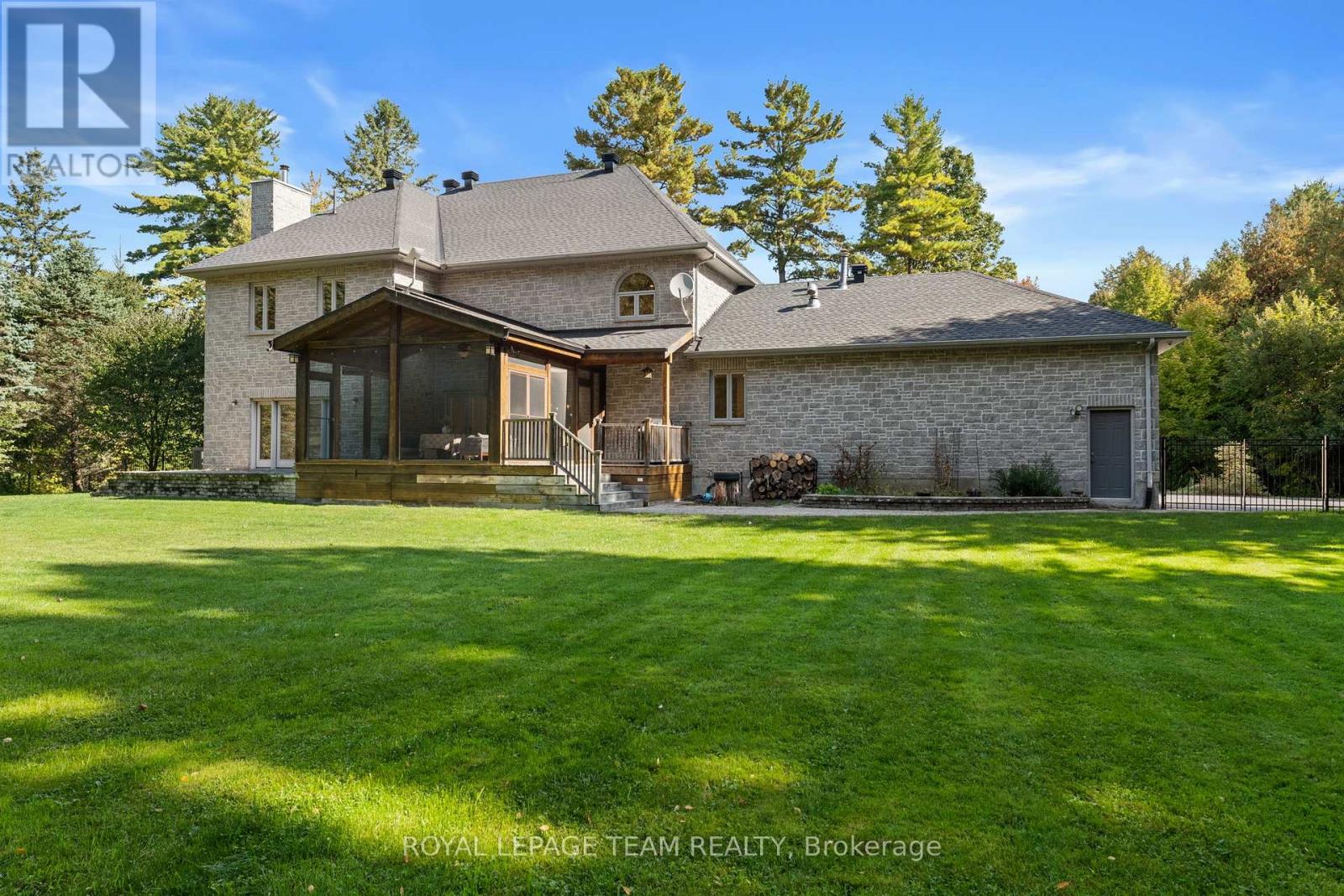 Set on a winding drive and surrounded by mature trees, this full-stone executive residence offers both presence and privacy in a truly natural setting. Built in 2000, the 2-storey design blends timeless elegance with thoughtful updates across approximately 4,100 sq ft above grade (MPAC), set on 2.47 acres. A grand double-door entry opens to a tiled foyer and freshly painted interiors, where 9 ceilings, refinished hardwood flooring, and California shutters create a warm welcome. Formal living and dining rooms provide ideal spaces for entertaining, while the sunken family room with pillars and wood-burning fireplace is perfect for everyday gatherings. The 2024 Deslaurier kitchen is a true highlight: Sub-Zero/Wolf appliances (fridge, induction stove, microwave, wine fridge), custom cabinetry, quartz counters, large island with seating for 6, prep sink, pot lights, and undercabinet lighting. French doors lead to a screened porch with vaulted ceiling - a year-round favourite. Upstairs, hardwood flooring continues, with a spacious primary retreat offering a gas fireplace, custom walk-in cabinetry (2023), and a spa ensuite with soaker tub, dual vanities, heated floors & towel rack. The updated main bath (2018) also features custom finishes, heated floors & towel rack. A mudroom with new laundry (2025) connects to the oversized 3-car garage. Lower level unfinished with painted floors (2025). Systems: Generac 20kW generator (2021), tankless HWT owned (2023), AC (2022), 200 amp, Starlink internet, security cameras. Roof (2018), garage roof (2016), 12 windows replaced (2019-2020), driveway (2021, resealed 2025). Landscaped lot includes fenced yard with natural backdrop beyond. All this just 10 min to Tanger Outlets & 9 min to Kanatas High Tech hub -convenience meets country charm. 24 Hours Irrevocable preferred on all offers. Some images are virtually staged. (41740212)
