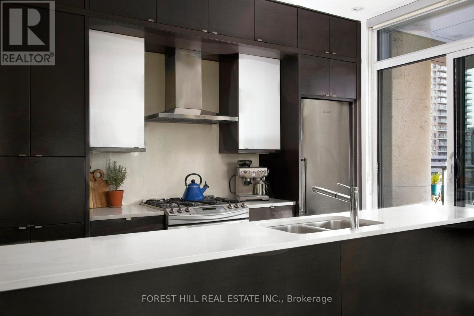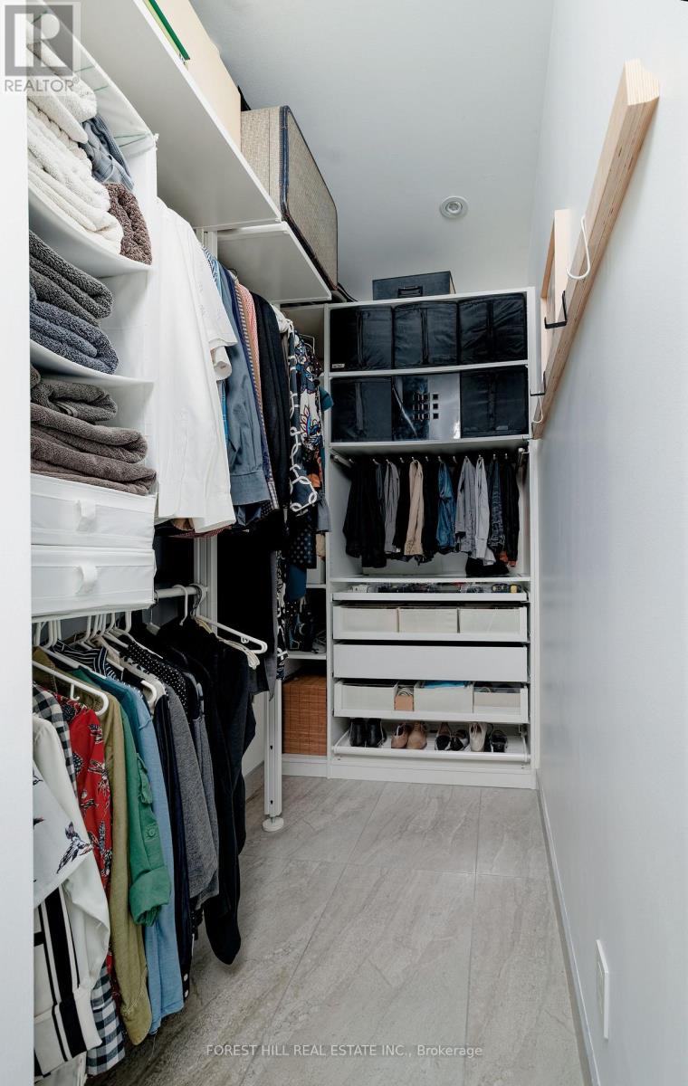 Step into your urban sanctuary at 1 Market Street, in Toronto's coveted St. Lawrence Market neighbourhood. This exceptional8th-oor combined residence spans 1,084 sq ft of artfully designed living in a U-shaped layout, flowing effortlessly into an 865 sq ft wraparound terrace with breathtaking west and south-facing skyline views. Inside, large-format porcelain floors create a sleek, contemporary canvas. The chef's kitchen boasts an 11.5 island, 30 NG range with double oven, double sink, and abundant storage. Perfect for culinary mastery. A sunlit dining area with Jotul NG replace leads to a chic seating space, while the office alcove connects to the master suite. The suite features a custom walk-in closet and spa-like 5-piece ensuite with soaker tub. The second wing offers a versatile room for a media viewing or as a guest bedroom, complemented by a separate 3-piece bathroom and entry closet. Four sliding doors invite you onto the wrap around terrace, designed for entertaining or quiet reflection, with two water features, irrigated raised planters, 2 water taps, 2 NG connections, and a private storage nook. This residence includes a secure indoor parking spot with a two-bike rack, an extra-large 8 by 10 ft locker. Market Wharf residents enjoy 24-hour security, concierge service, an award-winning gym, steam room, party room, theatre, yoga studio, guest suites. Beyond your door, immerse yourself in Toronto's nest: the historic St. Lawrence Market, boutique shops, acclaimed restaurants, Distillery District, Sugar Beach, waterfront trails, and world-class entertainment at Scotiabank Arena and Rogers Centre. With seamless transit via Union Station and the PATH network, the Financial and Entertainment Districts are always within easy reach. (41741031)