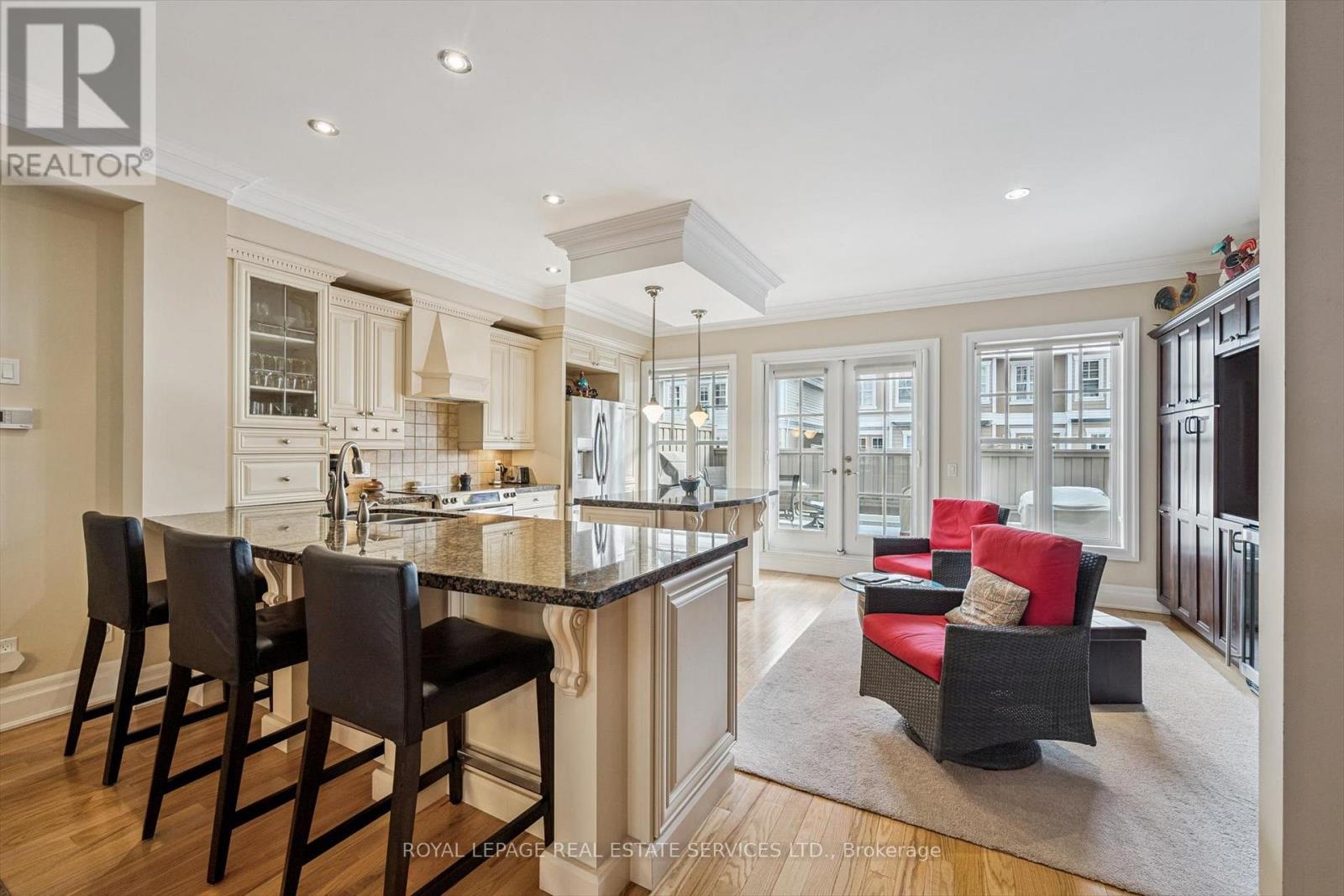 WELCOME TO THE HARBOUR CLUB - AN EXCLUSIVE COLLECTION OF BOUTIQUE TOWNHOMES JUST STEPS FROM BRONTE HARBOUR! This executive residence offers over 3,600 square feet of beautifully finished living space spanning four thoughtfully designed levels, blending house-scaled comfort with the ease of a low-maintenance condominium lifestyle. The main level showcases generous living and dining areas featuring hardwood flooring, crown moldings, a gas fireplace, and extensive custom built-ins that enhance both elegance and function. The well-appointed kitchen includes a centre island, stone countertops, stainless steel appliances, abundant cabinetry, and seamless flow into the family room/den. From here, walk out to a spacious 20' x 13' deck - a rare outdoor extension perfect for al fresco dining, entertaining, or simply enjoying the warm, south-facing light. The entire second level serves as a private primary retreat, anchored by a spacious bedroom complete with a spa-inspired five-piece ensuite, dual closets, and a walkout to its own terrace. A separate lounge or family room offers flexible space for reading, work, or quiet relaxation, complemented by a conveniently located laundry room. The third level adds two well-sized bedrooms, a full bathroom, and an additional balcony, creating excellent separation for family, guests, or multi-generational living. In total, this townhome features three upper level terraces plus the main deck, infusing every level with natural light and inviting outdoor living. The finished lower level provides even more versatility with a recreation room, a two-piece bathroom, and interior access to the two-car garage. Set in the heart of Bronte Village, this exceptional residence places you steps from the waterfront trail, marina, cafes, trendy restaurants, and everyday conveniences. A rare blend of scale, craftmanship, and walkability in one of Oakville's most desirable harbourside communities. (41743836)