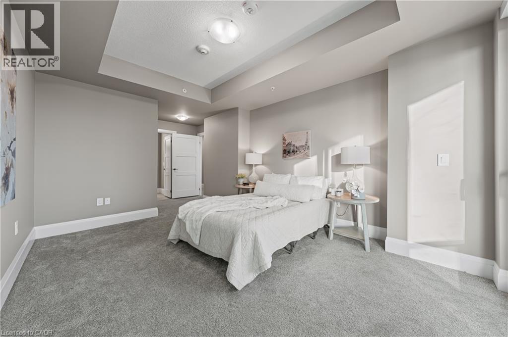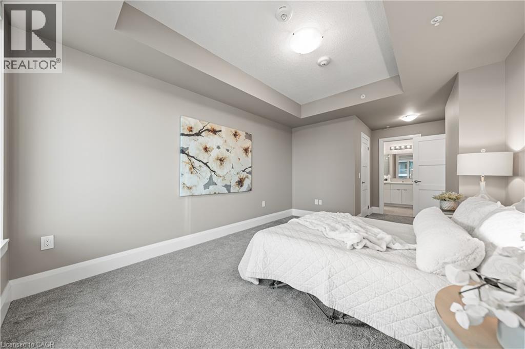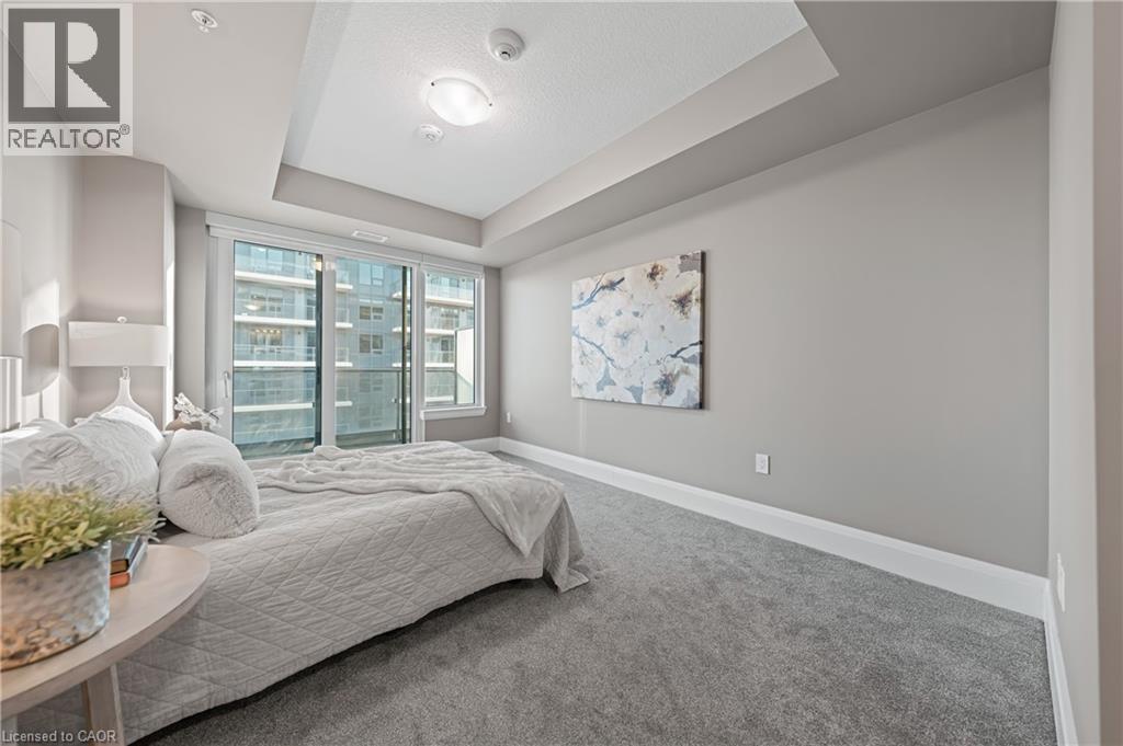 Bedroom with a tray ceiling and carpet floors