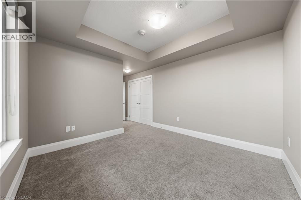 Empty room with a tray ceiling and light carpet