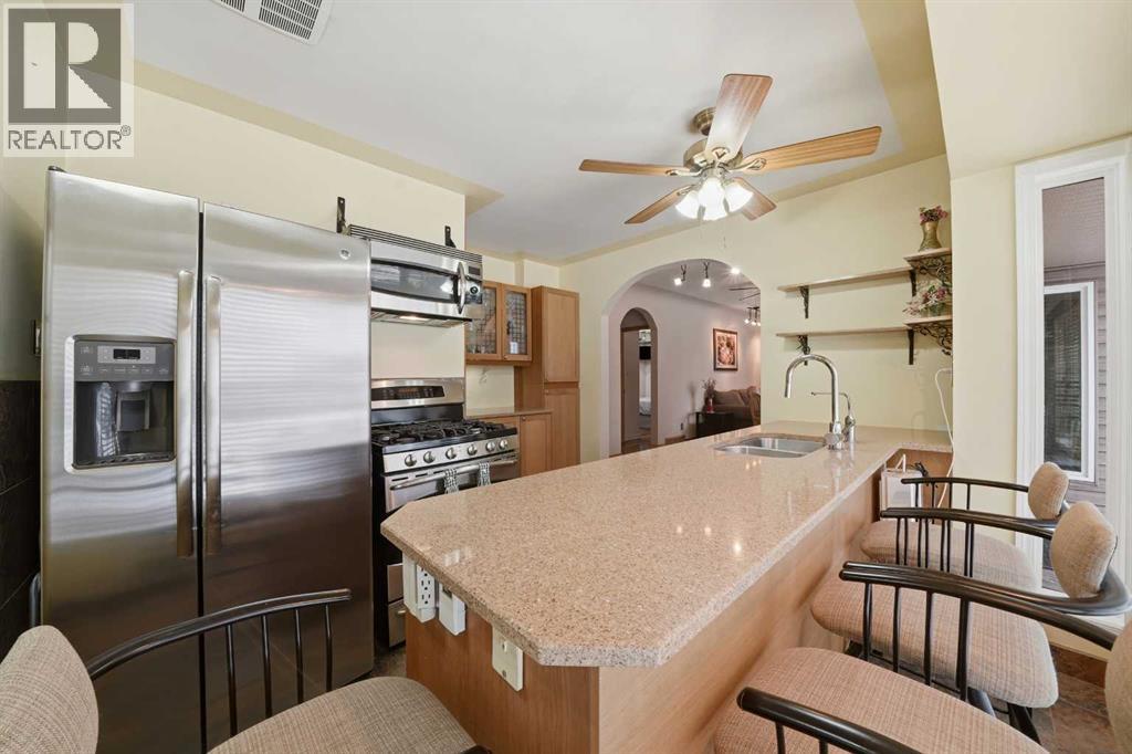 A renovated bungalow in Mountview with a detached double car garage. The curb appeal is accented by the metal roof, vinyl siding with stone accents and large front windows. The entryway greets you to the dining room and living room, which feature hardwood floors and rounded ceilings. Follow through the archway to the bedrooms and bathrooms. The primary bedroom has hardwood floors, a walk in closet, a fan and patio doors out to a composite deck. There is a large 4 piece bathroom with heated tile floors, two large windows, double sinks, a large tub (jets don't work), glass block features, a makeup counter and built in linen cabinets. The second bedroom has hardwood floors as well. The kitchen features heated tile floors, oak cabinets, Corian countertops, pantry style cupboards with pullouts, an eating bar, stainless steel appliances, a gas stove and large windows. The basement has an office (no closet), a family room with vinyl windows a 4 piece tiled bathroom, a laundry room and storage room. There have been upgrades over the years including the siding, the metal roof, the high efficient furnace, hot water on demand, the electrical panel, hardwood floors, triple pane windows, the kitchen and more. The side entrance leads outside to the poured concrete walkway to the stamped concrete patio, mature yard and double car garage that has a side mount garage door opener. (31431479)