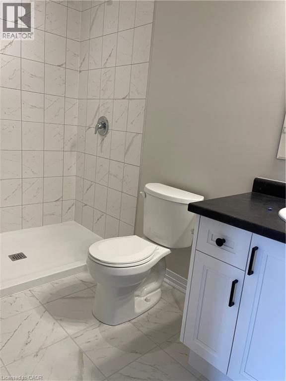 Full bathroom with a tile shower and vanity