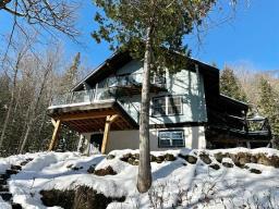 Magnificent and inviting piece-on-piece home featuring a masonry heater at the heart of the living area. It offers 3 bedrooms, a home office, and 2 family rooms. Built in 2000 on a vast lot of over 120,000 sq. ft., it backs onto the Val-Morin--Val-David Regional Park. Enjoy the heated in-ground pool, as well as the public beach at Lac Raymond and the *P'tit Train du Nord* bike path, both within walking distance. (54123862)