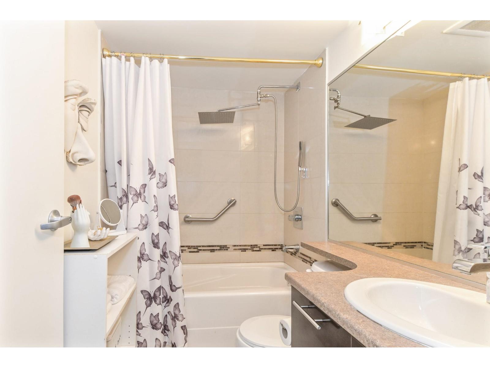 This well-maintained and move-in-ready 1-bedroom plus spacious den condo offers a bright, open-concept layout with a modern kitchen featuring stainless steel appliances, granite countertops, and an extended bar top. The living room is enhanced by a cozy electric fireplace, while the private balcony overlooks the quiet, tree-lined side of the property, creating a peaceful retreat. Located in a pet-friendly and rental-friendly building, the unit includes secure underground parking, a convenient storage locker, and access to a guest suite for visitors. Close to local shops, restaurants, and everyday essentials. With quick access to HWY 1, UFV, Abbotsford Centre, hospital, and public transit, This home combines comfort, convenience, and lifestyle. Don't miss out-book your showing today! (32239564)