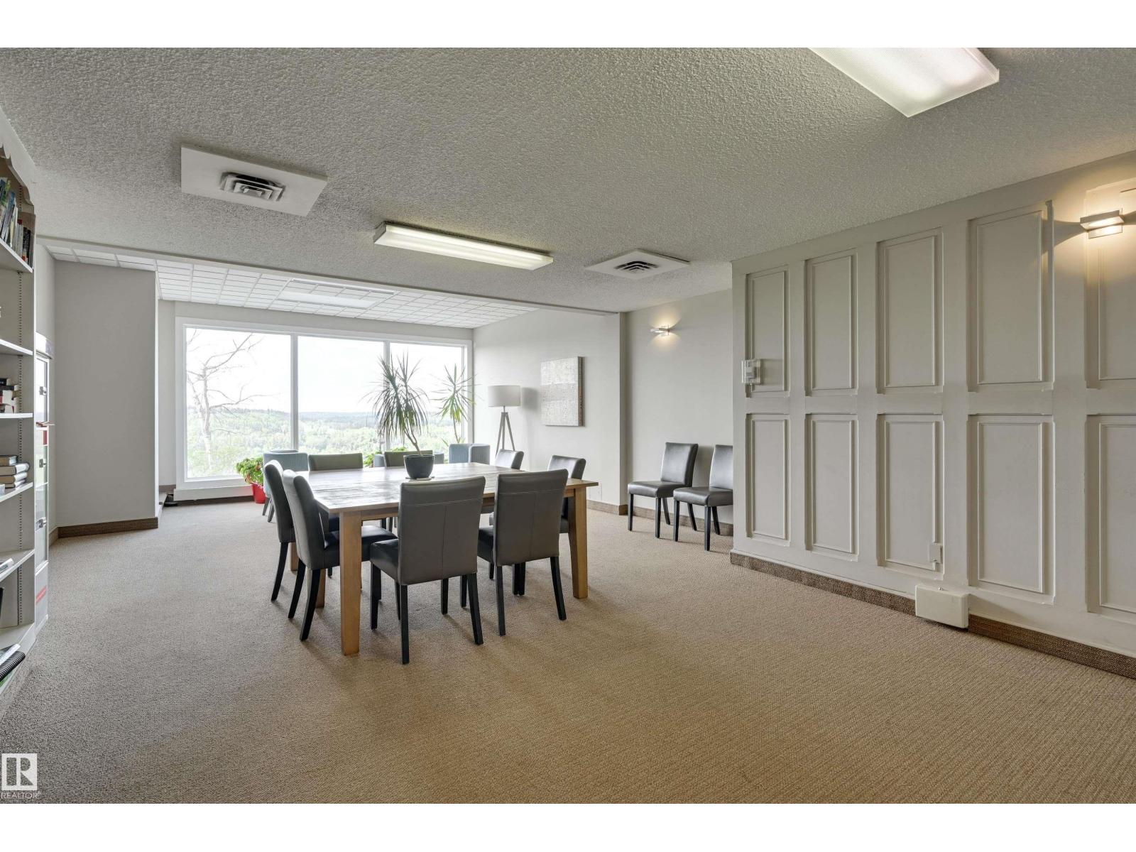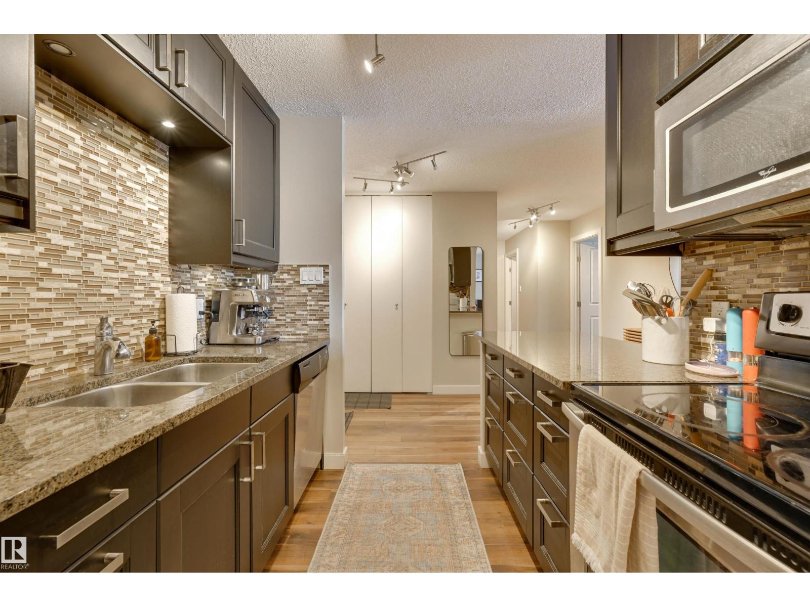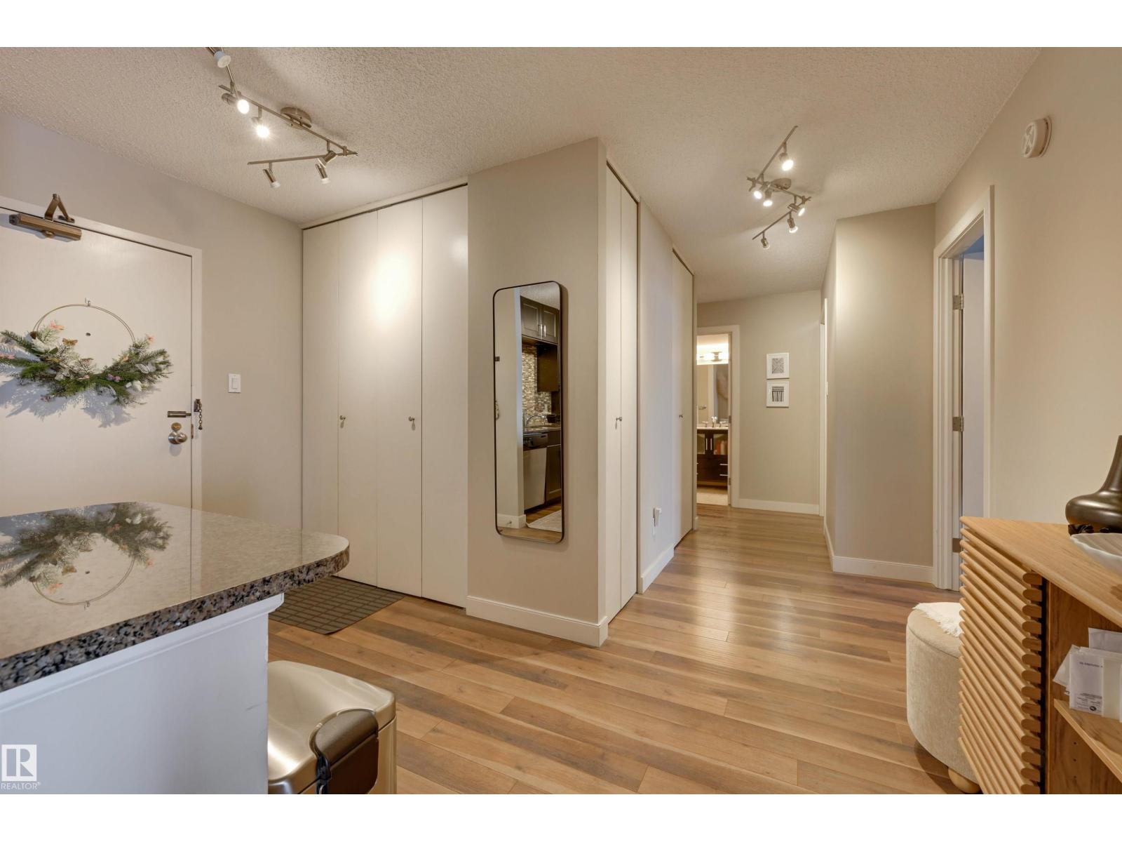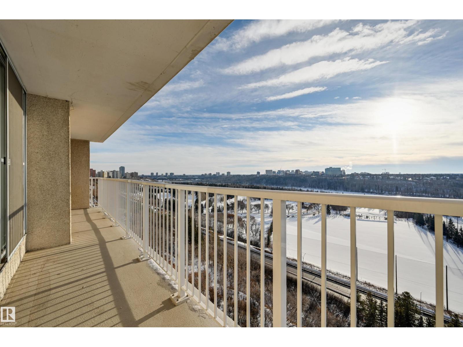 SPECTACULAR RIVER VALLEY VIEW from every window in this BRIGHT, COMPLETELY RENOVATED 1126 sq.ft. 2 bedroom 1.5 bathroom condo in TOP OF THE VALLEY conveniently located with transportation at your doorstep, close to unique shops, restaurants, coffee shops, Art Galleries, the Brewery District, the river valley walking/biking trails & quick access to the U of A. Spacious living room overlooking the river & access to the sunny south facing balcony. The gourmet kitchen is open to the living area with espresso color cabinetry, granite countertops, S/S appliances. The dining room has built-in cabinets. The primary suite is complete with a walk-in closet & a 2 piece bathroom. Spacious 2nd bedroom & a 4 piece bathroom with tile tub surround, new vanity & toilet. Laminate flooring throughout except for tile in the bathrooms. Large storage room. The condo fees include heat, water, power, laundry & underground parking. The building features a completely remodelled exercise room & lobby. Shows very well! (33636854)