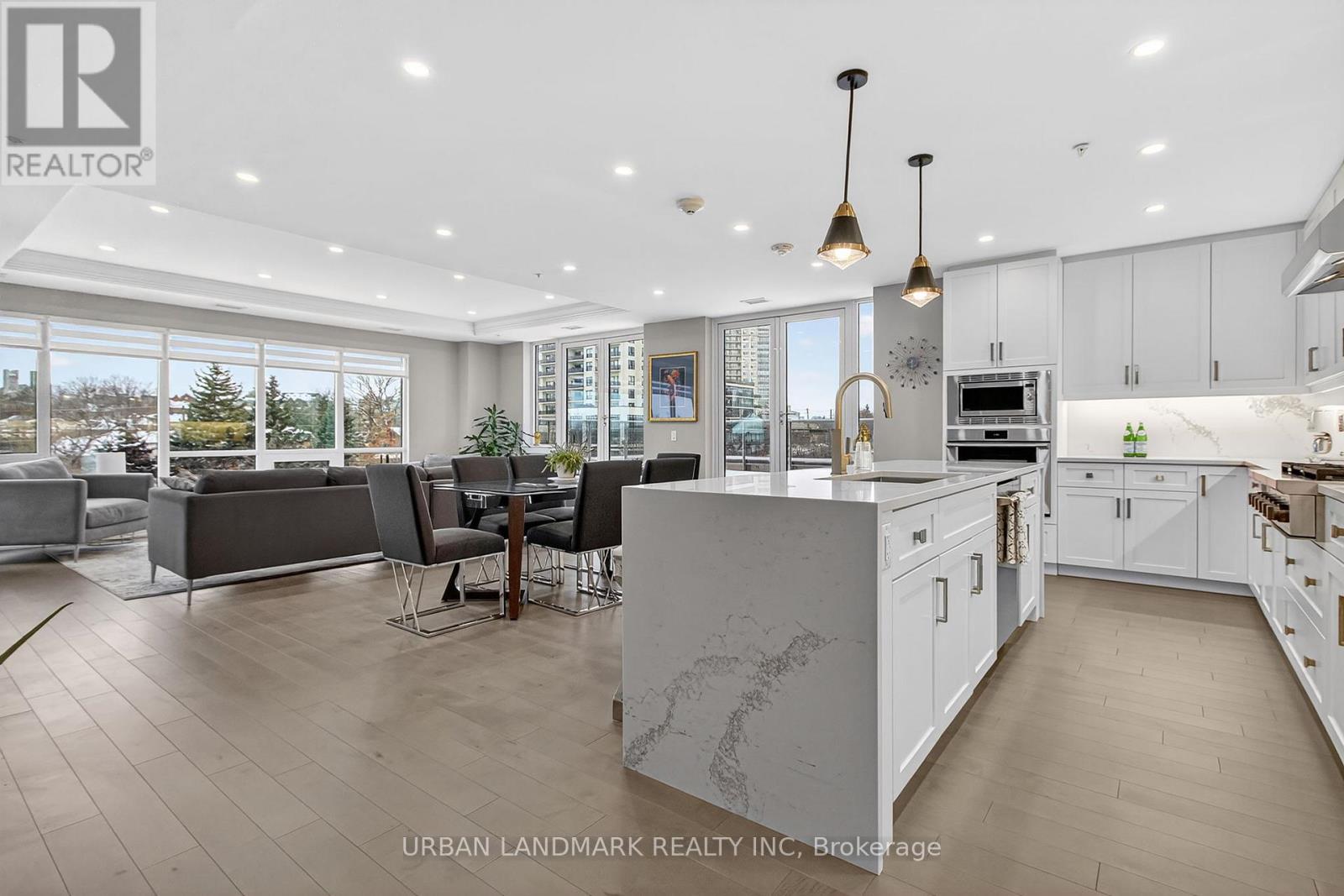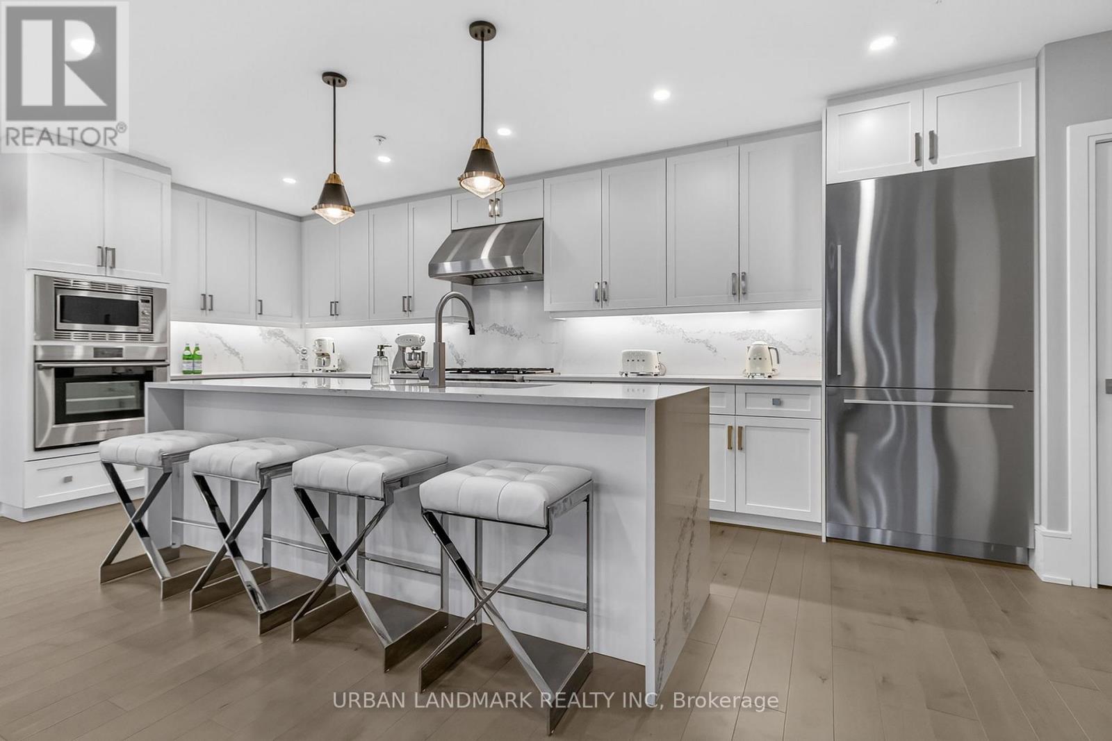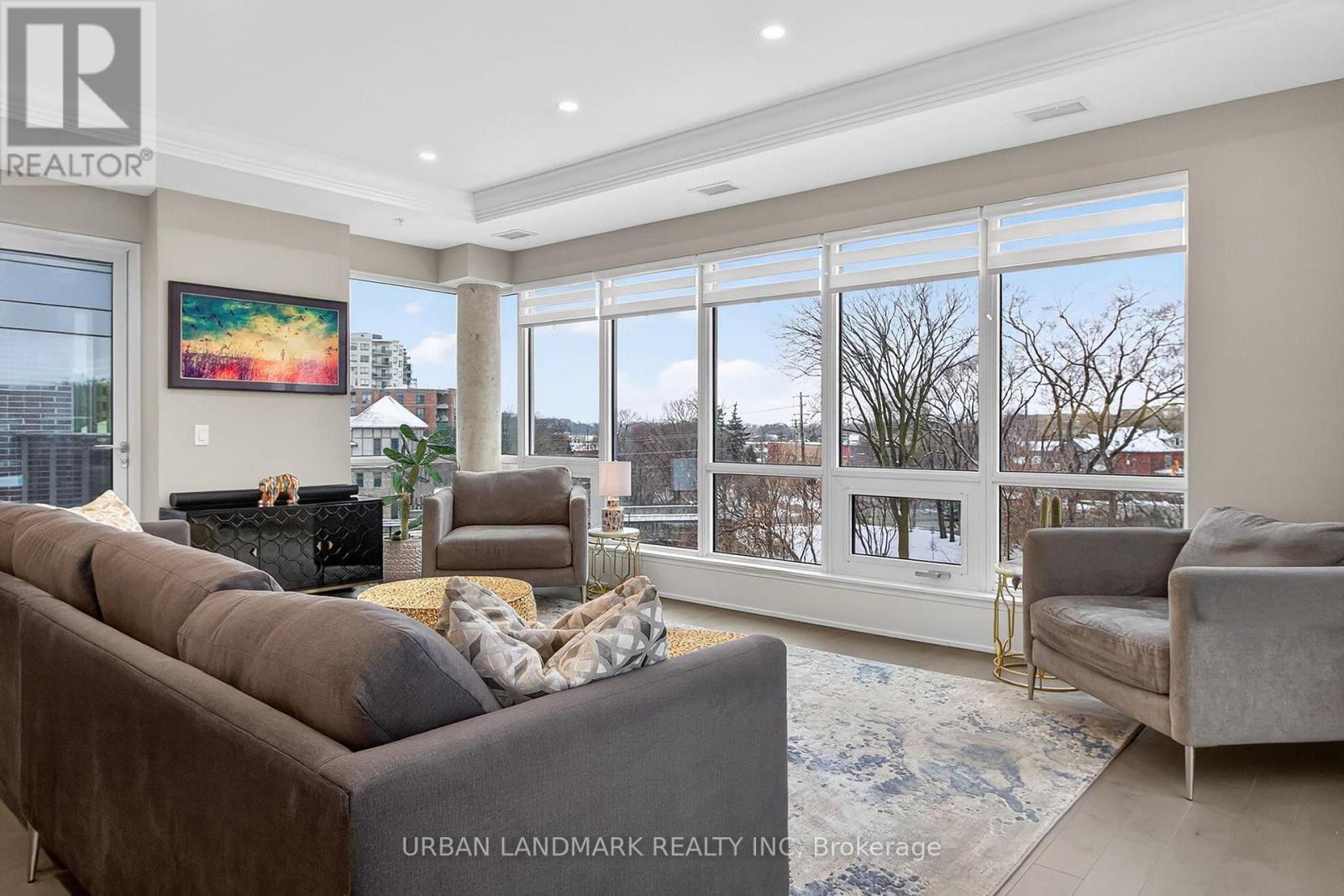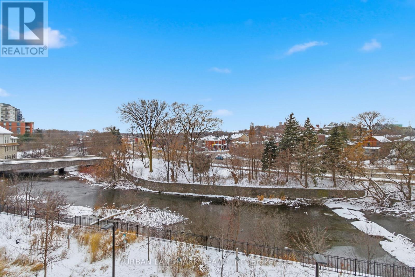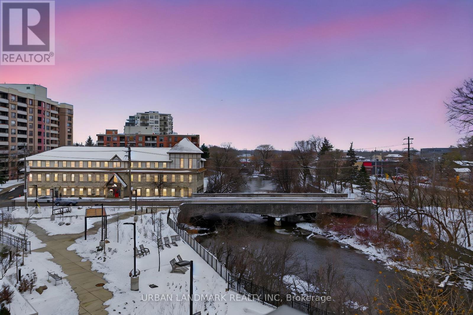 The most coveted River Residence in the entire development is now available for sale. This premier suite offers 3,138 square feet of refined living, including 1,090 square feet of terraces with 110 feet of uninterrupted river and city views. The expansive west-facing windows frame breathtaking sunsets every evening, turning the sky into a daily masterpiece of color and light. The entry sets the tone immediately. Coffered ceilings define an impressive foyer and introduce the level of craftsmanship carried throughout the home. The living room is expansive and bright, framed by oversized windows and anchored by a Dimplex Electric fireplace-an elevated space designed for both quiet evenings and sophisticated entertaining.The kitchen is a true gourmet workspace, equipped with Fisher & Paykel stainless steel appliances, a 6-burner gas rangetop, wall-mount oven, fridge, built in microwave, washer and dryer, quartz countertops, shaker cabinetry, and a waterfall island. Every detail supports both function and style.The primary ensuite delivers a spa-grade experience: a deep soaker tub, double sinks, premium fixtures, and a mosaic shower floor. Additional upgrades include a Samsung stacked washer/dryer, Panasonic microwave, recessed lighting in principal rooms, brushed-nickel hardware, and 5-inch-wide maple grey flooring.Two expansive terraces extend your living space outdoors, providing a private front-row view of the river-ideal for morning coffee, evening cocktails, or larger-scale entertaining.Practical advantages include three parking spaces, two heated storage lockers, and full access to Metalworks' exclusive amenities, including the private speakeasy. Location advantages: 10-minute walk or 3-minute drive to the GO Station 15 minutes to Highway 401 5-minute drive to the University of Guelph 1 hour to Pearson Airport. (41777163)