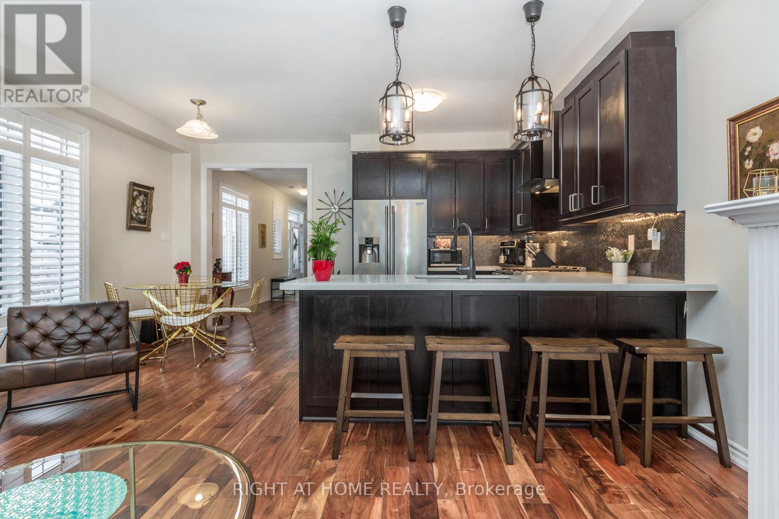 Welcome to 102 Upper Canada Court, located in the highly desirable Enclaves of Upper Canada, one of Georgetown's most sought-after neighborhoods. This rare 4-bedroom, 4-bathroom end-unit semi-link home offers space, beautiful upgrades, and pride of ownership from the original owners. The professionally finished exposed aggregate concrete provides parking for an additional vehicle and leads you to a beautifully landscaped front and back yard, complete with a large patio, deck, gazebo, and perimeter plantings. Inside, this carpet-free home features hand-scraped walnut floors on both the ground and second levels, along with California shutters and an abundance of natural light throughout. The upgraded kitchen boasts quartz countertops, stainless steel Frigidaire appliances, and a breakfast bar for four, opening to the bright living room with a cozy gas fireplace and walkout to the deck. A breakfast area, spacious separate dining room, and convenient powder room complete the ground floor. Upstairs, retreat to your large primary bedroom with two closets and a 4-piece ensuite. Three additional well-sized bedrooms with closets and a second 3-piece bath complete the upper level which provide plenty of room for the whole family - a rare find in Georgetown townhomes. The finished basement expands your living space with a large family room, 3-piece bath, separate laundry room, three storage closets, and a cold cellar. Perfectly located close to schools, parks, and shopping. Walking distance to trails! Book your showing - this home has everything you need. Your next chapter starts here. (41778812)