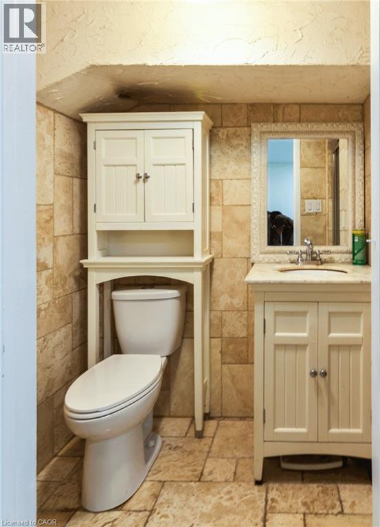 Half bathroom featuring stone tile floors and vanity