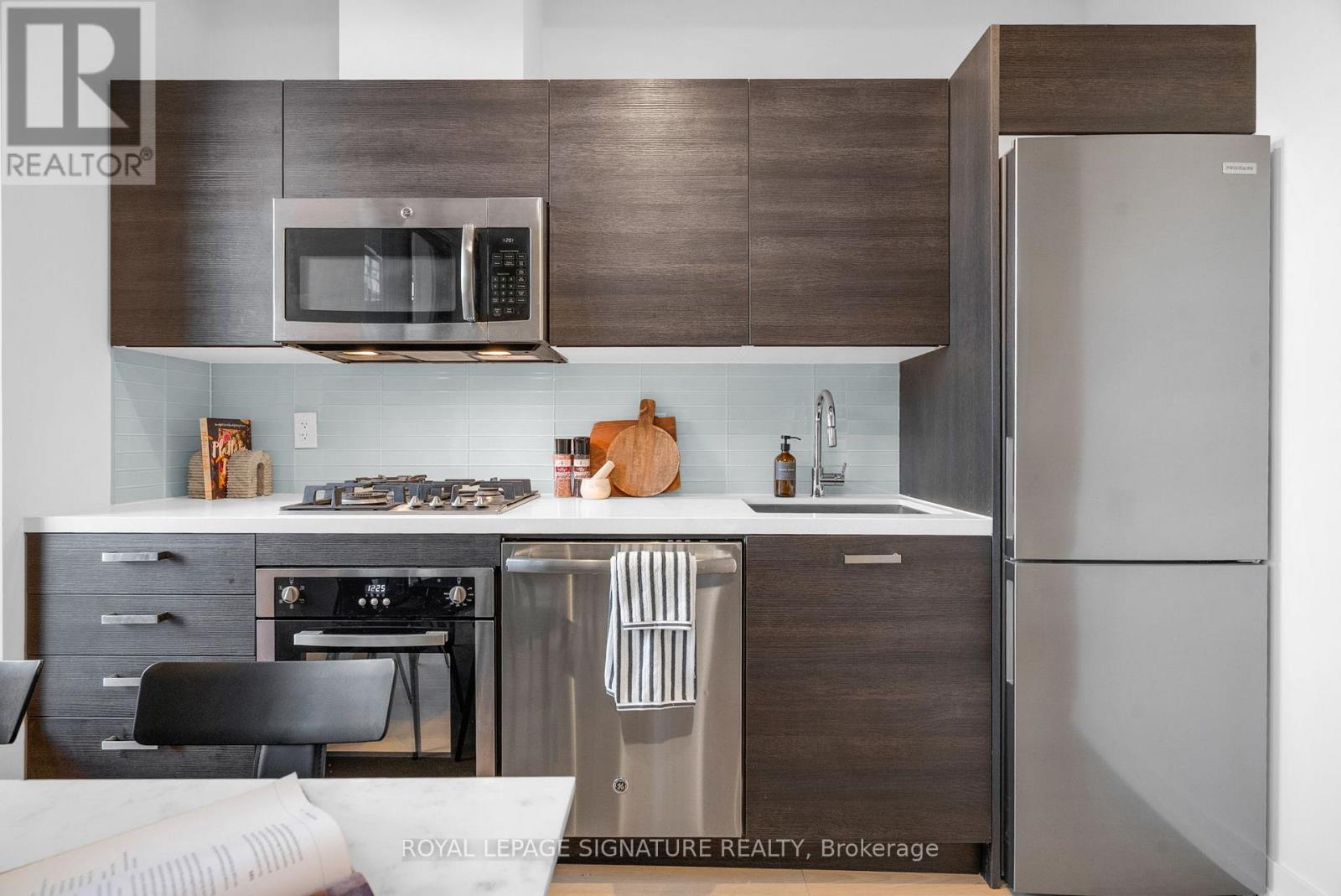 Welcome to King Charlotte, where sleek design meets unbeatable downtown living. This bright and stylish one-bedroom suite features soaring 9.5 ft ceilings, expansive floor-to-ceiling windows, and signature exposed concrete that brings true loft-style character to the space. The open-concept layout is enhanced with hardwood floors, a modern quartz kitchen with gas cooktop, stainless steel appliances, custom lighting, upgraded window coverings, and convenient in-suite laundry.Step outside to a large balcony with a gas hookup-BBQ included-offering the perfect spot to relax or entertain. The building's sought-after amenities include a show-stopping rooftop pool, a well-equipped gym, party room, and 24-hour concierge. Located on a quiet stretch just off King Street, you're moments from the city's best restaurants, nightlife, cafés, and multiple transit lines. This move-in-ready home also comes with two rare, side-by-side lockers, giving you all the storage you'll ever need. A standout opportunity in one of Toronto's most iconic boutique condos. (41786503)
