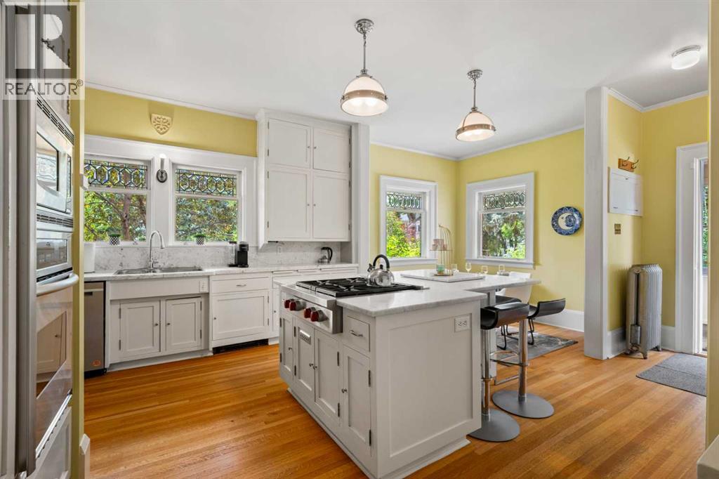Situated in the heart of Calgary’s renowned Cliff Bungalow neighborhood, combines historic charm with modern comfort and unbeatable convenience. Explore vibrant restaurants, cafés, boutique shops, and the lively energy of 4th Street and 17th Avenue, while scenic river pathways, downtown amenities, and everyday conveniences are all just steps away. The home is also just a short walk from Western Canada High School, one of the city’s top public schools offering the International Baccalaureate (IB) program, —making location one of the home’s greatest highlights. This rare 5-bedroom home with 10ft ceilings features thoughtful upgrades, including a fully refreshed wrap-around verandah with new wood flooring, updated venting pipes, refinished kitchen taps, basement has in floor heating, a mostly new hot water tank, new basement flooring. The boiler has been replaced with an efficient model. and a new cedar shake roof was installed in 2019 at a cost of over $60,000, All old knob-and-tube wiring has been removed and replaced with modern electrical systems and a steam shower for added modern comfort . All original main-floor woodwork has been carefully cleaned and refinished with high-gloss varnish, preserving its historic integrity. Each room features individual thermal control, with a total of 8 thermostat-controlled zones throughout the house, ensuring personalized comfort in every space. Over $200,000 in renovations give this cherished historic home a renewed appearance that honors its heritage while offering modern functionality and comfort.Inside, the home opens to a grand oak-clad hallway and a flowing floor plan highlighted by original quarter-sawn oak millwork, built-in cabinetry, and beveled-glass windows that showcase the craftsmanship of the period. The dining room leads to a sunroom with leaded glass windows, while the kitchen is equipped with floor-to-ceiling built-ins and a functional dumbwaiter. The grand living room features a striking fireplace, and th e master suite offers a luxurious soaking tub. Dedicated leisure spaces include a poker room and a lower-level recreation area with ping pong and pool tables, a wet bar, and lounge space. Historic elegance, modern comfort, and an unbeatable location—all in one home. (31447904)