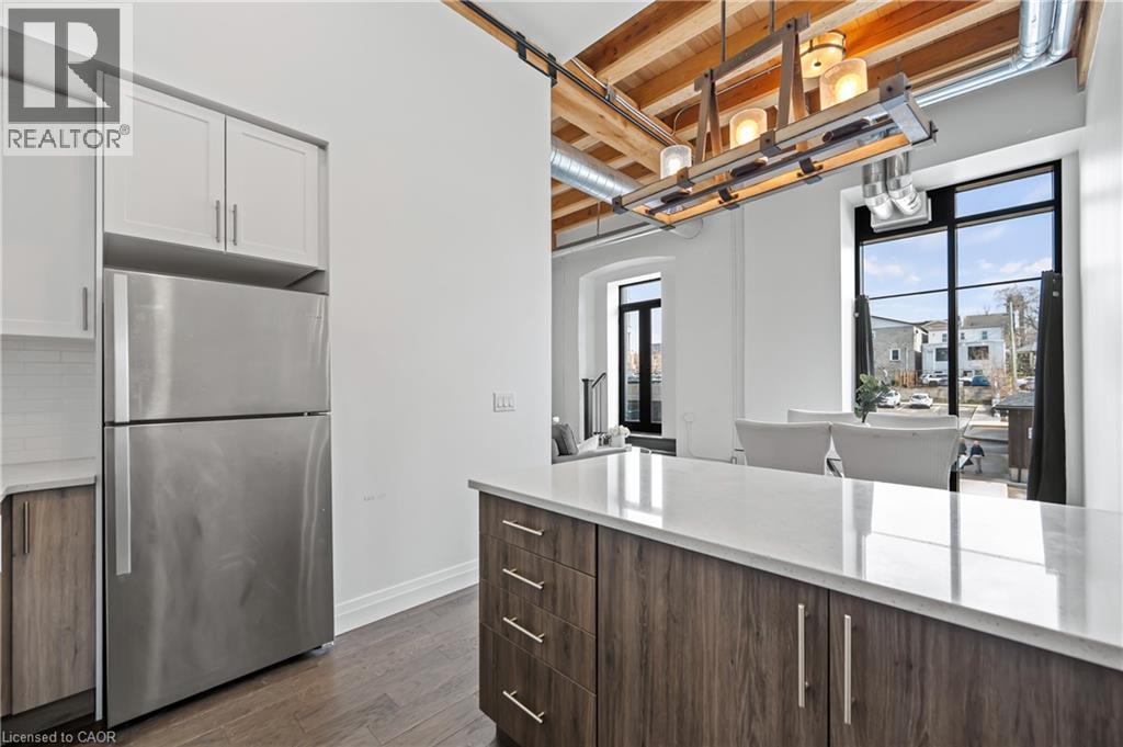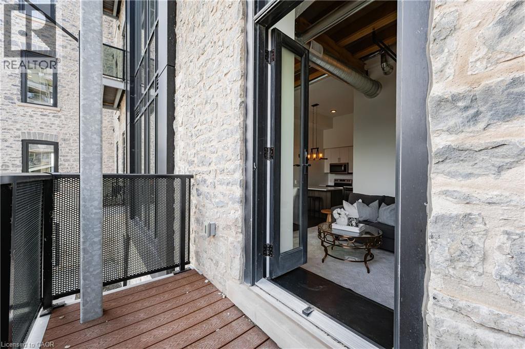 Experience the perfect blend of industrial charm and modern comfort at Riverbank Lofts! This stunning one-bedroom, one-bathroom condo is set in a beautifully repurposed former American Standard factory, transformed into contemporary residences in 2020. Nestled alongside the scenic Speed River and just steps from downtown Hespeler, you’ll enjoy easy access to local shops, trails, and vibrant community amenities. Step inside to soaring 12-foot ceilings, expansive windows that flood the space with natural light, and striking exposed stone walls and reclaimed wood beams that add unique character throughout. The stylish kitchen features quartz countertops, stainless steel appliances, and a spacious island—perfect for entertaining or casual dining. Open the patio doors to your own private balcony with captivating views of downtown. The bedroom offers a generous walk-in closet, providing ample storage. Additional conveniences include in-suite laundry, one dedicated parking space, and access to premium building amenities: a fitness centre, bike storage room, dog washing station, and a private lounge for hosting guests. With quick access to Highway 401, shopping, and public transit, Riverbank Lofts offers an unparalleled lifestyle in a truly distinctive setting. Don’t miss your chance to own a piece of Hespeler’s history—book your private showing today! (69969979)
