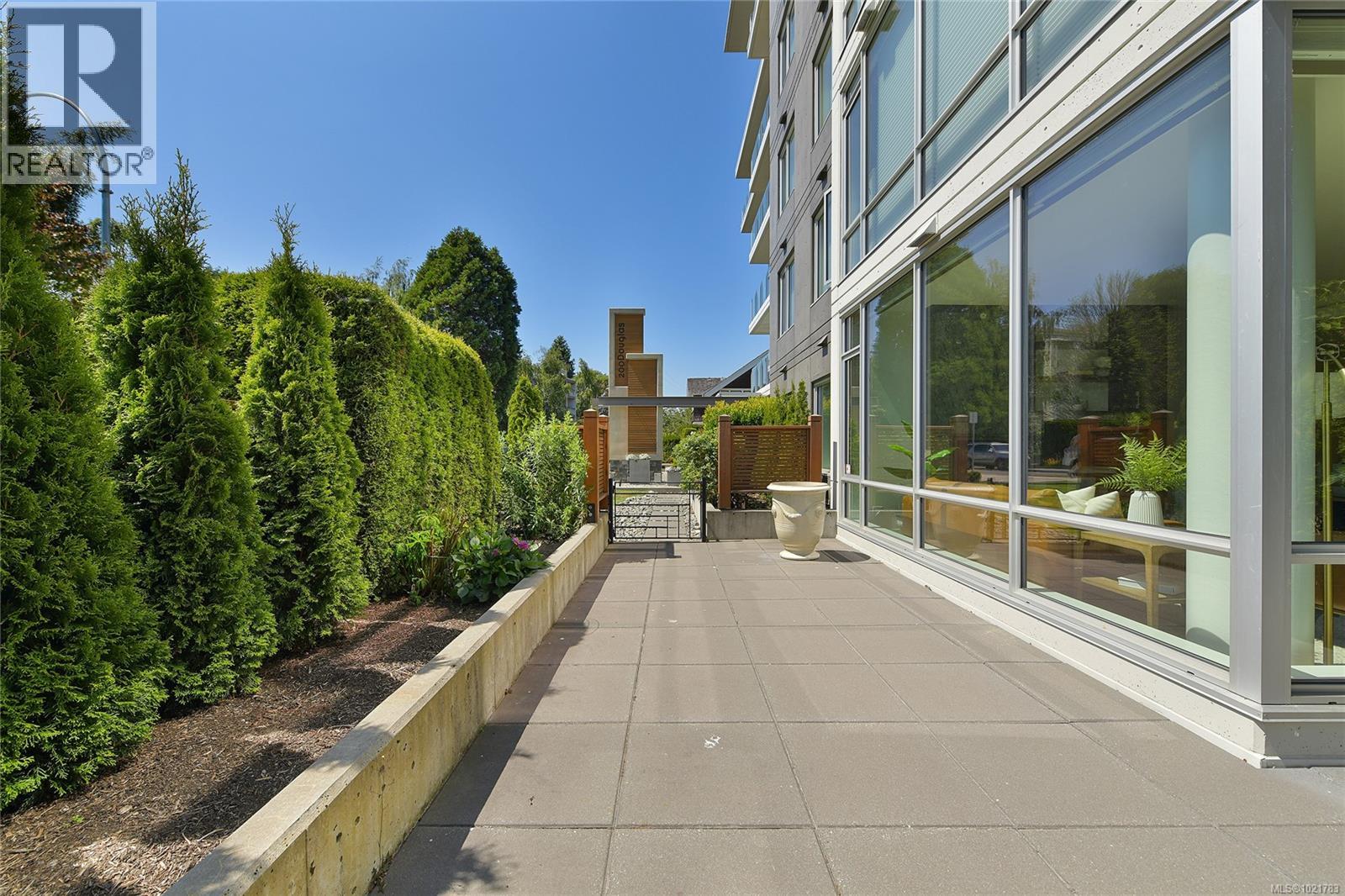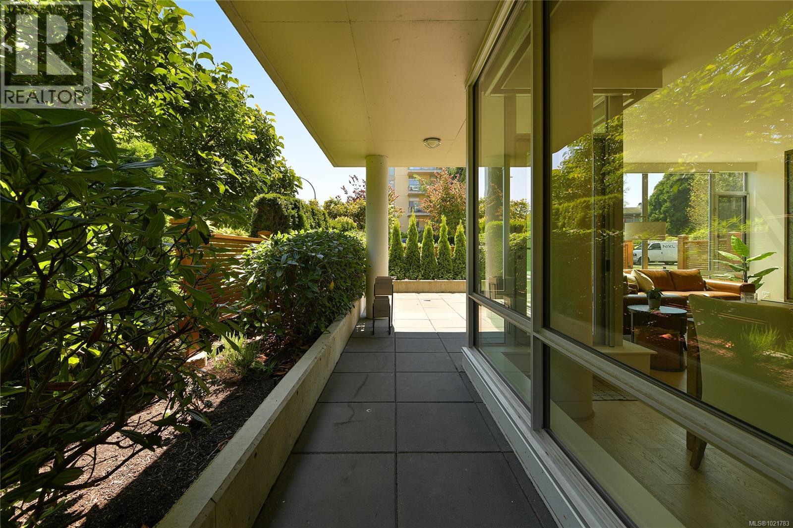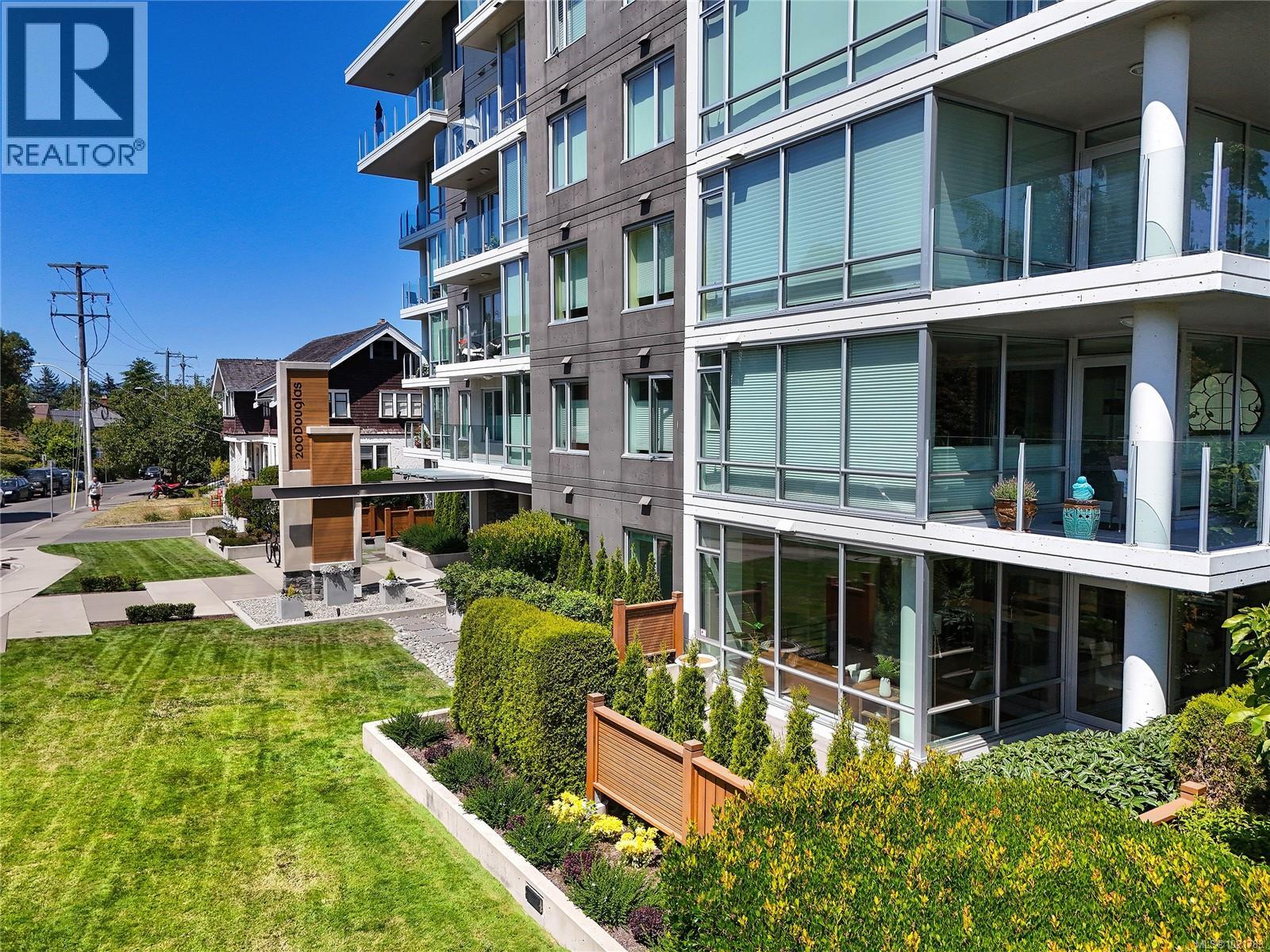 Superb patio home perfectly located across the street from Beacon Hill Park and a short stroll to Victoria's scenic marine drive, Dallas Road. ''200 Douglas on the Park'' is a modern steel and concrete building and this home offers 2 bedrooms plus den/office with open floorplan living room and kitchen and dining plus floor to ceiling windows and 1400 square feet of space for the ultimate in parkside/boardwalk living! Ideal for pet owners or gardeners with its own huge patio area. Sophisticated design and finishing make this a special home within walking distance to the Inner Harbour, downtown Victoria, James Bay and Fairfield villages. (30199340)