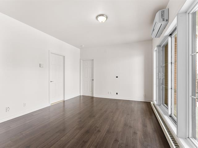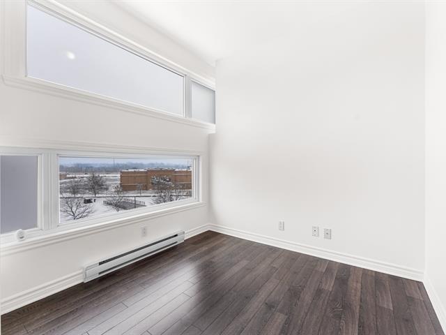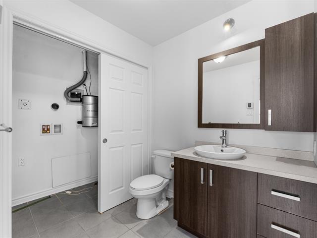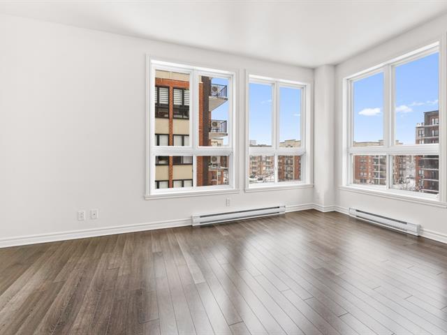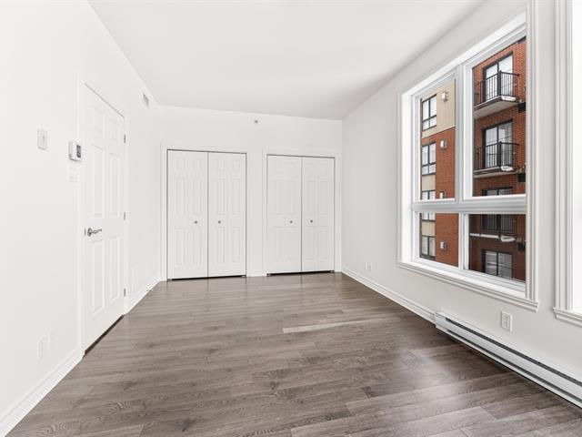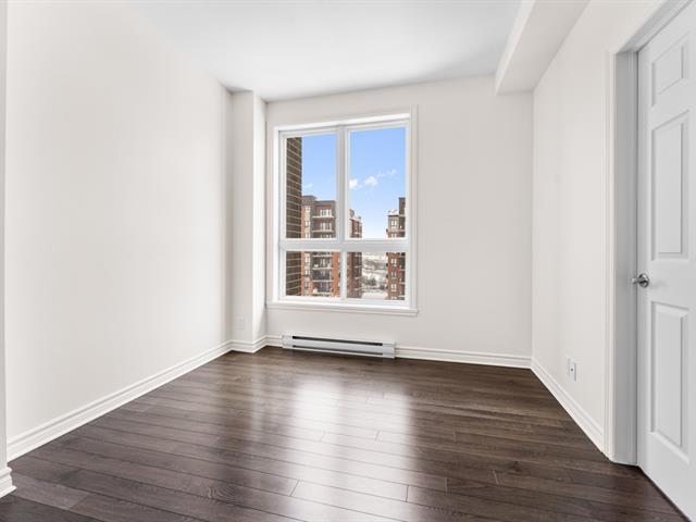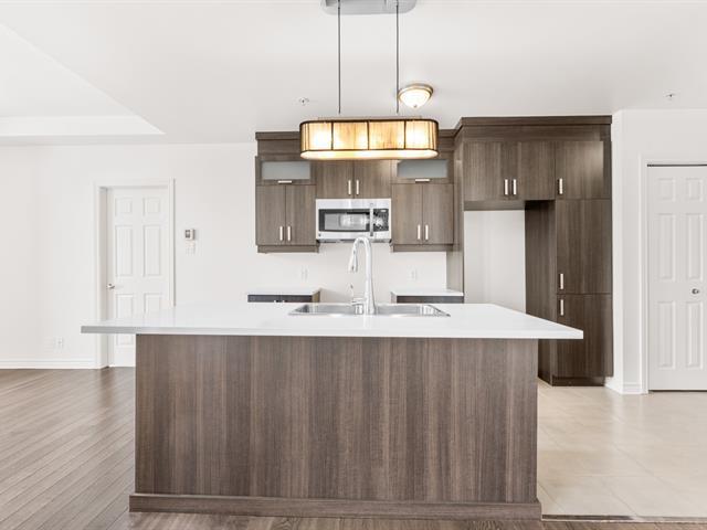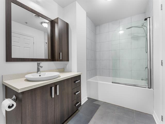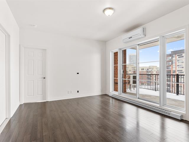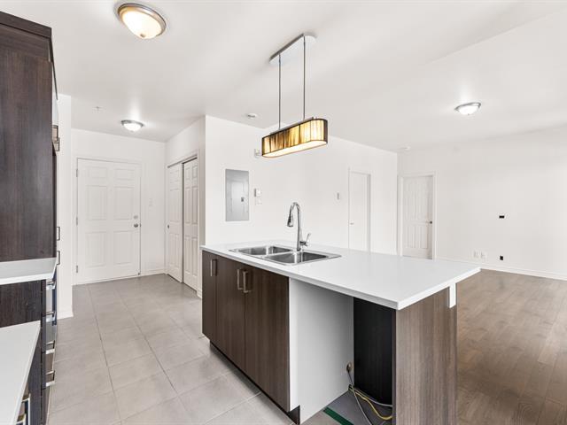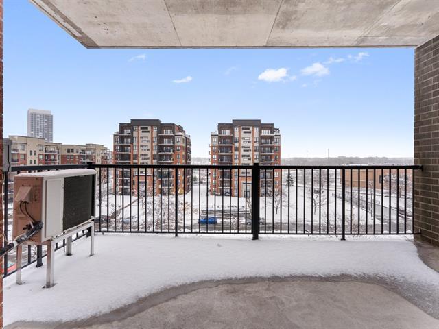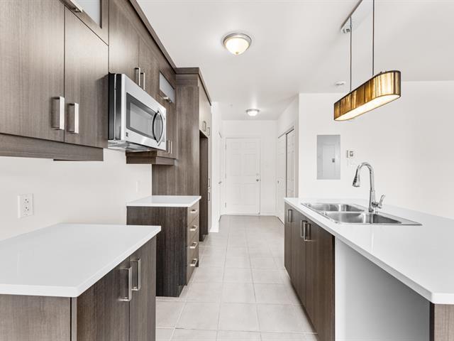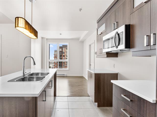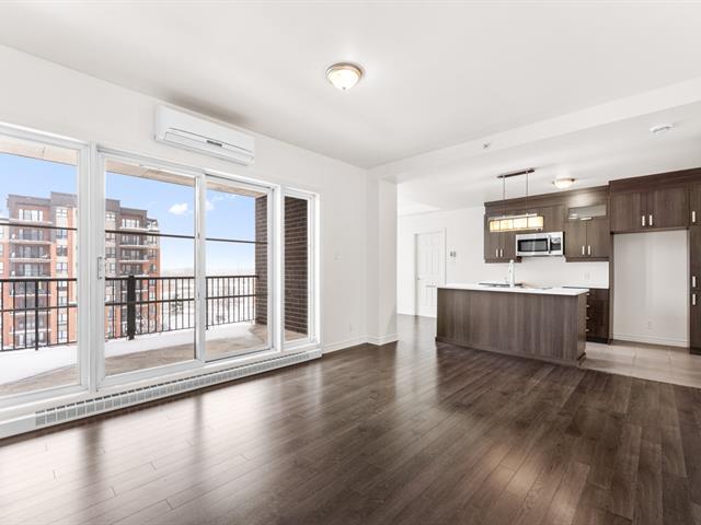 LOCATION, LIBRE IMMÉDIATEMENT. Au 5e étage, magnifique condo 4-1/2 concept à aire ouverte, avec 2 CAC de bonnes dimensions. Hall d'entrée avec garde-robe double & garde-manger double, cuisine avec armoires pleine hauteur & îlot central et comptoir de quartz, salle à manger avec grande fenestration, salon de bonne dimension. SDB avec vanité de mélamine, bain-douche avec porte vitrée, et installation de laveuse-sécheuse. Porte patio menant à la terrasse de 16'x9'8 (avec sortie de gaz pour le BBQ). Espace de rangement & garage intérieur (espace avec borne de recharge pour voiture électrique). Construction de qualité supérieure. (46983011)
