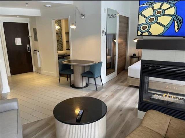 Beautiful garden-side unit at the stunning Estérel Resort -- Évolution Complex. This unique concept in the Laurentians offers you a guaranteed monthly income. Enjoy a peaceful setting with a relaxing garden view. This luxurious suite is fully equipped: high ceilings, a complete kitchenette, double-sided fireplace, two televisions, a bathroom with a separate shower, and a private 13' x 10' balcony. The entire unit was renovated in 2021 (furniture, accessories, flooring, etc.). An ideal opportunity for an investor seeking additional revenue while enjoying year-round access with family members. GST/QST must be added to the asking price (51241778)