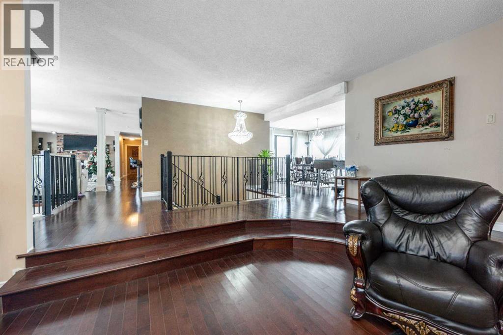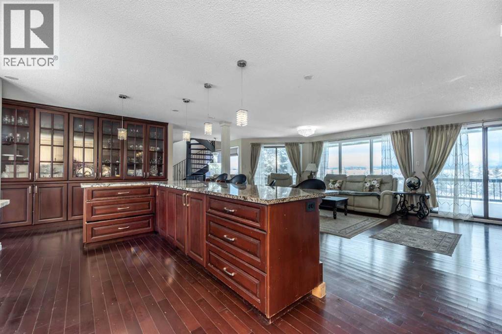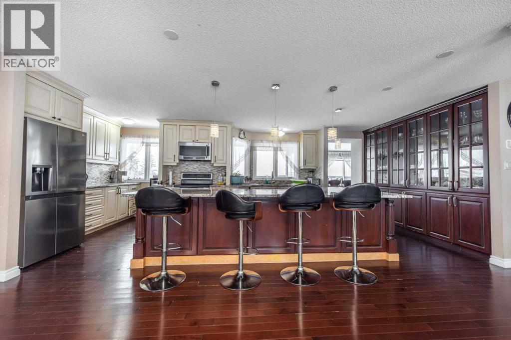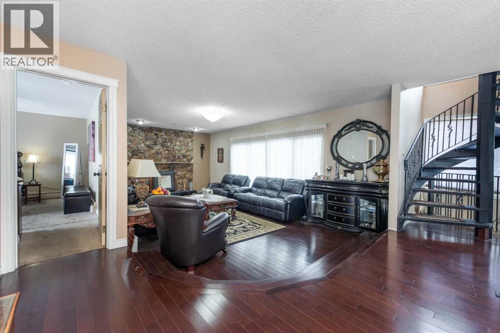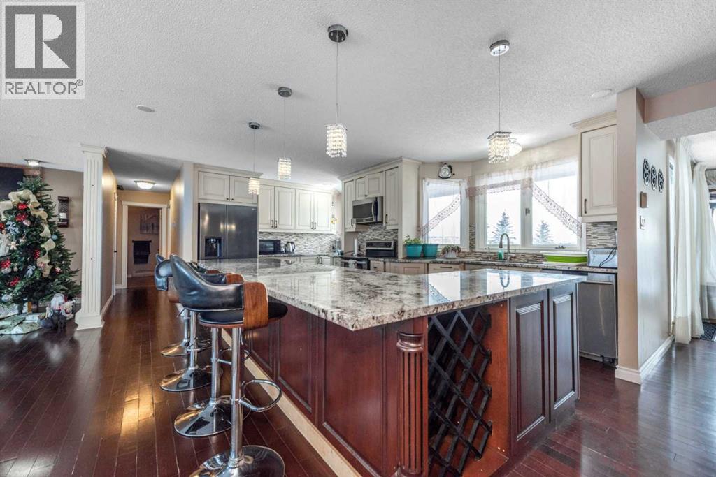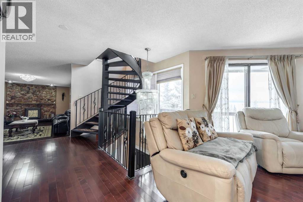 Rare opportunity in sought-after North Springbank! Nearly 4 acres perched on a picturesque knoll with 360° mountain, valley, and city views. This peaceful, private acreage offers gently rolling, fenced land—ideal for families, hobbyists, anyone seeking space, or the perfect lot to build your dream home—all just minutes from the upcoming Bingham Crossing Mall, new Costco, top schools, Springbank Airport, and Springbank Links Golf Course. This reversed walkout, lofted hillside bungalow features a bright open layout, a sunken living room with brick fireplace, formal dining room, spacious kitchen with island, large family room with second fireplace, and 3 bedrooms on the main level. A unique upper office loft accessed by a circular staircase adds extra versatility. Enjoy the massive partially covered west-facing deck plus an additional east deck and balcony. A 3-car heated attached garage with covered carports provides ample parking, along with room for RVs and equipment. The 40’x47’ metal Quonset, offers excellent workshop, storage, or hobby use. This is a prime Springbank location offering quiet country living with outstanding convenience and exceptional long-term potential. (31454517)