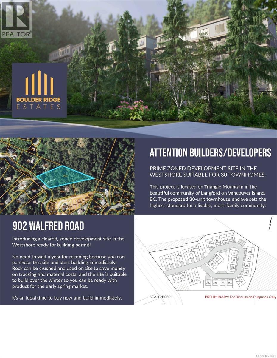 All on site servicing included in the price, buyer will only have to do the final road surface Prime Development Opportunity in Langford BC .Exceptional site approved for a visionary 30-unit townhouse project, prepped for development now, for an innovative residential community. Design and plans have received unanimous approval from Langford's City Council and Mayor, showcasing strong support for development. The approved project focuses on sustainability and community, electric bike charging stations, community garden beds, and a scenic wooded trail system that offers breathtaking views. Residents will benefit from thoughtfully designed outdoor spaces that promote a community-oriented lifestyle, blending modern living with environmental consciousness. Perfect for developers dedicated to making a lasting impact. Construction can start immediately. (30202544)