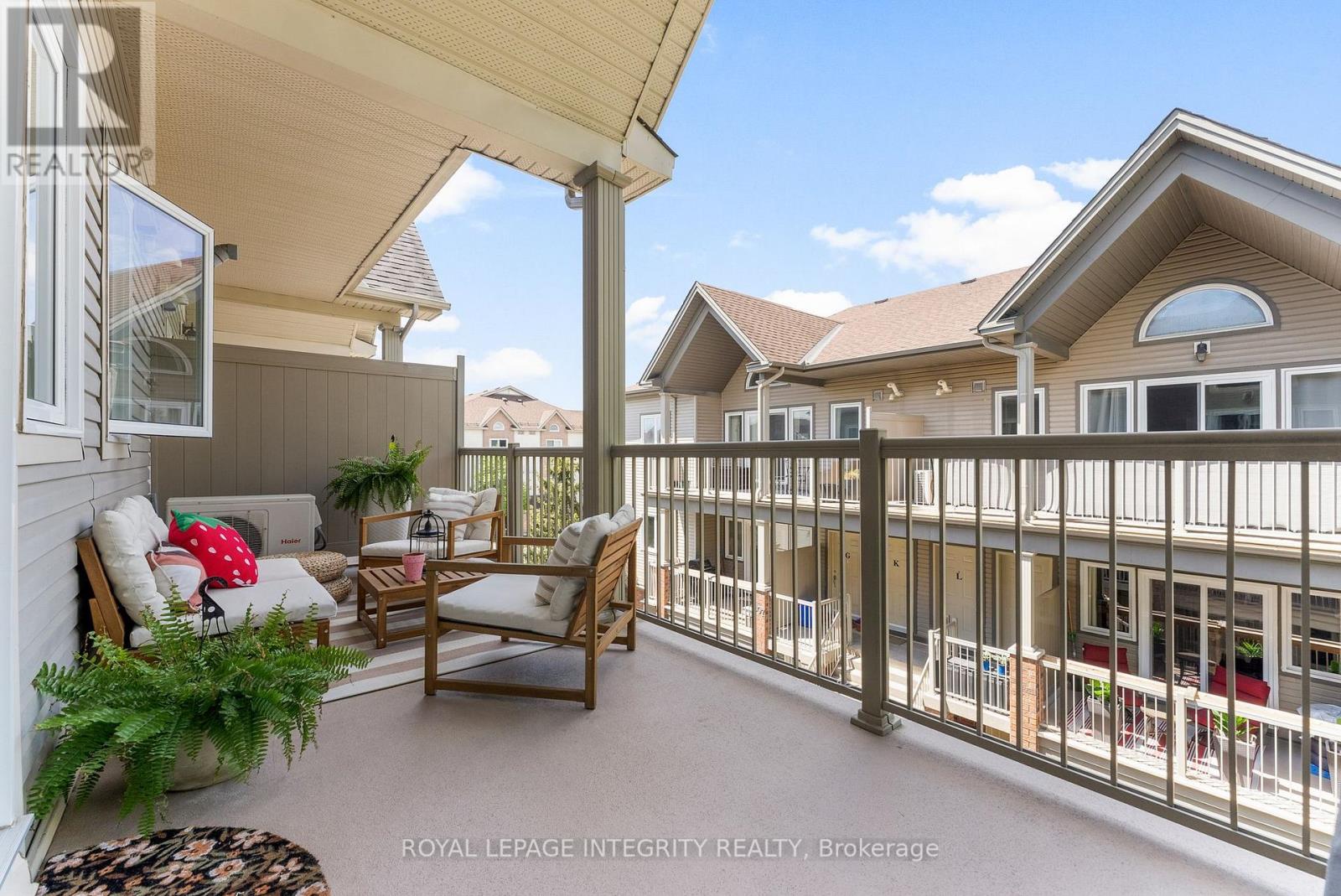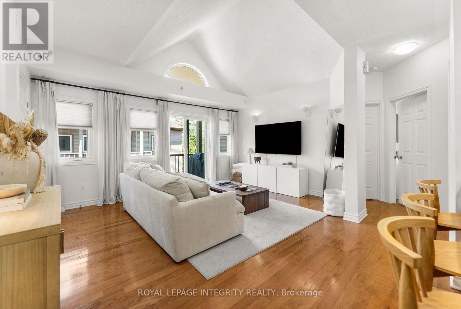 Welcome to carefree condo living in the highly sought-after community of Jackson Trails! This beautifully maintained upper unit is flooded with natural light thanks to its abundance of windows and soaring vaulted ceilings. With no rear neighbours and views of the trees, it offers a peaceful retreat just steps from all the amenities you need. The open-concept living and dining area features a full wall of windows, creating an airy, sun-filled space perfect for relaxing or entertaining. Rich hardwood flooring flows throughout the main living areas and both bedrooms, adding warmth and elegance. The kitchen is both stylish and functional, with stainless steel appliances, a sleek glass tile backsplash, a breakfast bar for casual dining, and convenient in-unit laundry access. The primary bedroom is a serene escape with a generous walk-in closet and a patio door that opens to tranquil treetop views, no rear neighbours to disturb your privacy. The second bedroom is also a great size, making it ideal for guests, a home office, or a cozy retreat. The large main bathroom offers both comfort and style, featuring a separate soaker tub and a walk-in shower. Off the living room, step out onto your private balcony, the perfect spot for morning coffee or evening unwinding. Located just minutes from shopping, restaurants, banking, schools, and transit, this home offers the best of both comfort and convenience. Whether you're a first-time buyer, downsizer, or investor, this bright and spacious unit checks all the boxes. Don't miss this opportunity to own in one of Stittsville's most popular neighbourhoods! (41810143)