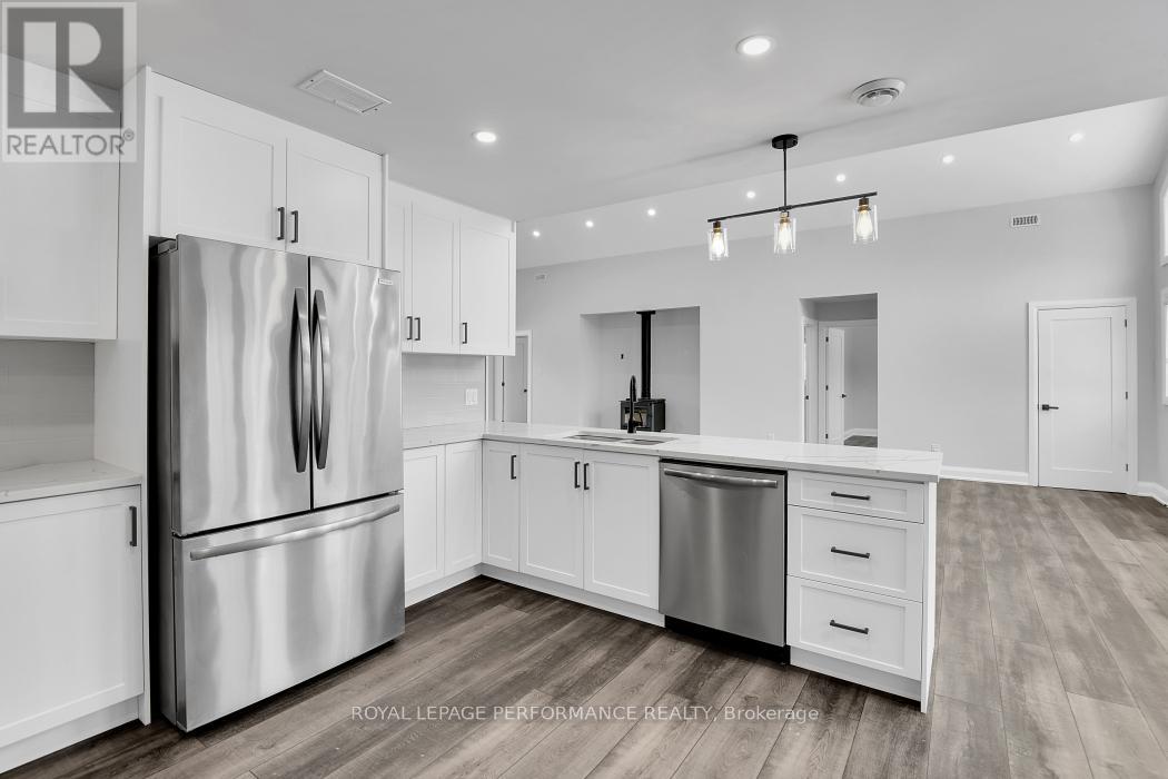 Bright, Custom-Built Bungalow in a Peaceful Country Setting. Enjoy the best of country living just minutes from all the amenities of Kanata and Carp Village. This beautifully crafted, one-level bungalow is filled with natural light and surrounded by nature offering both privacy and convenience. Step into a spacious great room with hardwood flooring, radiant heat, a cozy wood stove, and walk-out access to a large west-facing deck perfect for relaxing and enjoying spectacular sunsets. The kitchen features granite countertops, included appliances, and is conveniently located next to the laundry area. An oversized double garage with inside entry makes unloading groceries effortless. The thoughtful layout includes a private primary bedroom with a 3-piece ensuite, while two additional bedrooms share a full 4-piece bath (double sinks) ideal for family or guests. A large utility room, off the garage, offers easy access to mechanical systems and extra storage for your outdoor gear. Open House Sunday Jan 25th 1-3 p.m. (41820634)