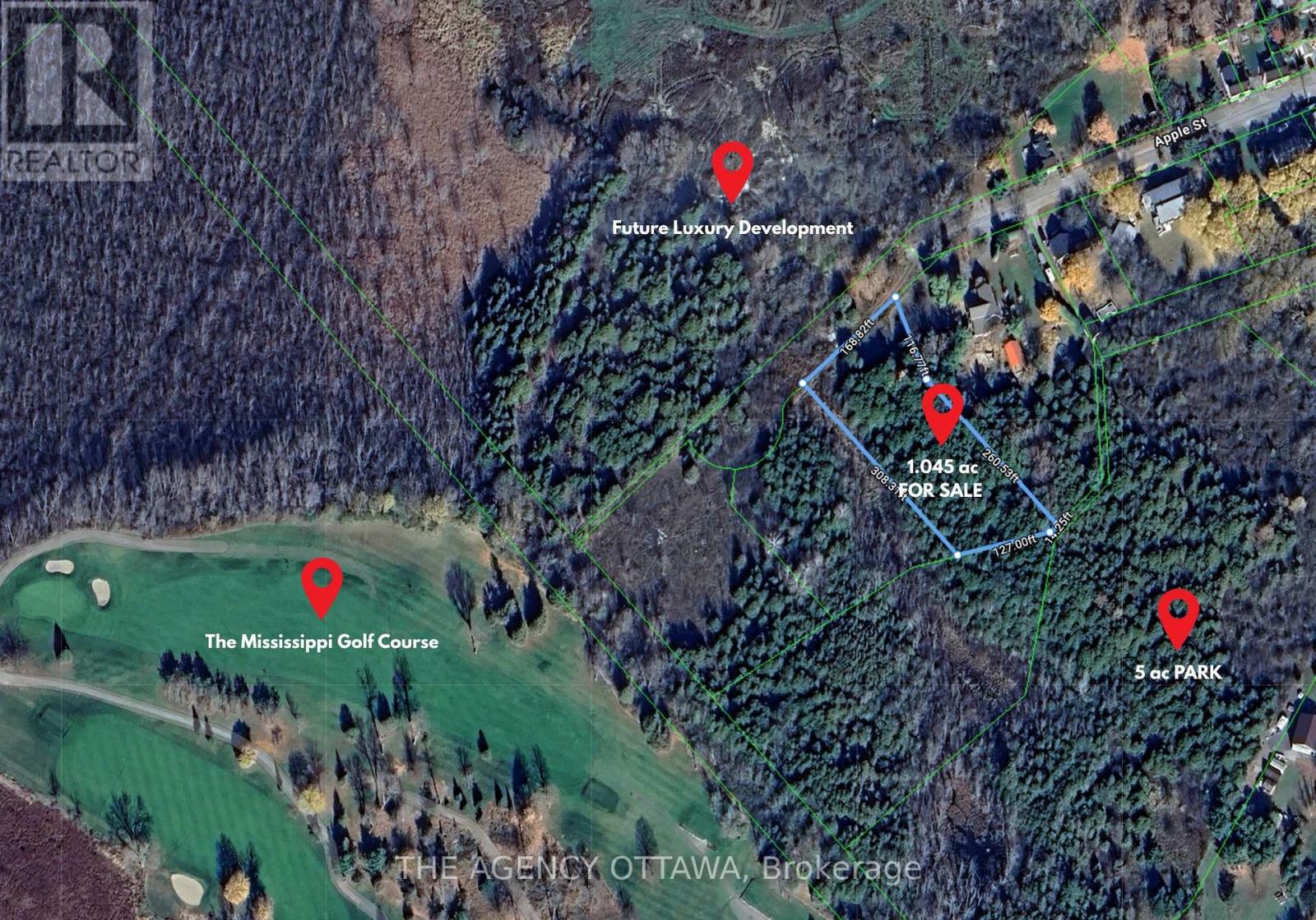 Incredible opportunity to build your dream home or invest in one of the areas most promising future communities. This just-over-1-acre lot is ideally positioned in a quiet, forested enclave, backing onto a beautiful 5-acre park and surrounded by mature trees, natural beauty, and premium amenities. Located just two minutes from the Mississippi Golf Club and five minutes from downtown Carleton Place, this serene lot offers the perfect blend of country living with close proximity to shops, schools, and conveniences. A public boat launch is just down the road in Appleton, where a new riverside cafe is currently under construction adding to the charm and value of the area. Natural gas is available, and an environmental assessment has been completed (documentation available). Permission has also been granted for a private access road, with a permanent municipal road extension of Apple Street expected in 2026. For those ready to build now, a private driveway can be installed and serviced.The lot sits across from a future 16-home luxury development recently approved in principle (documentation available), making this a compelling option for both individual buyers and investors. Enjoy total privacy, direct park access, and the comfort of a quiet, nature-filled setting while remaining just 5 minutes from Carleton Place, 10 minutes from Almonte, 20 minutes from Kanata, and an easy commute to Ottawa.Whether you're ready to build your custom retreat today or secure a premium parcel for future development, this unique property offers rare value and long-term potential in a growing, sought-after location. (41831005)