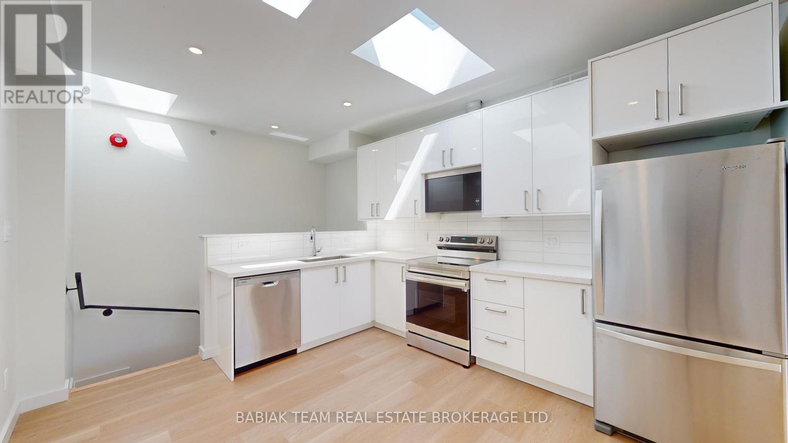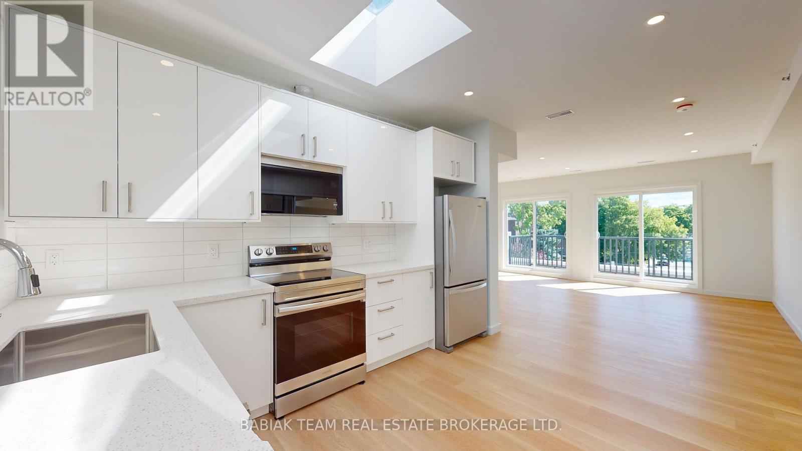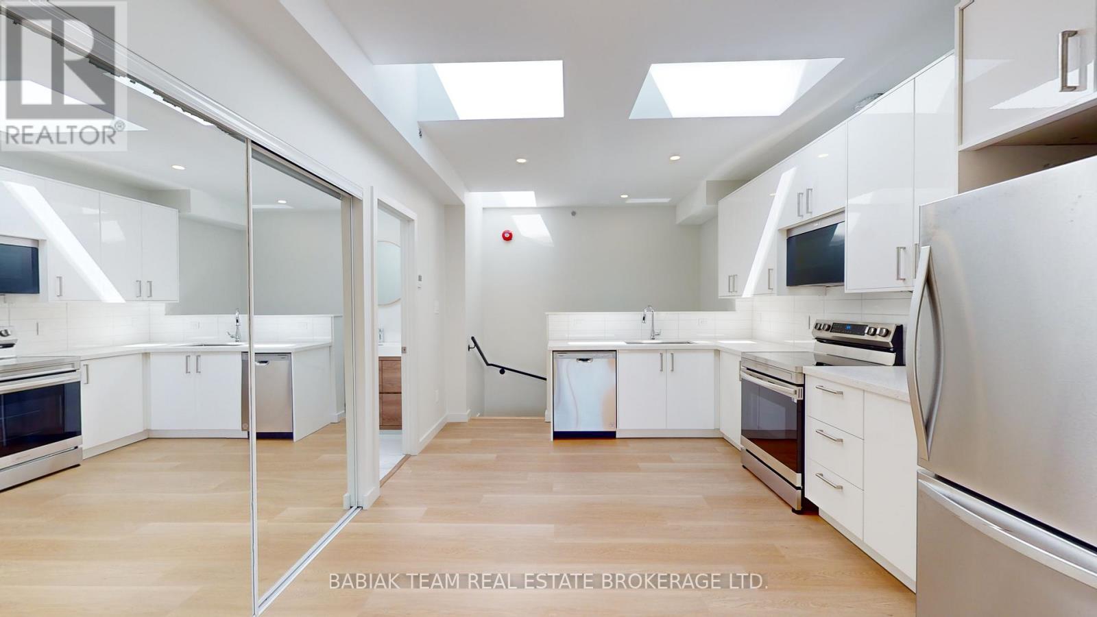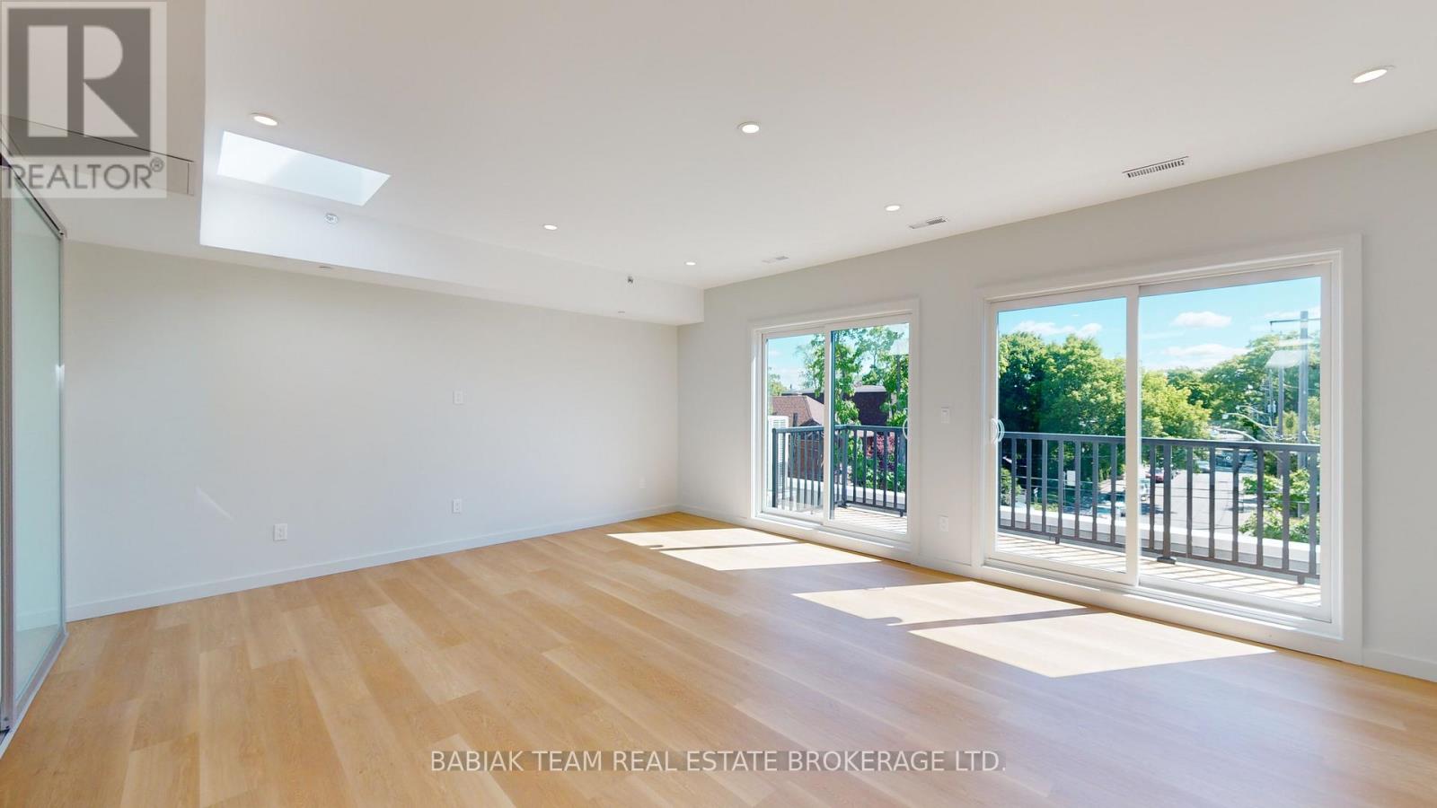 Bright, newly renovated 1,000+ square feet, 2 bedroom, 1 bathroom unit in Bloor West Village! This spacious unit is filled with natural light thanks to 5 skylights and 2 large double sliding doors that open onto a ~130 sq ft balcony. Features include: a large open plan living & dining area; a modern custom kitchen with full size stainless steel appliances; a primary bedroom with a large walk-in closet; a second bedroom with closet and stacked laundry and a 4-piece bathroom. Led pot lights, natural white oak vinyl plank flooring, and 9' ceilings throughout. Fully independent A/C and heat control. Enjoy peace and quiet with no upstairs neighbours. The building features modern safety features including a sprinkler system and a central fire alarm. Stroll to the shops and restaurants of Bloor West Village & Baby Point Gates. Easy walk to the Jane Subway and the Humber River parklands. Hydro & heat are extra. Available Feb 15. (41831407)