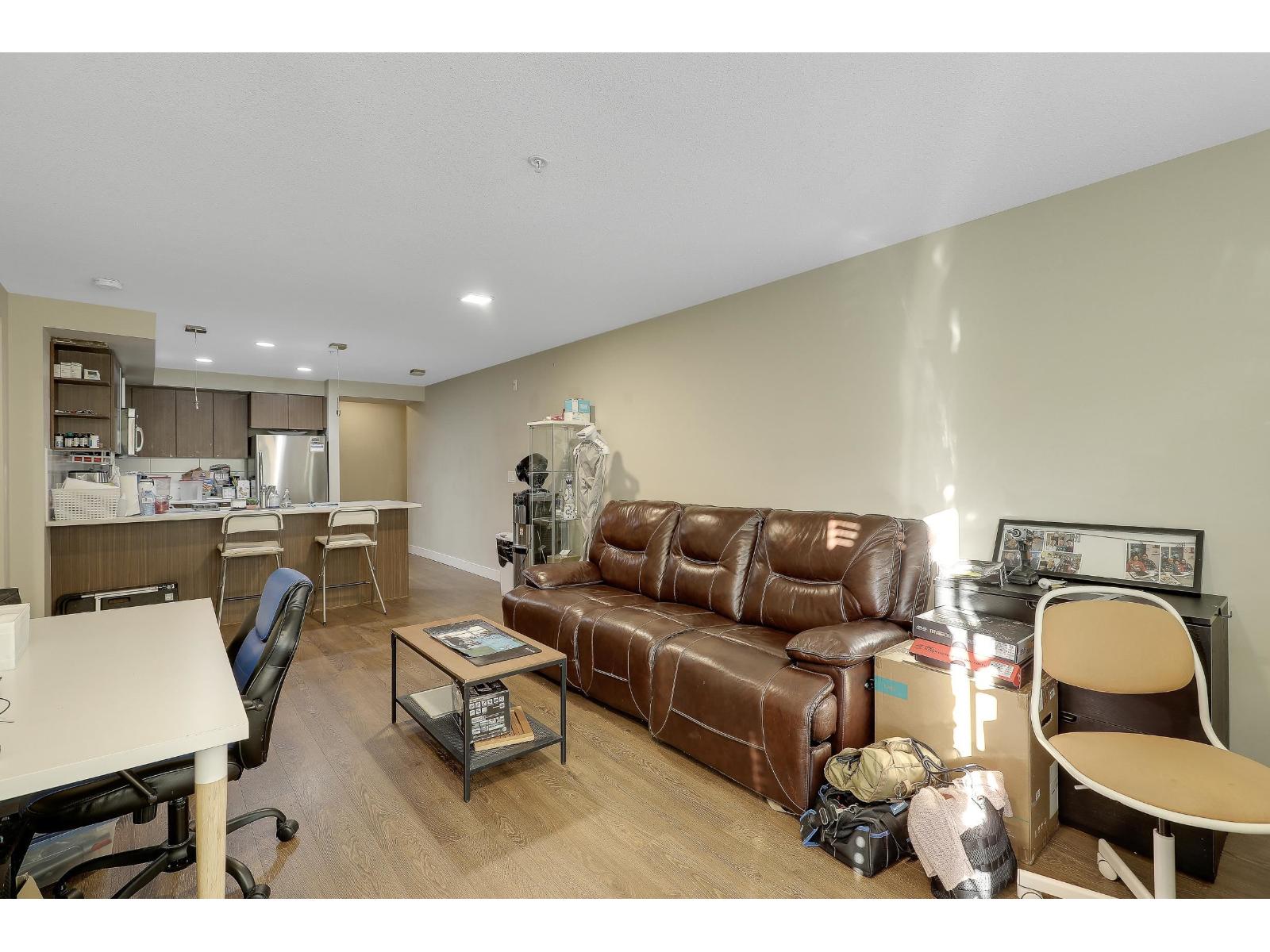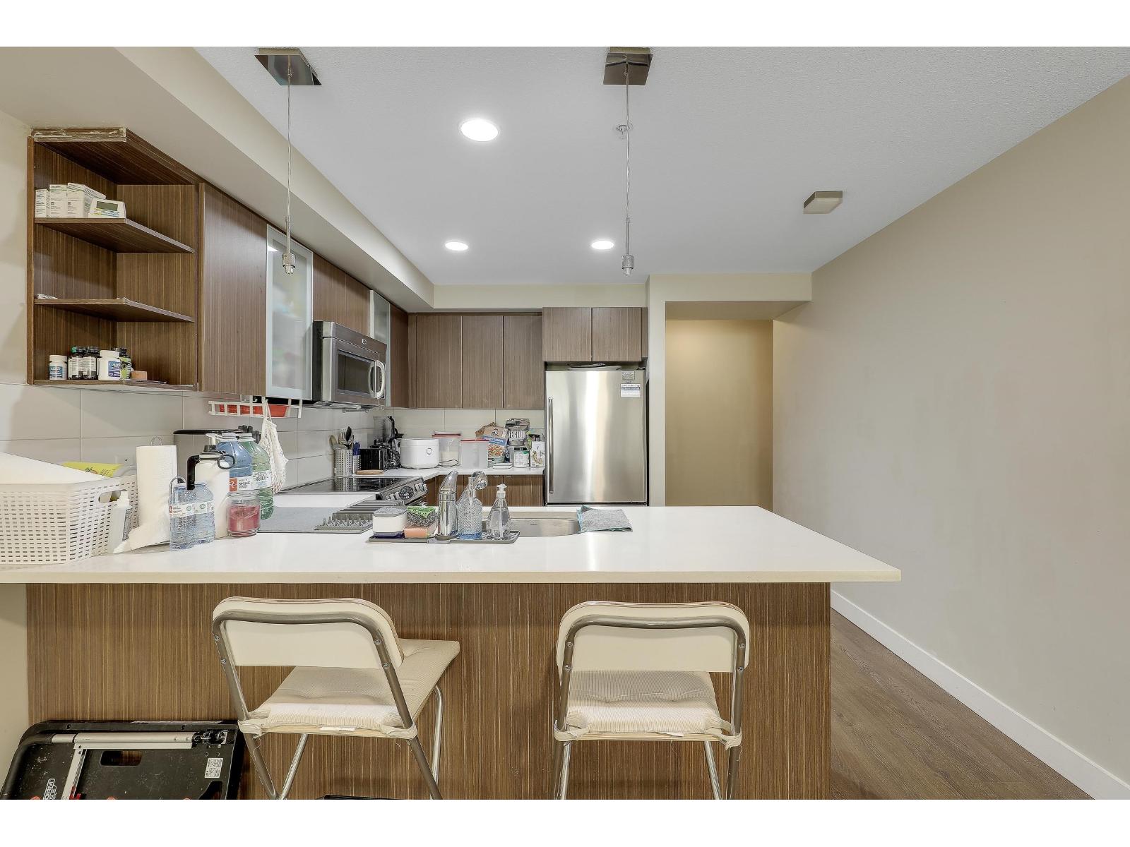SOUTH-FACING 2 BED 2 BATH CORNER UNIT ON THE QUIET SIDE OF THE BUILDING! This bright, functional layout offers a gourmet kitchen with stainless steel appliances, modern full-wrap cabinets, under-cabinet lighting & Caesarstone counters. Spacious living/dining area with built-in fireplace & covered deck access. Primary bedroom features walk-in closet & 4-pc ensuite. Moen fixtures, ceramic tile & premium finishes throughout. Includes secure parking, storage locker & 2 elevators. Pets & rentals allowed. Beautiful, well-managed building close to shopping, parks & transit. (32267791)