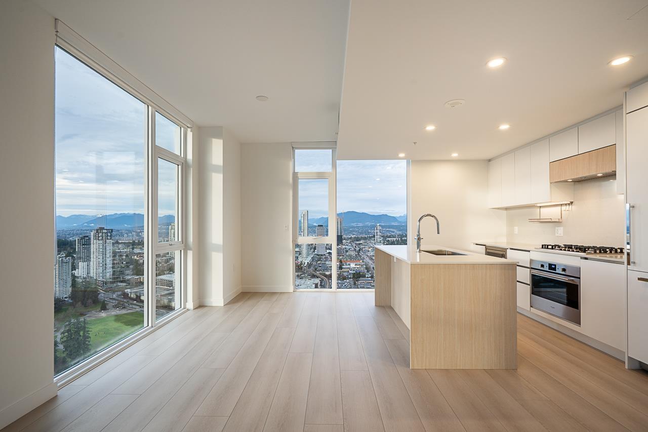 SUB-PENTHOUSE at Century City, quality built by Century Group. Stunning NW CORNER | 2 BED | DEN | 2 BATH, almost 1,000 sq.ft. of refined living with spectacular panoramic city, water, and mountain views. 9' ceilings, floor-to-ceiling windows, laminate flooring throughout, the home is bright, elegant, and functional. Gourmet kitchen features quartz countertops, Fulgor Milano S/S and GAS cooktop. Spacious primary bedroom includes walk-in closet, a spa-inspired ensuite with rainfall shower and mirrored medicine cabinet. Enjoy over 40,000 sq.ft. of luxury resort-style amenities, including a Fully Equipped GYM, Lounge, Games Room and much more! Steps to King George SkyTrain Station and King George Hub with restaurants, shops, banks. Walking distance to SFU, and future UBC campus. 10/10! (32267884)