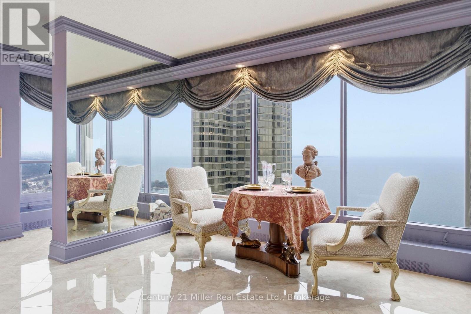Spacious 3,247 sq. ft residence on the 36th floor of the Luxurious Resort-Style Palace Pier showcasing breathtaking lake and city skyline views. Elegant wainscoting enhances the lobby and corridors, complemented by marble and porcelain flooring throughout. The open-concept kitchen features a marble peninsula, statement marble wall, and backsplash overlooking the breakfast area and family room with built-in wall unit. The great room offers a dining area, built-in bar, solarium with julitette balcony, custom electric fireplace, and automated blinds on the floor to ceiling windows. Lots of natural light and beautiful view of Lake Ontario! The primary suite includes two large walk-in closets, solarium with juilette balcony, luxurious 5-piece bath, and pop-up TV. A truly exceptional home with refined custom finishes.Two bedrooms were converted to a custom office/library with built-ins and fireplace which can be easily converted back to two bedrooms. Amenities include: Fitness and aerobics center, Restaurant, Club on 47th floor, media room ,ar, event kitchen stage for events, terraces, tennis court, putting green, squash courts, golf simulator Table tennis room billiards room Party Room, convenience store, spa, arts and crafts room, childrens playroom , 24 hour concierge, 18 hour valet service, hourly bus service to downtown 6 days a week, 7 guest suites, large indoor swimming pool with whirlpool and sauna, pets allowed with restrictions (41839055)
