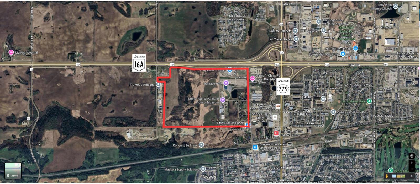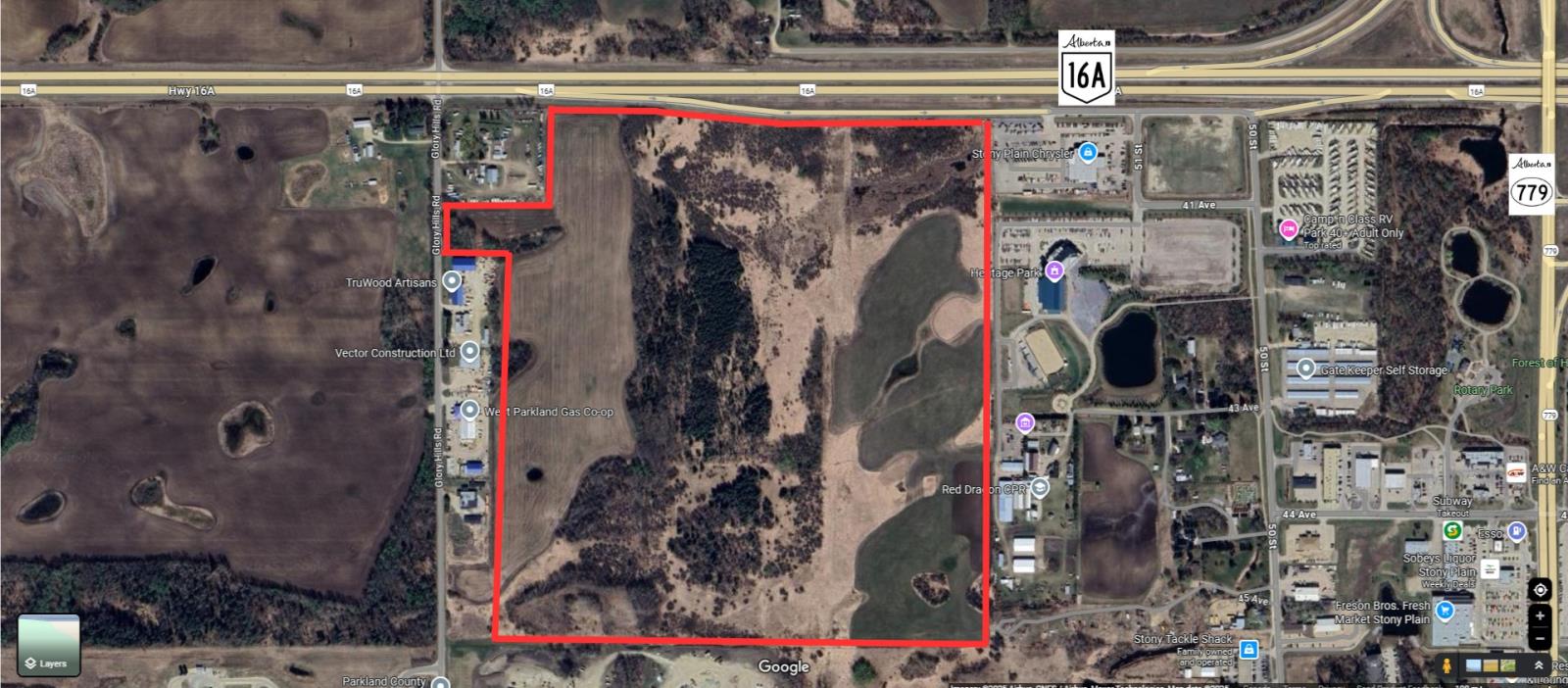 Prime development opportunity with this 140+/- acre parcel situated within the Town of Stony Plain, boasting approximately 2,200 feet with future access via Highway 16A and Glory Hills Road. With unparalleled visibility and exposure to over 23,000 vehicles per day on Highway 16A, an additional 11,500+ vehicles on Highway 779, this site is ideally positioned for large-scale commercial development. Zoned FD - Future Development, this land is a strategic investment for developers seeking to capitalize on Stony Plains ongoing growth. This property benefits from proximity to existing municipal services and established amenities, including Stony Plain Chrysler, Heritage Park Pavilion, and Campn Class RV Park. Notably, this site is located just west of the future Costco development, adding even more appeal and long-term value to the area. When combined with the parcel directly across Glory Hills Rd (52532 Glory Hills Rd), the two sites together would offer approximately one full mile of highway frontage (72889061)