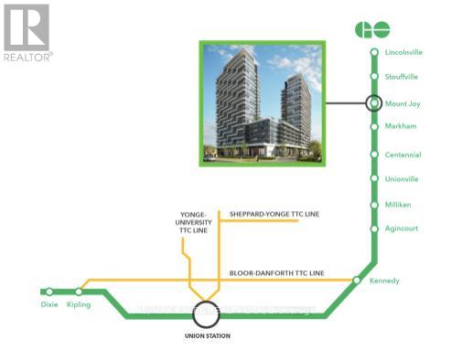 LOCATION, LOCATION & LOCATION: Brand New 1+Den Condo Apartment Featuring 2 Full Bathrooms At Joy GO Station In Markham! This East Facing Modern Suite Features Spacious & Functional Living Room Area, Floor-To-Ceiling Windows, Sleek Kitchen W/ Quartz Counters, S/S Appliances, & Versatile Kitchen Island. Upgrades With Premium Porcelain Tile In Bathrooms & Zebra Blinds Throughout. Spacious Den Perfect For Home Office. Steps To Mount Joy GO Station, Shopping, Restaurants, & Parks. Located Within Top School Districts - Bur Oak S.S., St. Brother Andre C.H.S., Mount Joy P.S - An Ideal Choice For Families. Enjoy Future Access To Joy Station's Premium Amenities: 24hr Concierge, State-of-the-Art Gym, Golf Simulator, Business Centre, & Stunning Rooftop Terrace with BBQs. Bonus: High-Speed Rogers Internet Bundle Included in Rent! For Anyone Seeking The Most Sophisticated Lifestyle At Markham's Ultimate Commuter Hub, This Is The Brand-New Residence You Simply Cannot Miss! (41852406)