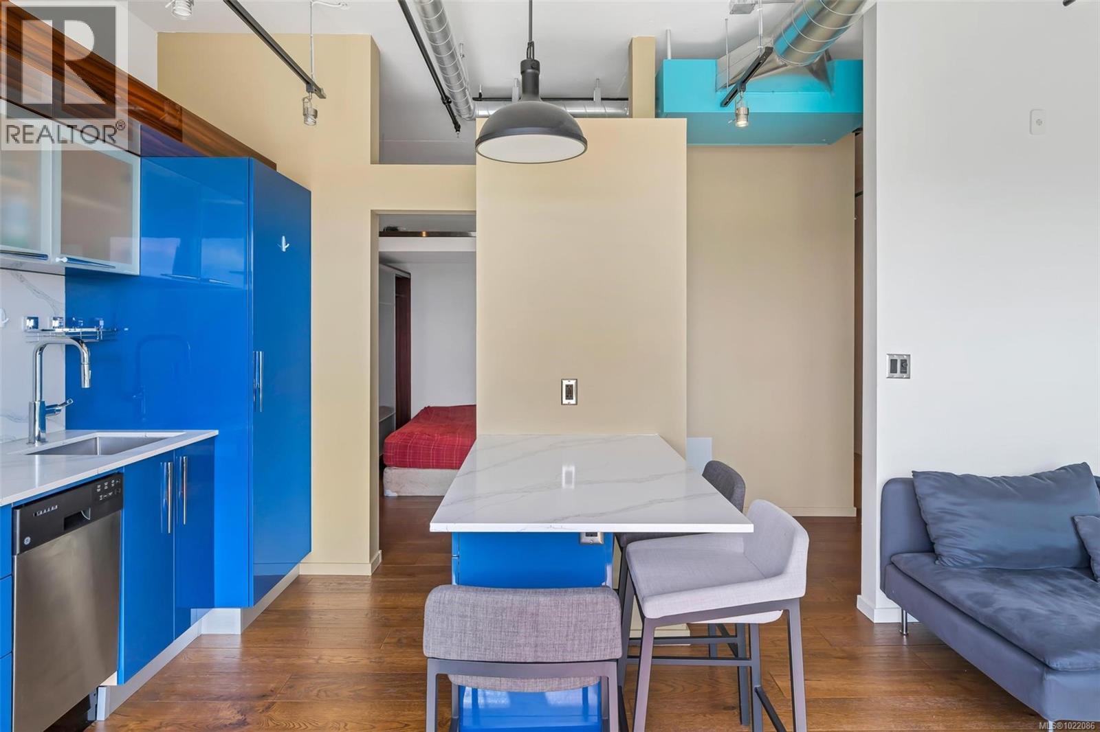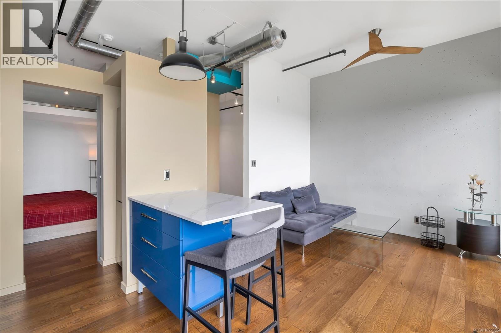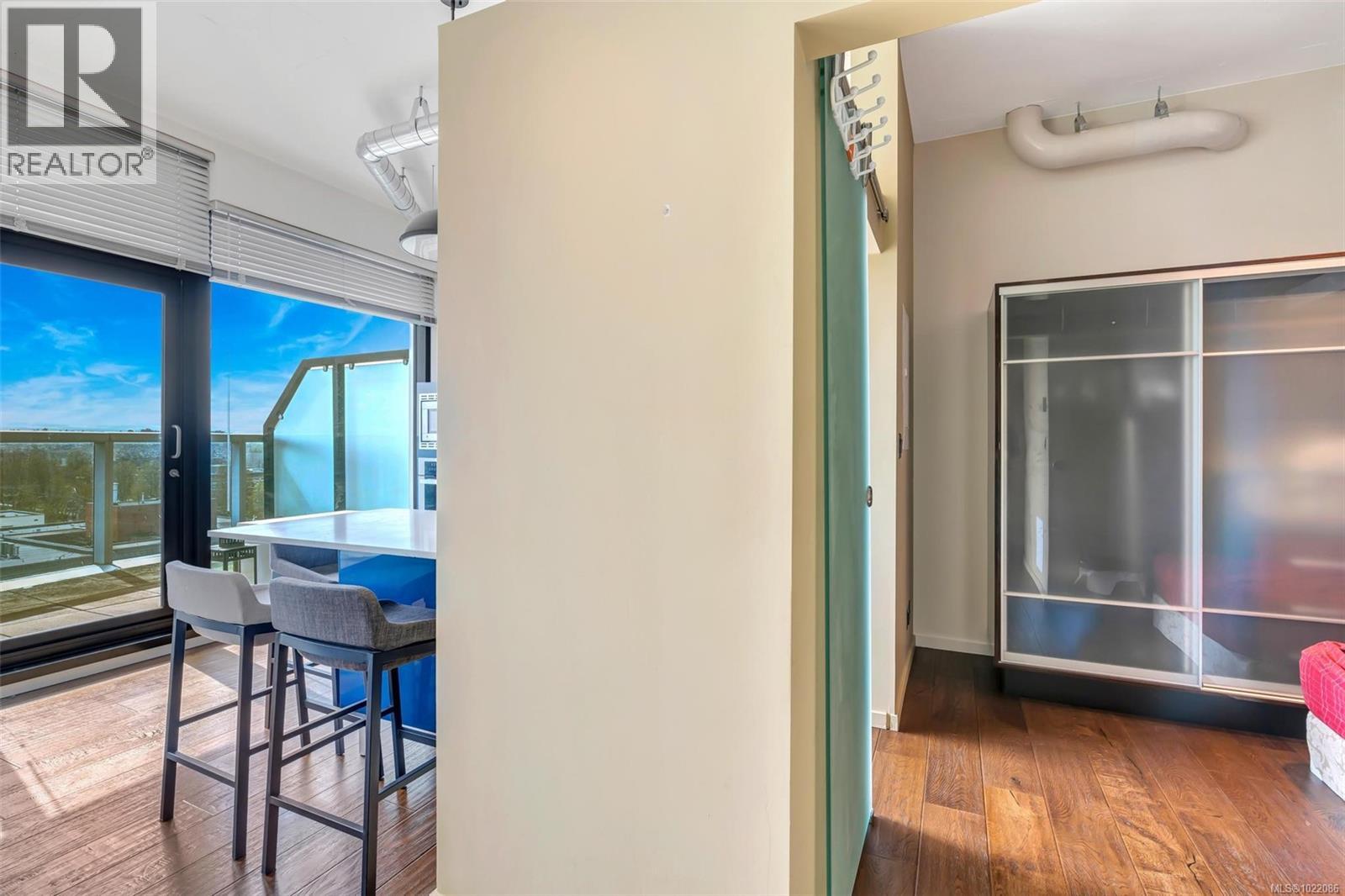 Bright 1-Bedroom Penthouse in Downtown Victoria This modern 1-bedroom penthouse, built in 2019, features 10-foot ceilings, floor-to-ceiling windows, and a bright open-concept layout filled with natural light. The contemporary kitchen offers quartz countertops, a central island, and built-in stainless steel appliances, seamlessly connecting to the living and dining areas. Enjoy outdoor living on the spacious 104 sq ft curved balcony, ideal for entertaining or relaxing. Additional highlights include secure underground parking, a storage locker, and bike storage. Residents enjoy access to building amenities such as a fitness centre, yoga area, and community lounge. Located just steps to Yates Street Market, shops, restaurants, and public transit, and only minutes to the Inner Harbour. Move-in ready, vacant, and easy to show, this home is ideal for both end users and investors. (30226264)