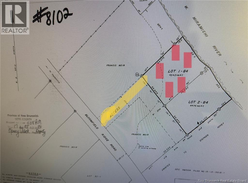 Having a hard time finding the perfect waterfront lot for your year-round dream home or peaceful getaway? Youll love this 1.07-acre property offering approximately 180 feet of frontage on the famous Miramichi River. Located just a short distance from excellent fishing, hunting, ATV trails and snowmobiling, this lot is ideal for outdoor enthusiasts. The property features a deeded right-of-way across from civic number 329 Bloomfield Ridge Road, leading to a private, treed setting with direct river access. Only a 50-minute drive from Fredericton, New Brunswicks capital city, it offers an easy commute or the perfect work-from-home retreat surrounded by nature. Waterfront opportunities like this are becoming increasingly rare, especially at a price often less than non-waterfront city lots. With beautiful views where two channels of the river converge, this is your chance to secure a special piece of the Miramichi River lifestyle. (29337468)