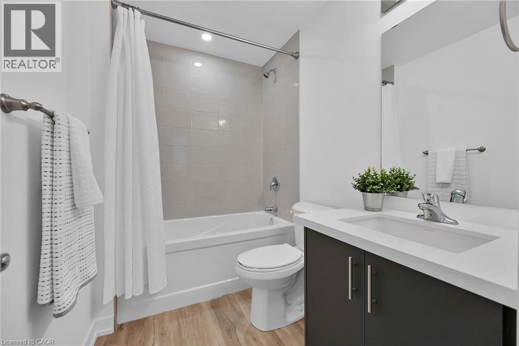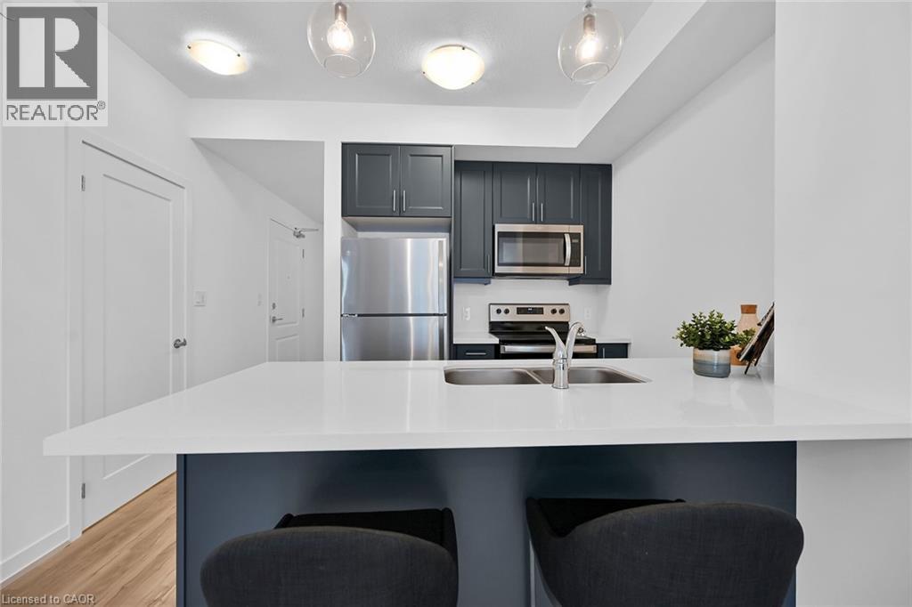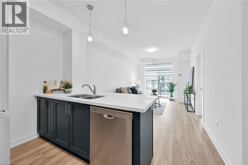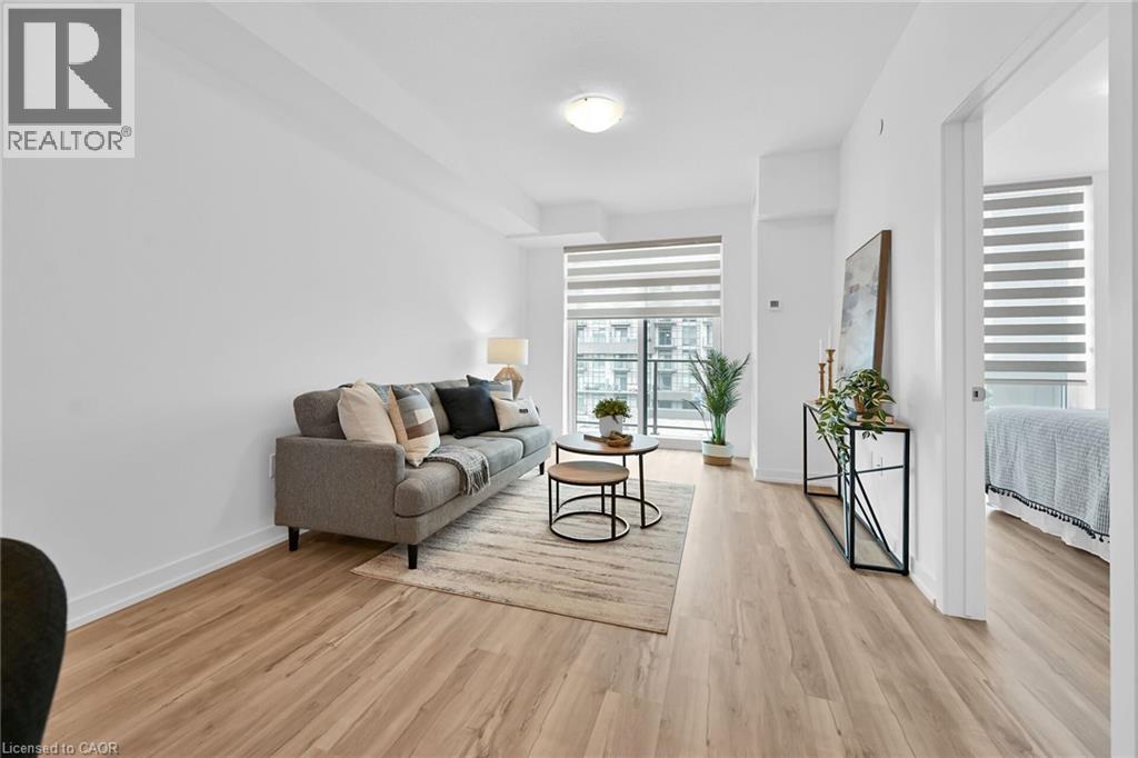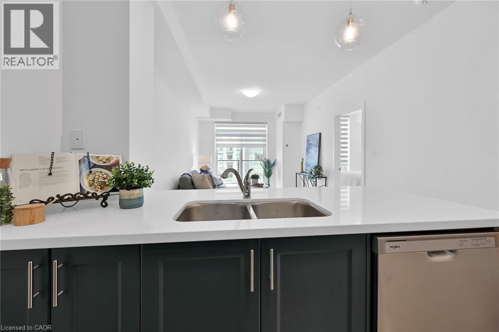 Fabulous 8th floor suite in the popular Trend 3 building in Waterdown. Bright, open concept 764 sq ft. 1 bedroom plus den with 1 underground parking space, 2 bathrooms. Geo-Thermal heating & cooling. Upgraded kitchen with quartz counters & matching quartz backsplash. Bedroom has 4 - piece ensuite & walk-in closet. Spacious den for home office or your personal use. Convenient 2-piece washroom & laundry in main area. High ceilings, floor to ceiling windows with blinds included. All appliances included. Balcony has clear N/W & S/W views. Amenities include: exercise room, party room, rooftop patio with BBQ area for your enjoyment. Walk to downtown pubs & restaurants. Minutes to GO station & hwy access. (70001911)