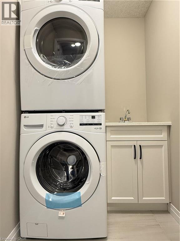 Laundry room with stacked washing machine and dryer, cabinet space, and a textured ceiling
