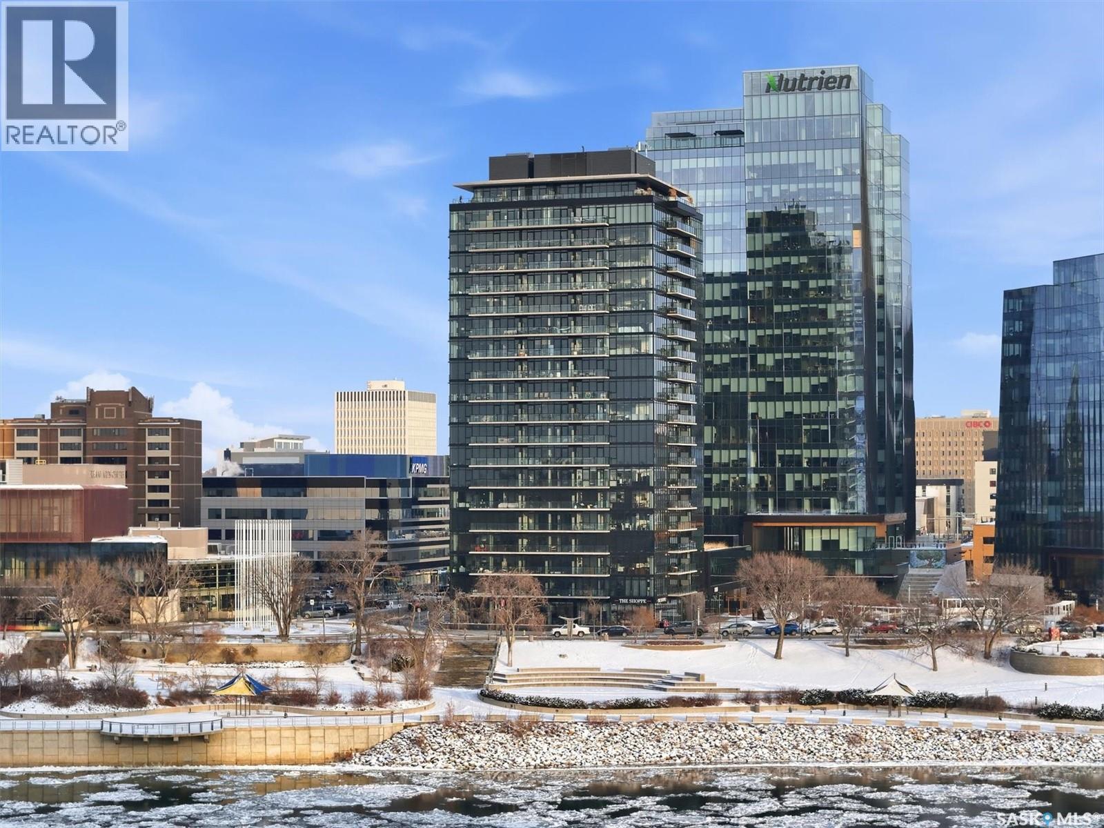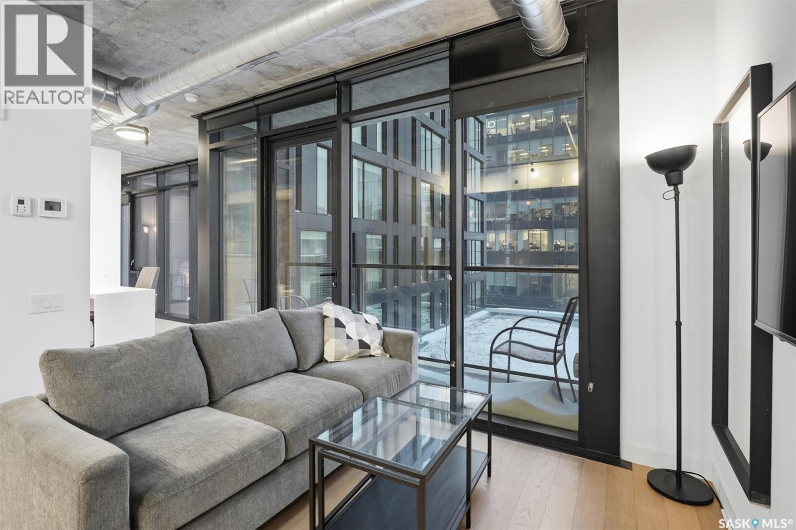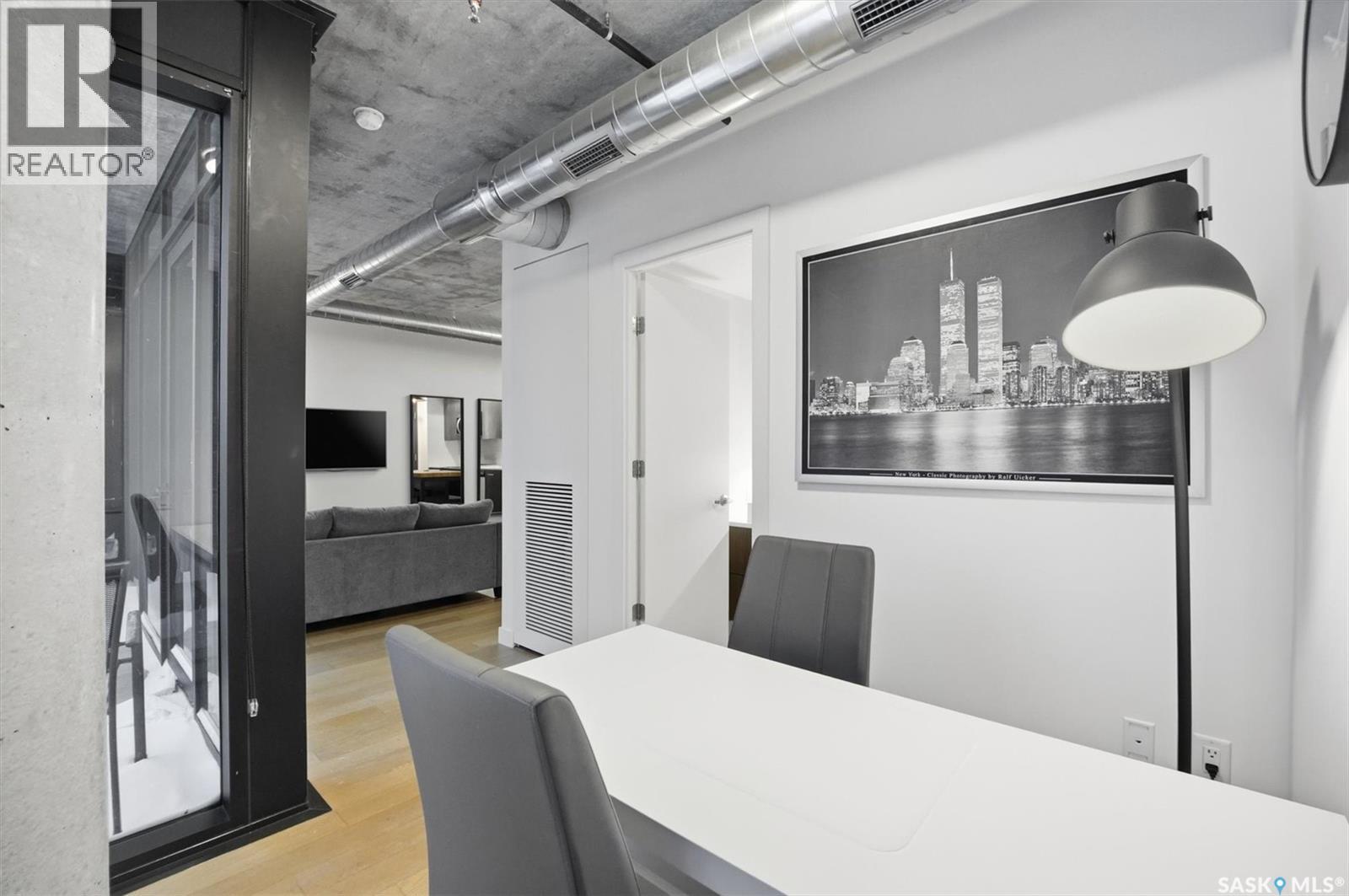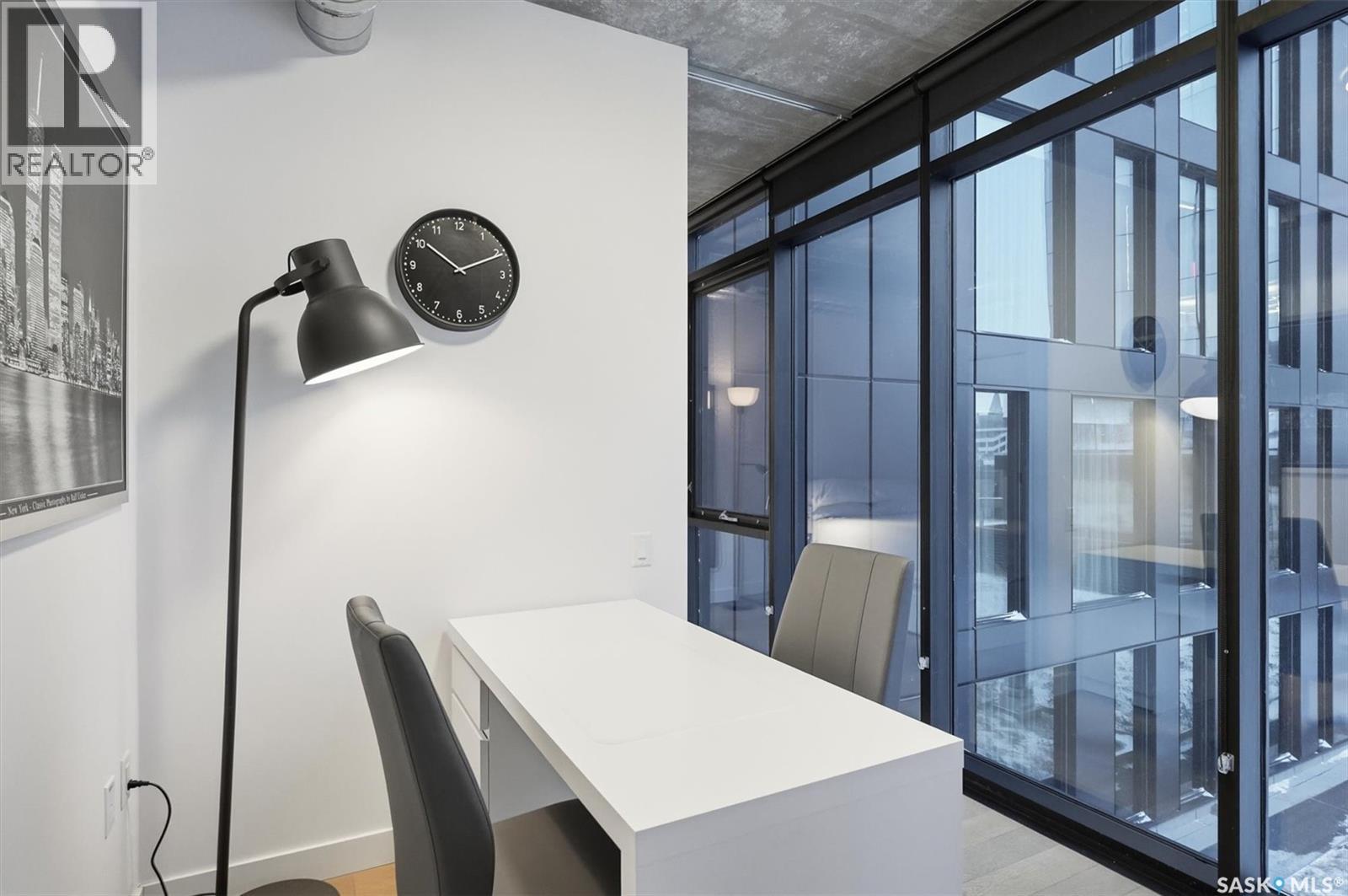 Welcome to River Landing, one of Saskatoon’s iconic high-rise residences that has reshaped the downtown riverbank skyline. Whether you’re stepping into home ownership or expanding your real estate portfolio, there is the option to have this condo come fully furnished / turn-key as an executive rental which presents an exceptional opportunity. This 1-bedroom condo with a versatile flex office/nook and one full bathroom features a thoughtfully designed open-concept layout. The kitchen offers modern cabinetry, quartz countertops, a stylish backsplash, and stainless steel appliances, all complemented by warm hardwood flooring and striking exposed concrete pillars & detail, 9' ceilings and floor-to-ceiling windows flood the space with natural light, while additional highlights include window treatments, sliding barn doors, in-suite laundry, central air conditioning, and a prime heated parking stall conveniently located on the main level (parking stall is titled), pets are allowed with restrictions, secured bike storage. Step onto the balcony to enjoy views of the rooftop green space and downtown skyline—offering the excitement of city living without the unease of excessive height. Located just steps from the riverfront, this unbeatable setting provides immediate access to the Meewasin Valley’s walking and biking trails, the South Saskatchewan River, Remai Modern Art Gallery, Persephone Theatre, and a vibrant selection of restaurants, cafés, and nightlife. This is a rare opportunity to own in the very heart of downtown Saskatoon. (29234017)