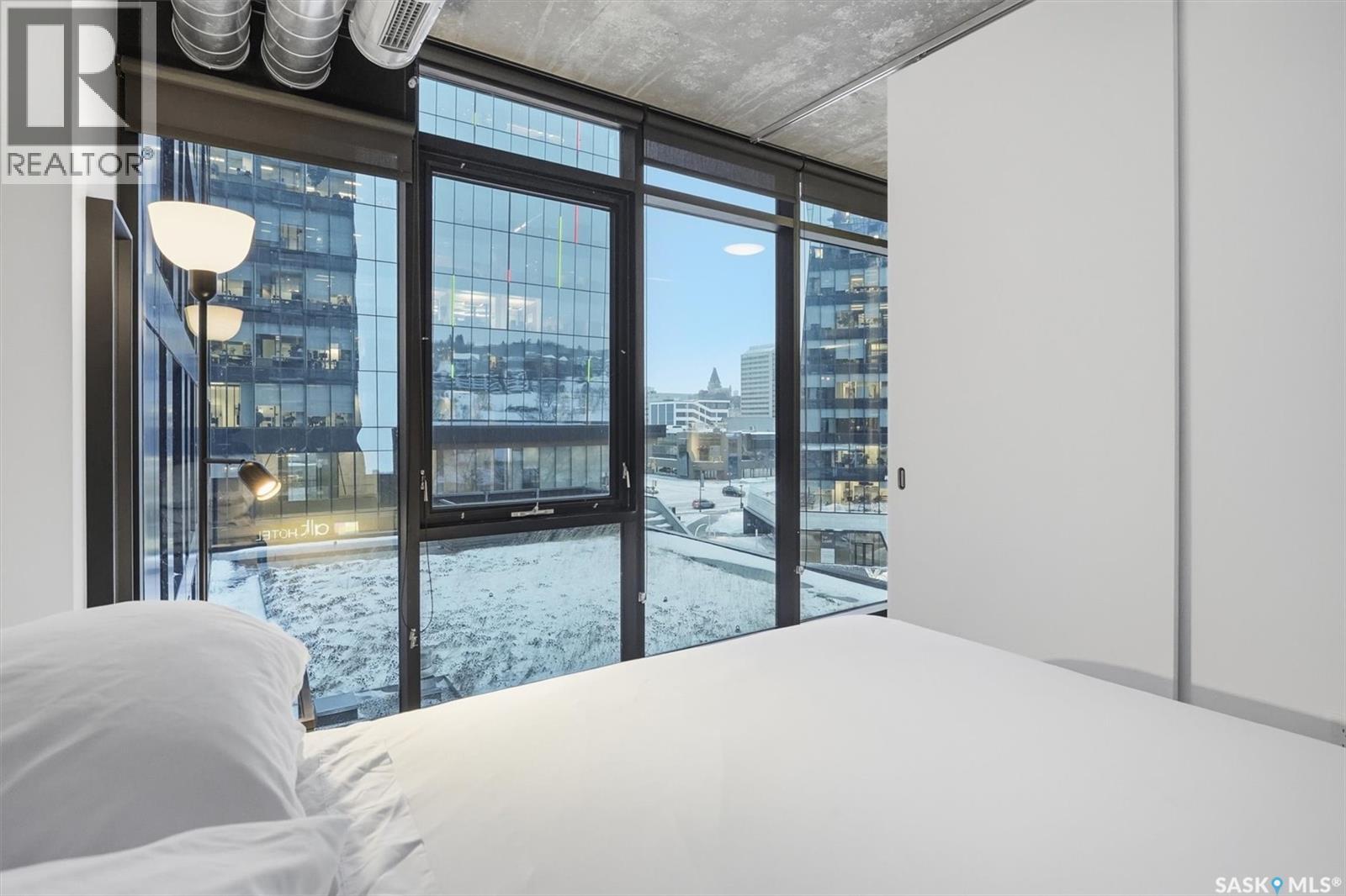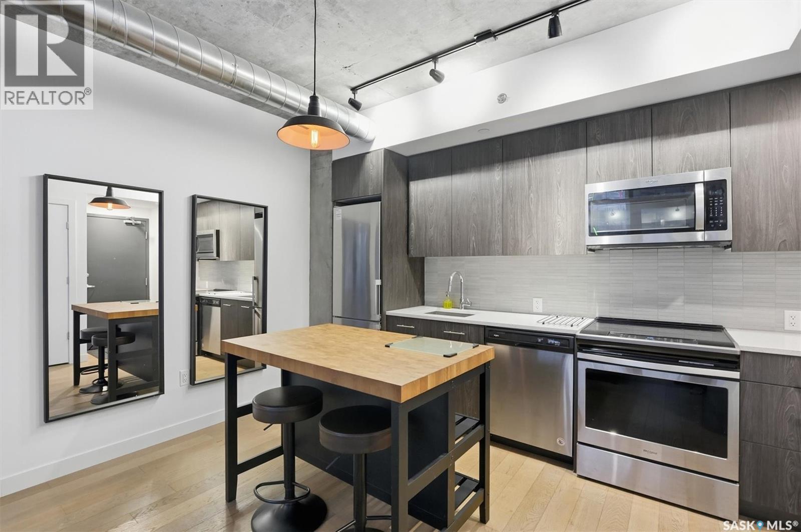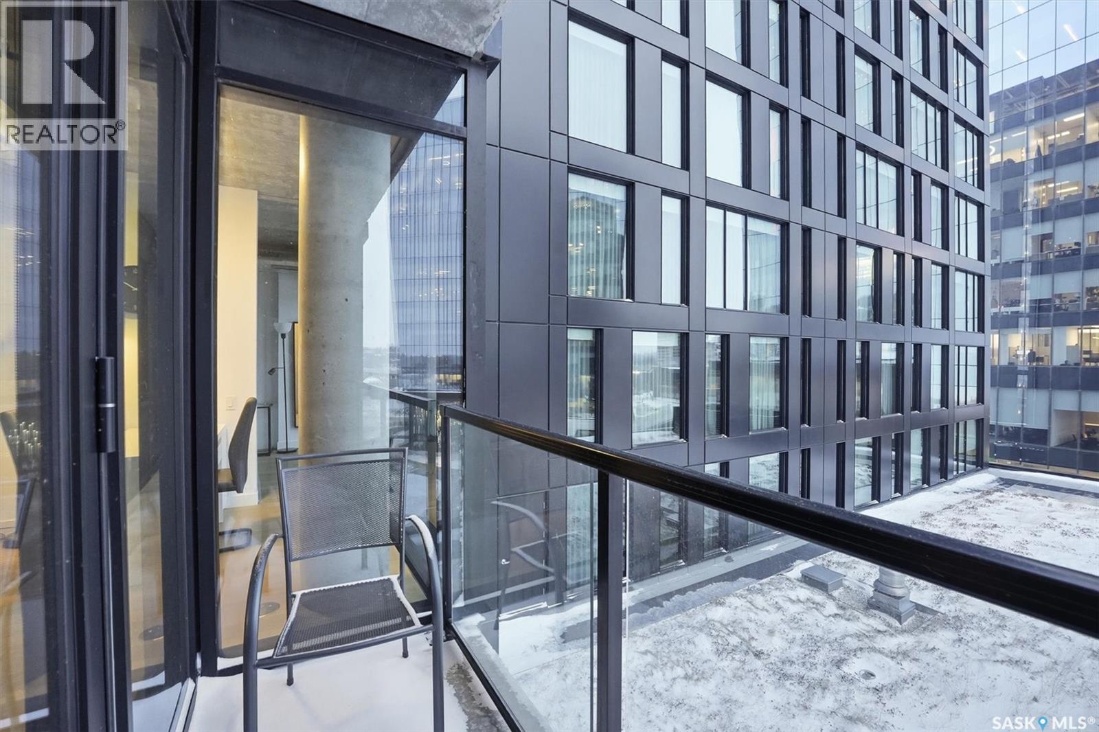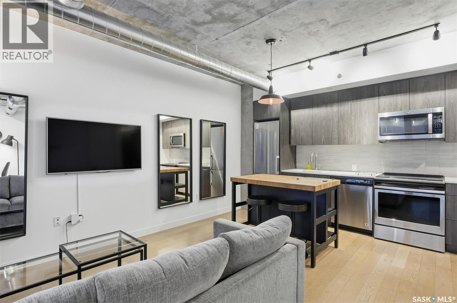 Welcome to River Landing, one of Saskatoon’s iconic high-rise residences that has reshaped the downtown riverbank skyline. Whether you’re stepping into home ownership or expanding your real estate portfolio, there is the option to have this condo come fully furnished / turn-key as an executive rental which presents an exceptional opportunity. This 1-bedroom condo with a versatile flex office/nook and one full bathroom features a thoughtfully designed open-concept layout. The kitchen offers modern cabinetry, quartz countertops, a stylish backsplash, and stainless steel appliances, all complemented by warm hardwood flooring and striking exposed concrete pillars & detail, 9' ceilings and floor-to-ceiling windows flood the space with natural light, while additional highlights include window treatments, sliding barn doors, in-suite laundry, central air conditioning, and a prime heated parking stall conveniently located on the main level (parking stall is titled), pets are allowed with restrictions, secured bike storage. Step onto the balcony to enjoy views of the rooftop green space and downtown skyline—offering the excitement of city living without the unease of excessive height. Located just steps from the riverfront, this unbeatable setting provides immediate access to the Meewasin Valley’s walking and biking trails, the South Saskatchewan River, Remai Modern Art Gallery, Persephone Theatre, and a vibrant selection of restaurants, cafés, and nightlife. This is a rare opportunity to own in the very heart of downtown Saskatoon. (29234017)
