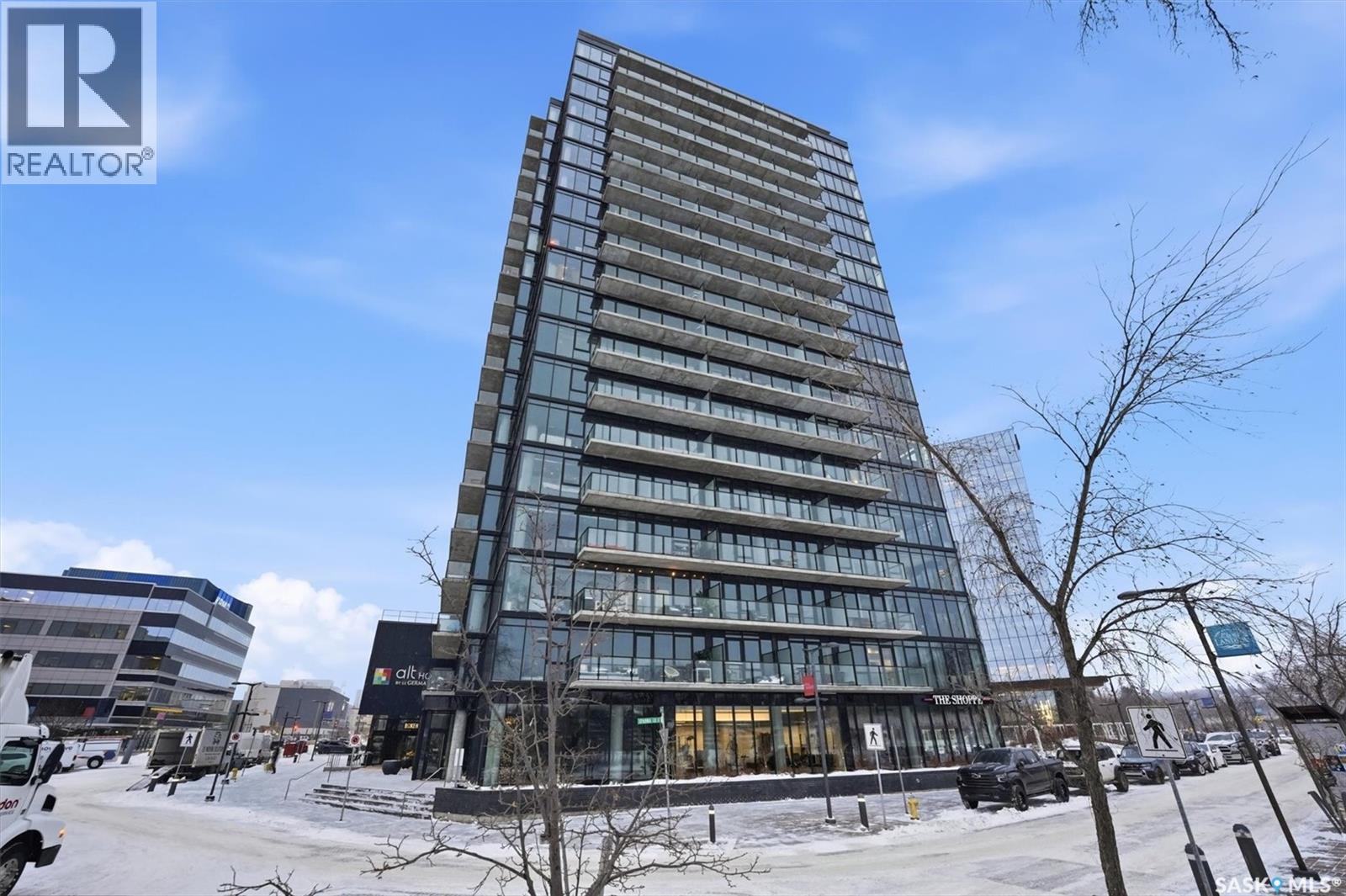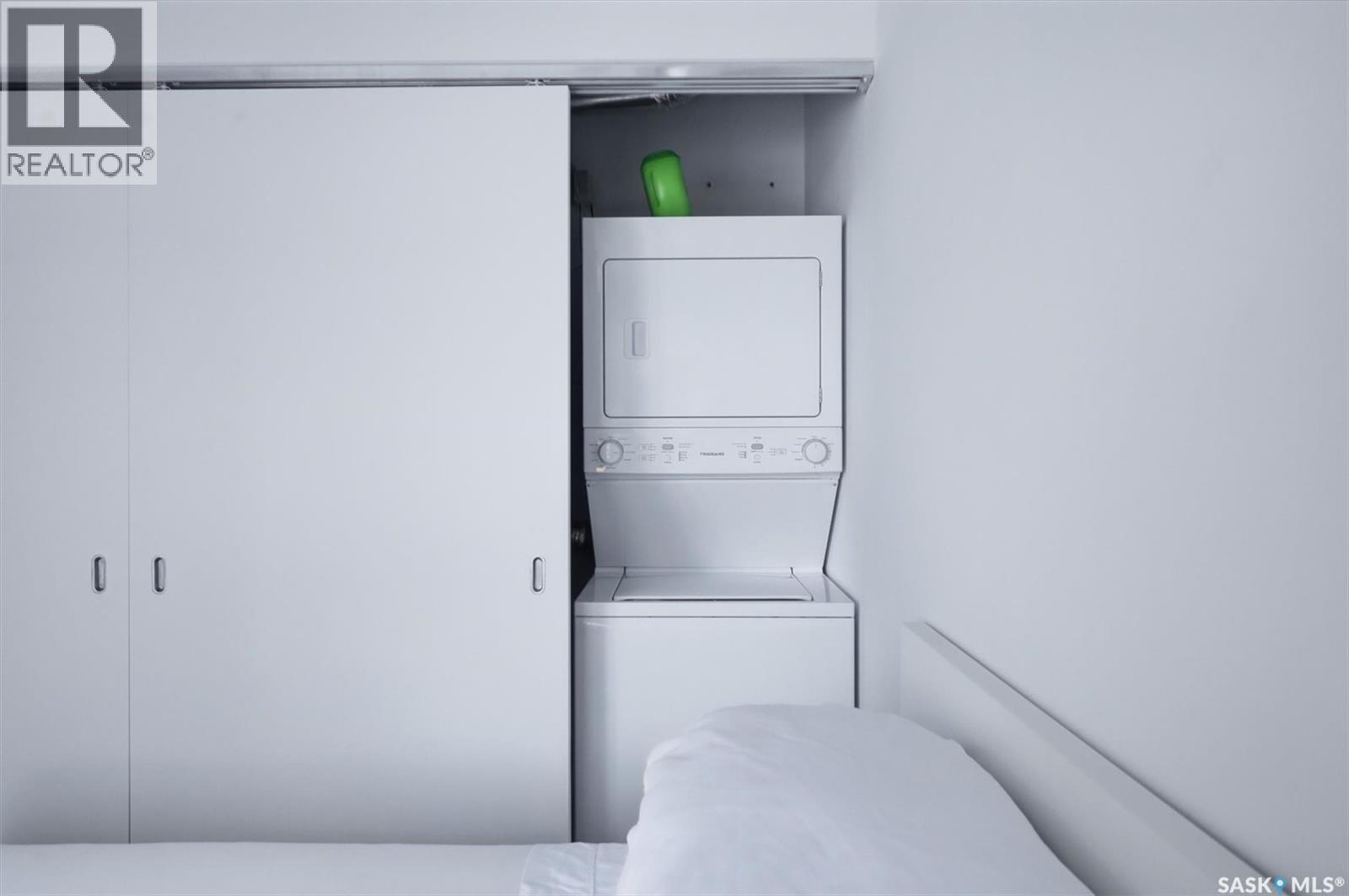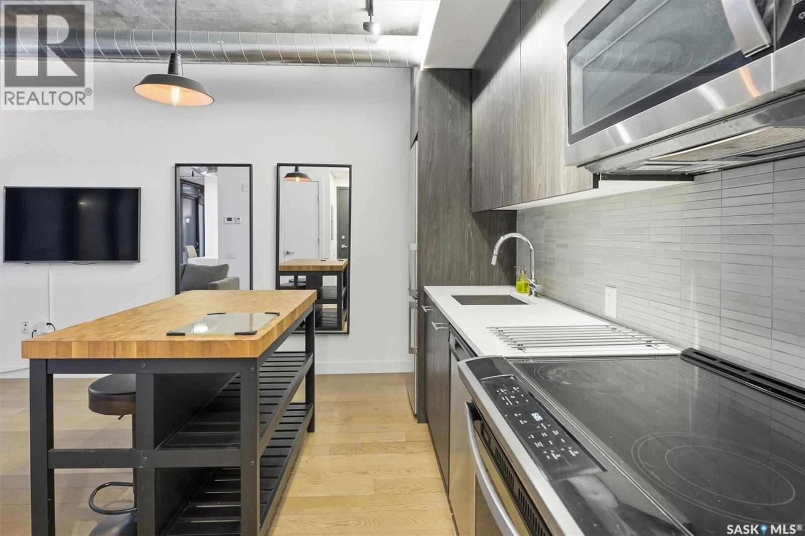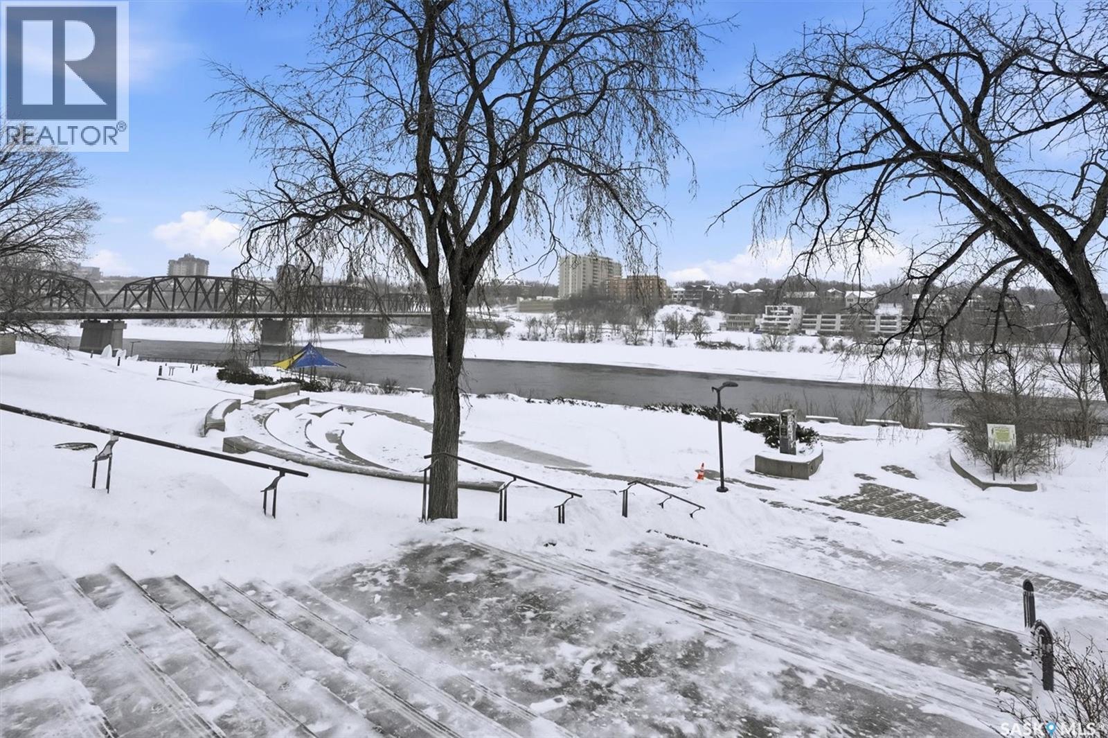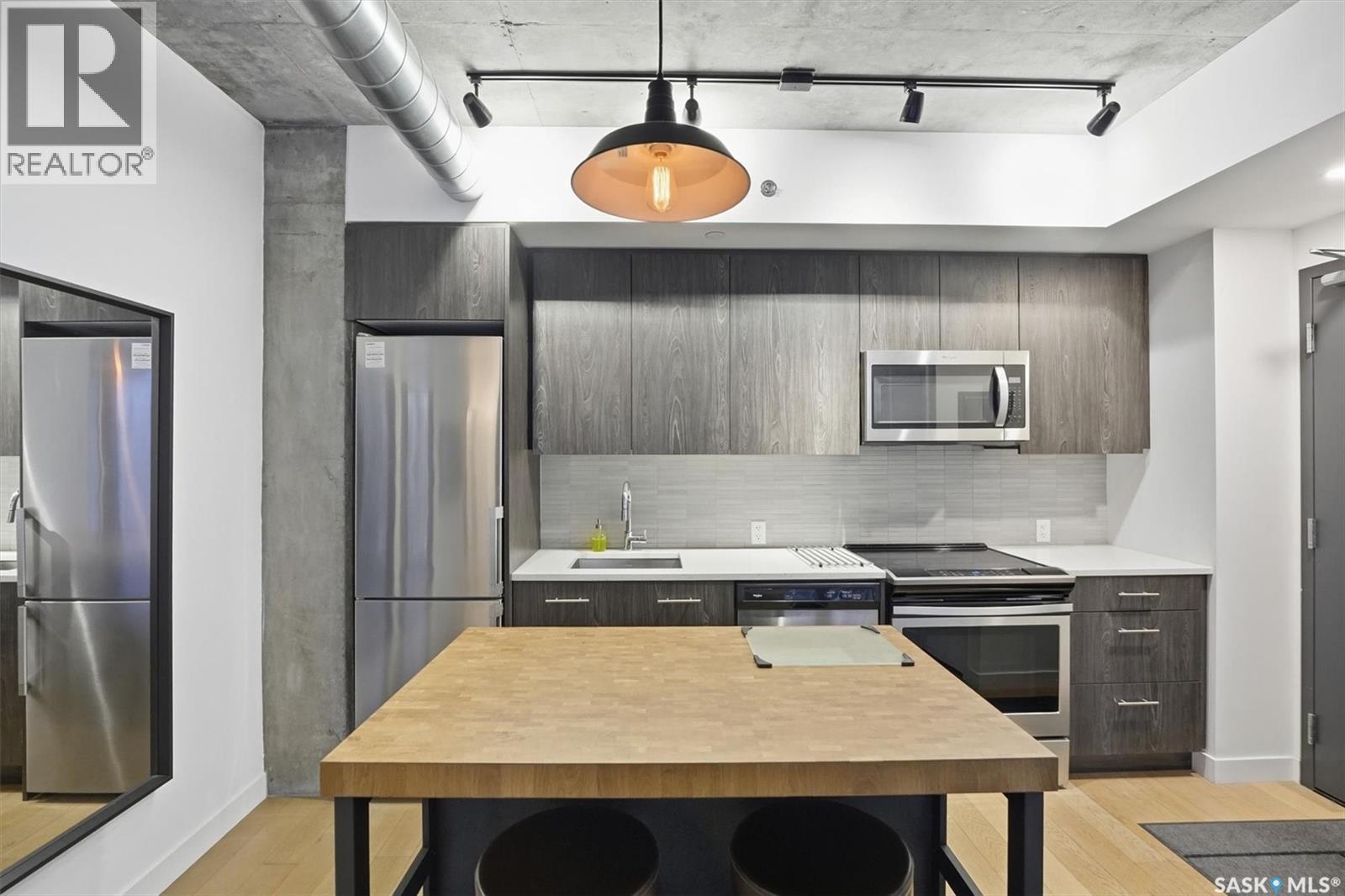 Welcome to River Landing, one of Saskatoon’s iconic high-rise residences that has reshaped the downtown riverbank skyline. Whether you’re stepping into home ownership or expanding your real estate portfolio, there is the option to have this condo come fully furnished / turn-key as an executive rental which presents an exceptional opportunity. This 1-bedroom condo with a versatile flex office/nook and one full bathroom features a thoughtfully designed open-concept layout. The kitchen offers modern cabinetry, quartz countertops, a stylish backsplash, and stainless steel appliances, all complemented by warm hardwood flooring and striking exposed concrete pillars & detail, 9' ceilings and floor-to-ceiling windows flood the space with natural light, while additional highlights include window treatments, sliding barn doors, in-suite laundry, central air conditioning, and a prime heated parking stall conveniently located on the main level (parking stall is titled), pets are allowed with restrictions, secured bike storage. Step onto the balcony to enjoy views of the rooftop green space and downtown skyline—offering the excitement of city living without the unease of excessive height. Located just steps from the riverfront, this unbeatable setting provides immediate access to the Meewasin Valley’s walking and biking trails, the South Saskatchewan River, Remai Modern Art Gallery, Persephone Theatre, and a vibrant selection of restaurants, cafés, and nightlife. This is a rare opportunity to own in the very heart of downtown Saskatoon. (29234017)