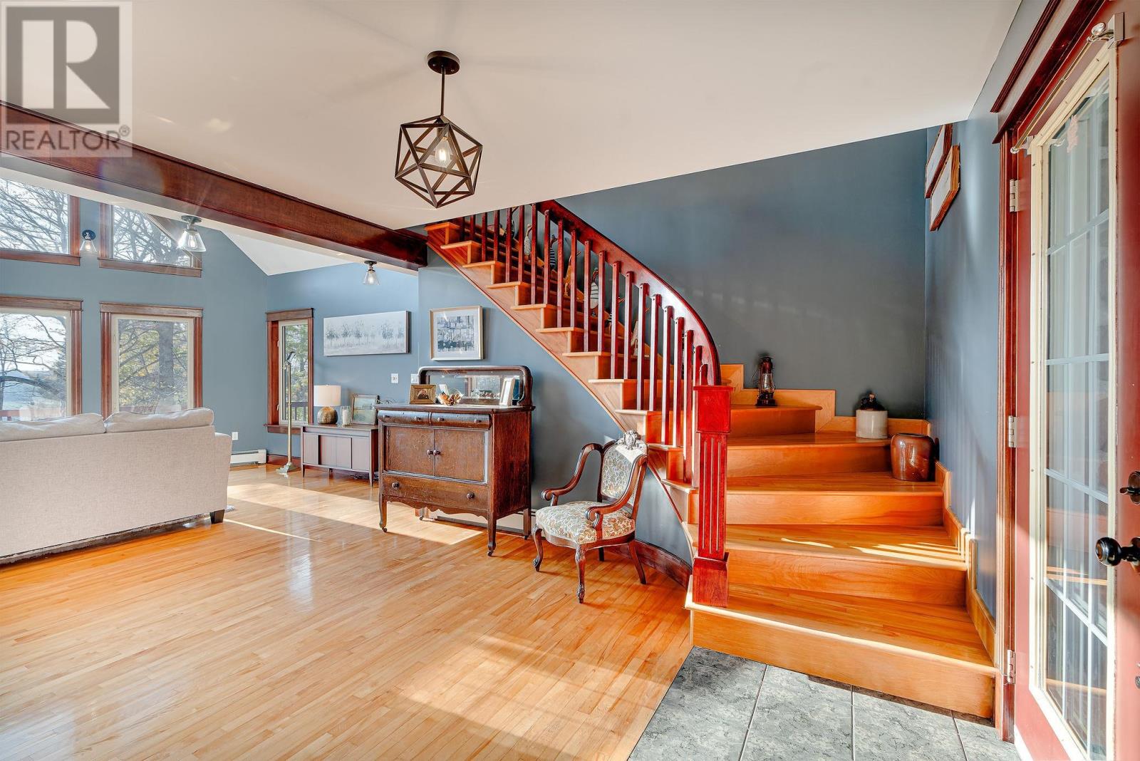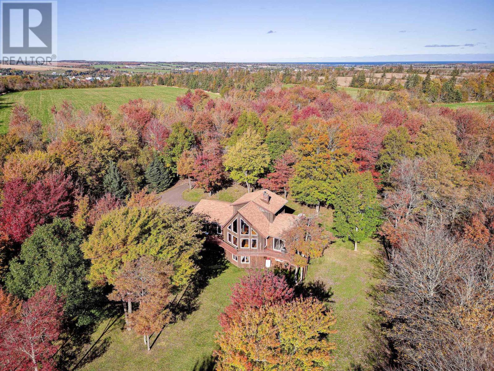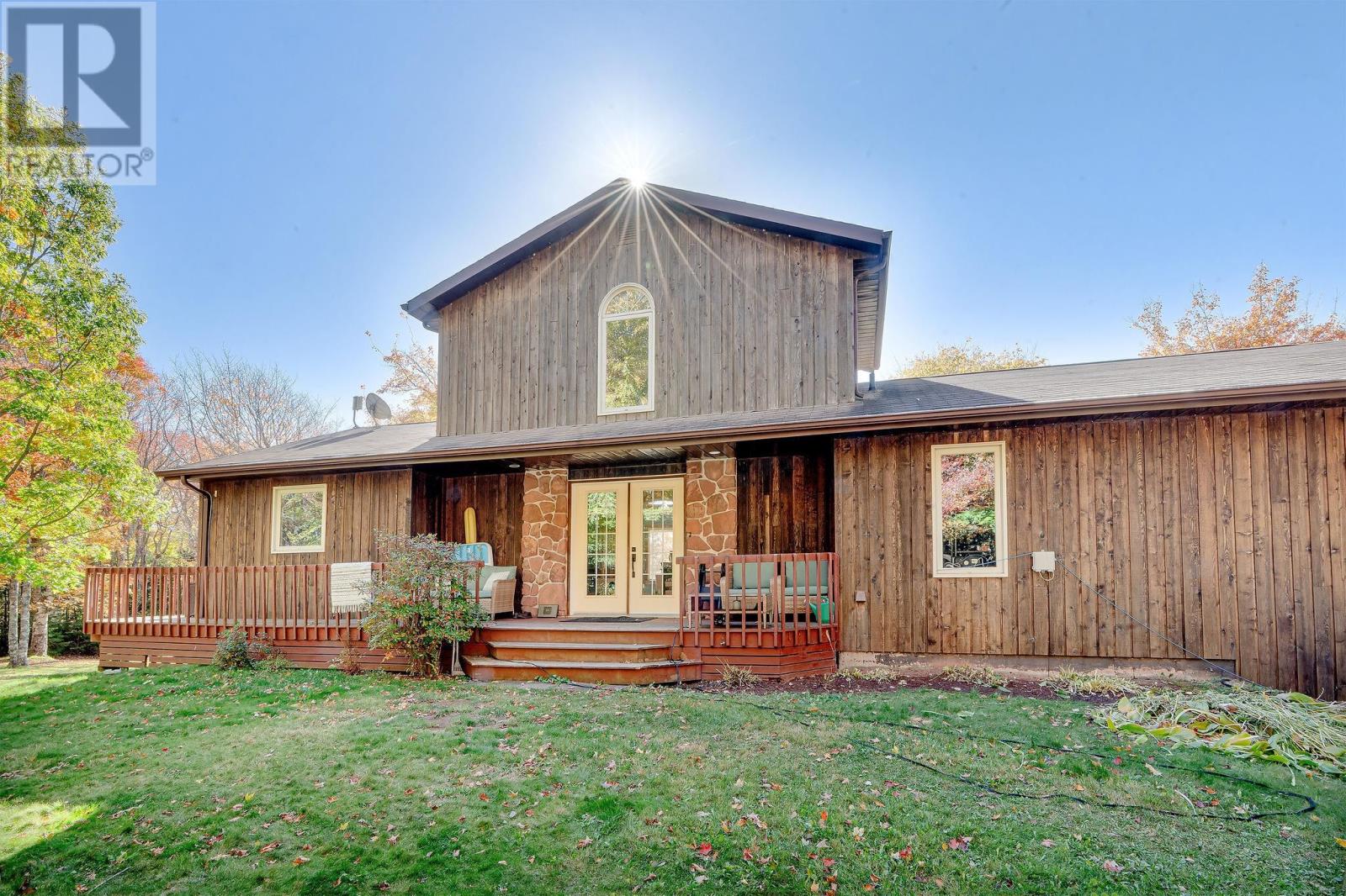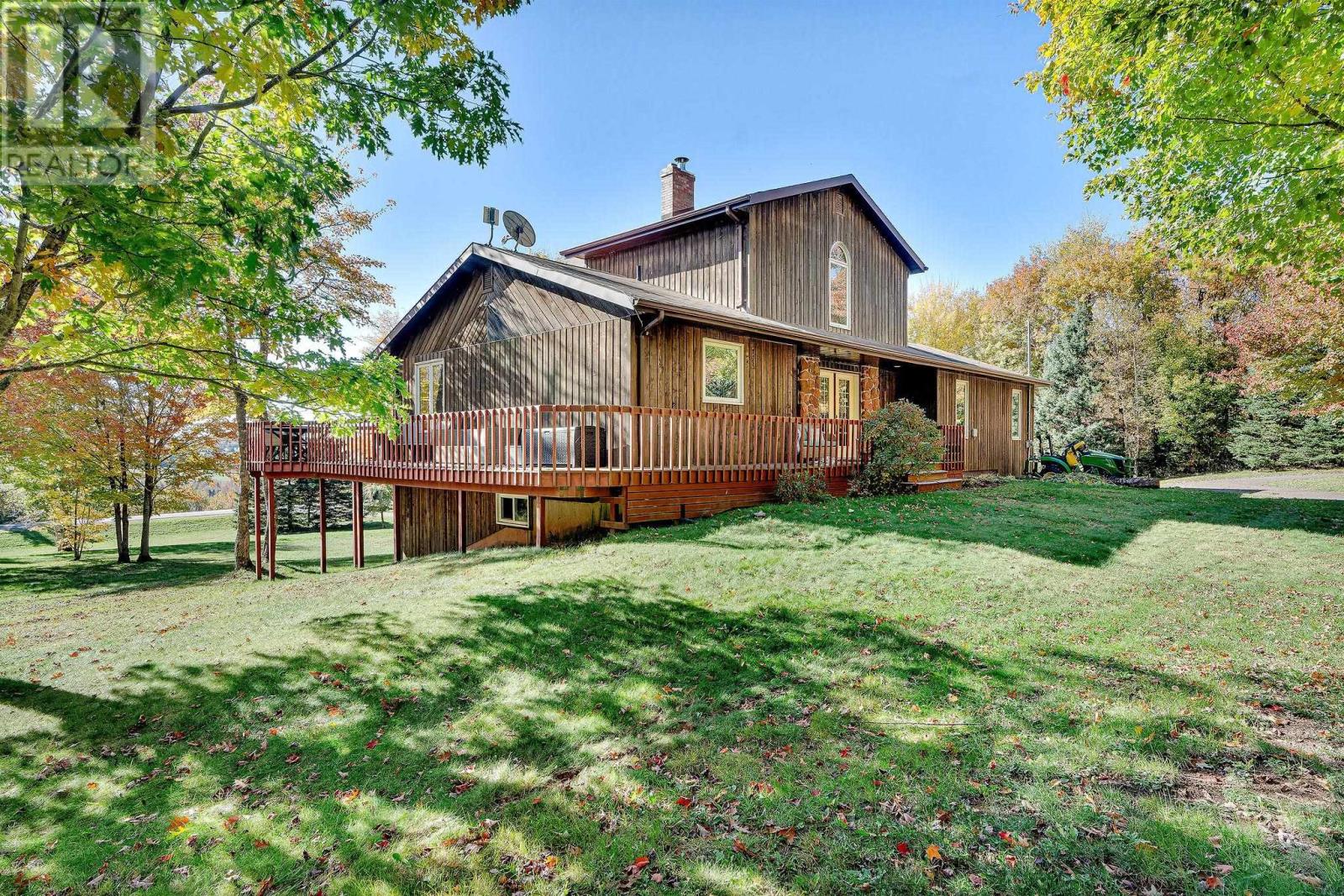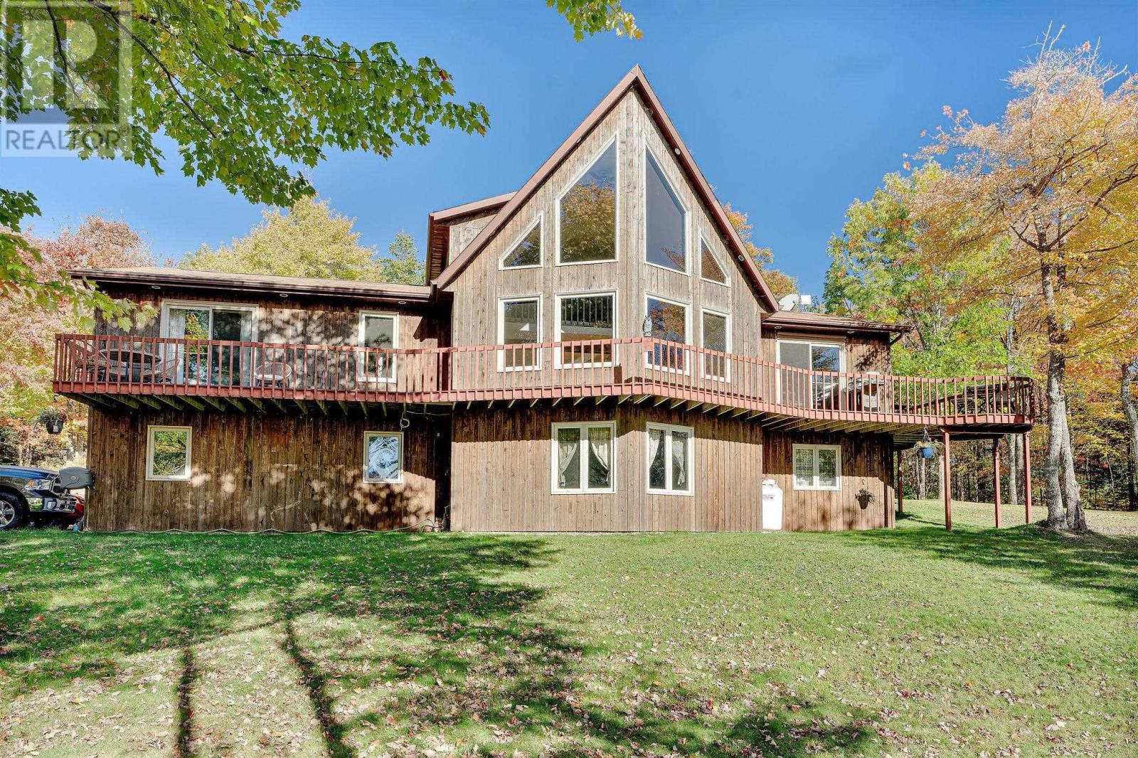 Stunner on over two private acres with southern exposure overlooking the rolling hills of New Glasgow. Main level: entrance opens to the living room with soaring ? two level ? ceilings, renovated kitchen opens to the dining area on the left, two bedrooms, full bath and separate laundry on the right. Curved staircase off the entrance leads to the loft area overlooking the living room and out through the 2nd story windows south over New Glasgow. Lower level: double garage, rec room, 3-piece bath, bedroom, utility room. Main level deck wraps around three sides of the home. There is an above ground pool in the back yard and an oversized shed. Hardwood trees dot the center of the property and evergreens provide privacy on the outer edges. A rare find. (231809579)