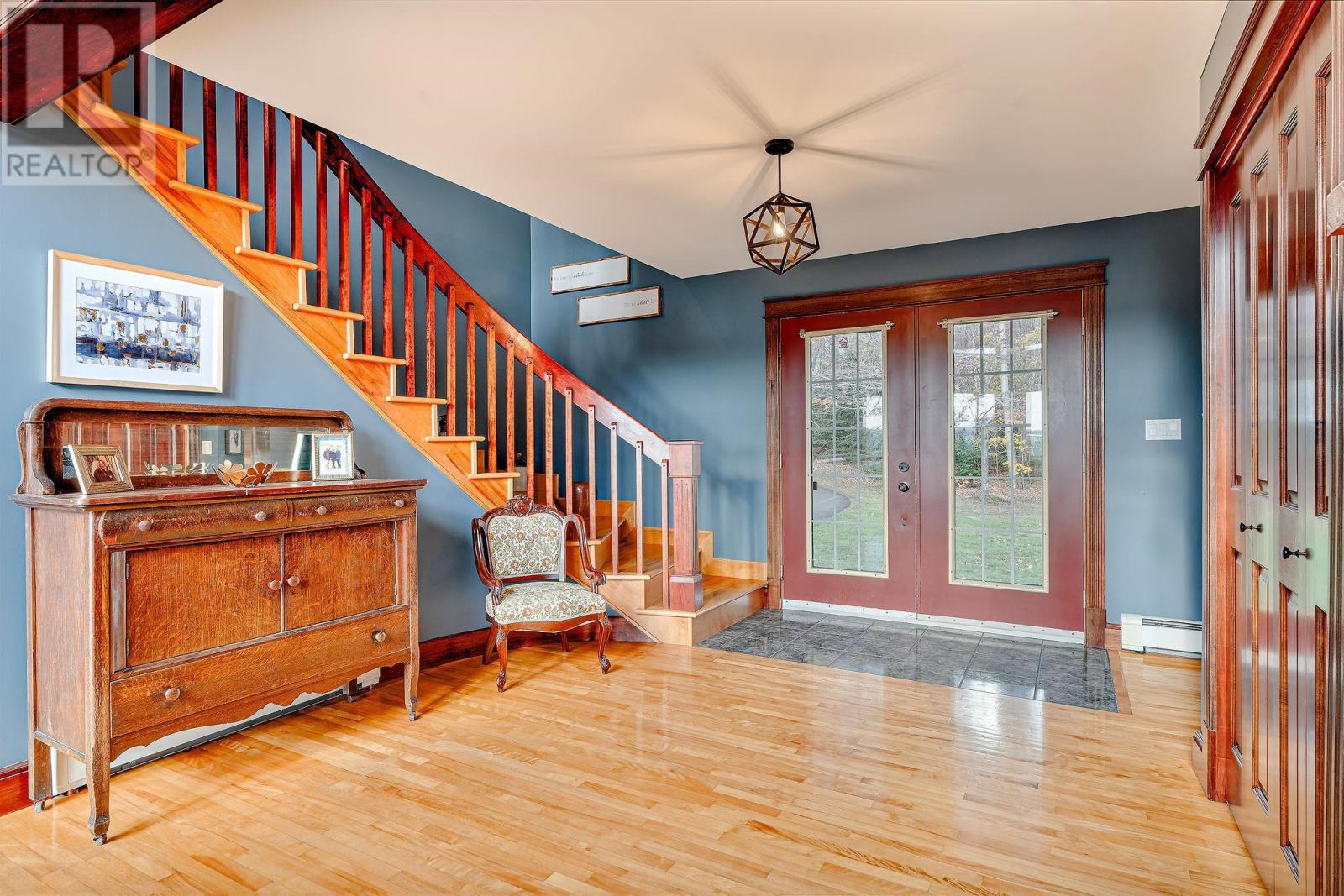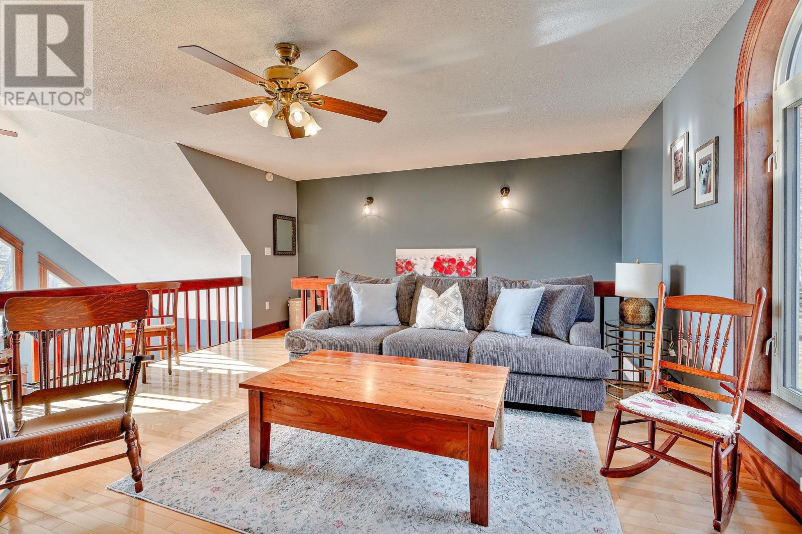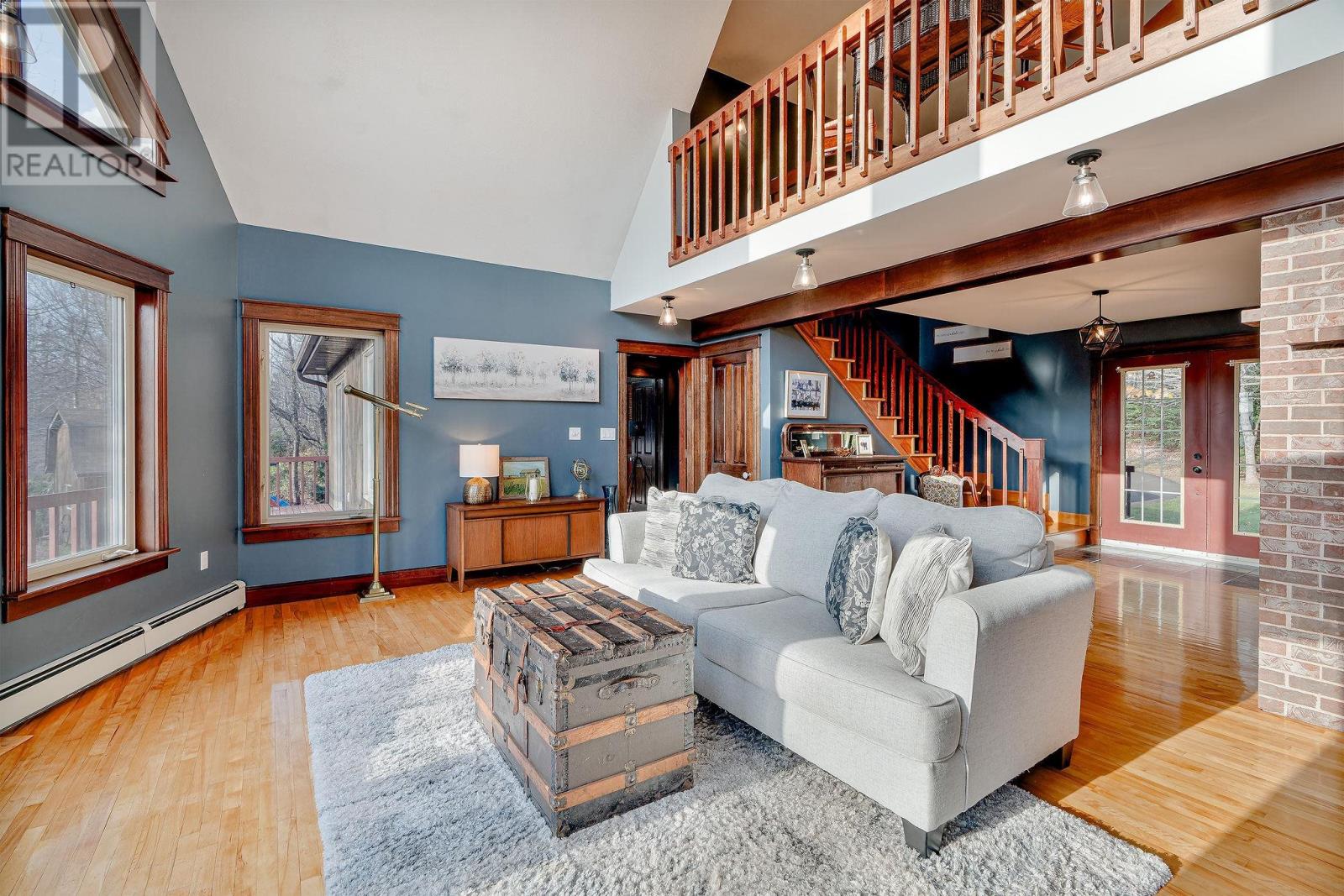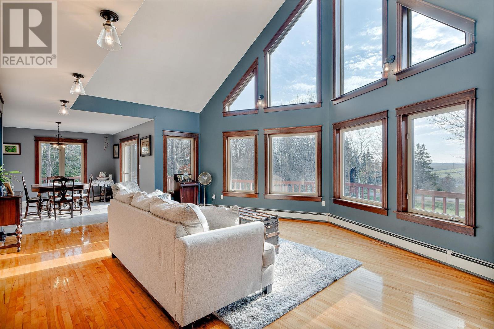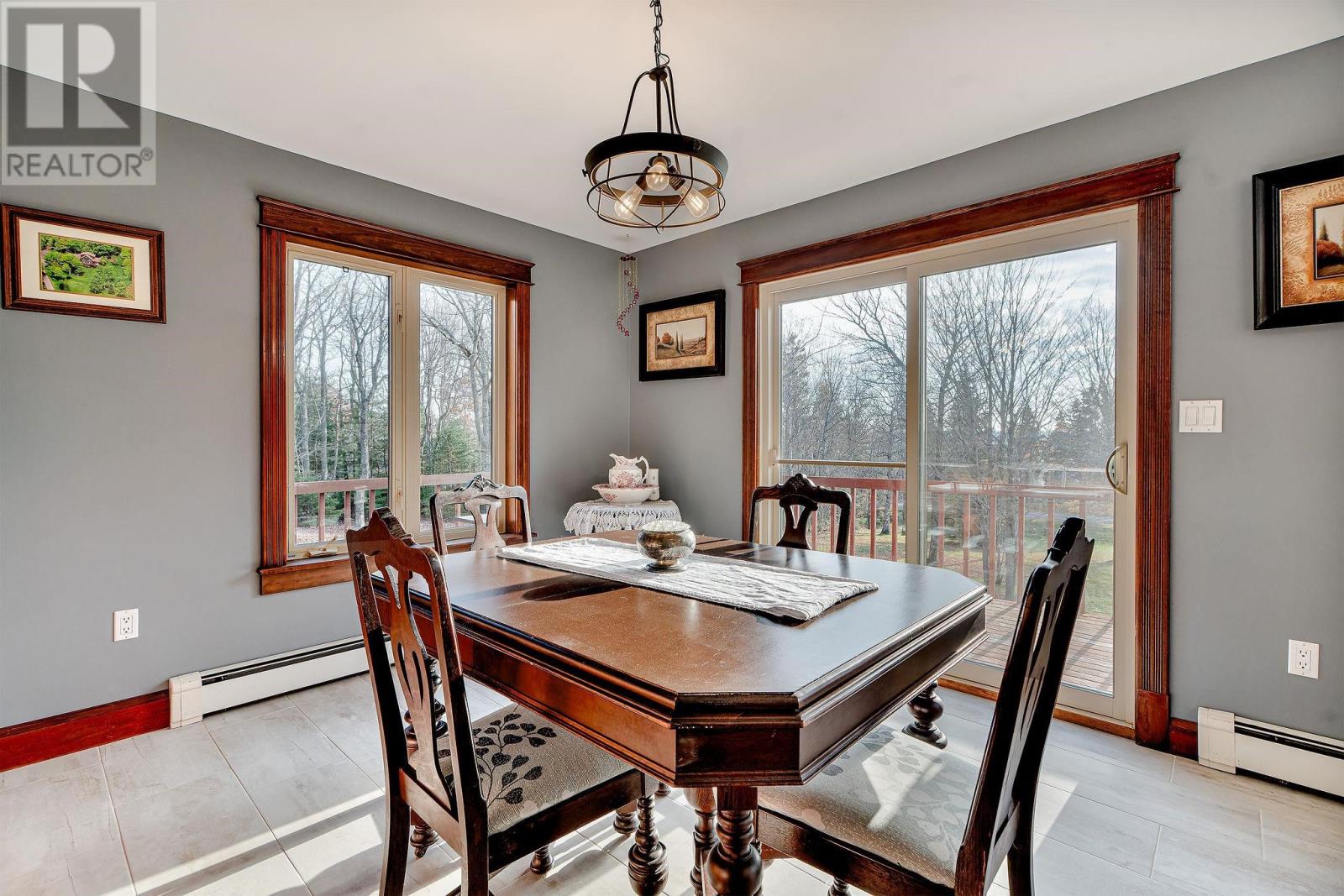 Stunner on over two private acres with southern exposure overlooking the rolling hills of New Glasgow. Main level: entrance opens to the living room with soaring ? two level ? ceilings, renovated kitchen opens to the dining area on the left, two bedrooms, full bath and separate laundry on the right. Curved staircase off the entrance leads to the loft area overlooking the living room and out through the 2nd story windows south over New Glasgow. Lower level: double garage, rec room, 3-piece bath, bedroom, utility room. Main level deck wraps around three sides of the home. There is an above ground pool in the back yard and an oversized shed. Hardwood trees dot the center of the property and evergreens provide privacy on the outer edges. A rare find. (231809579)