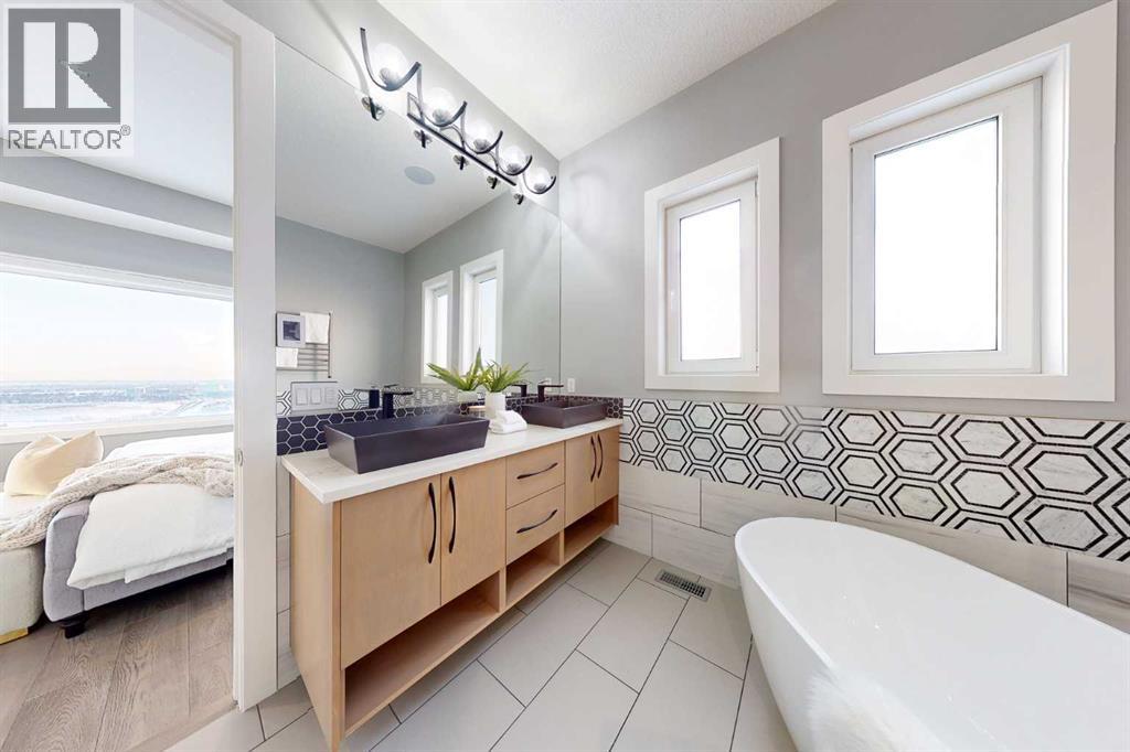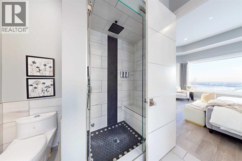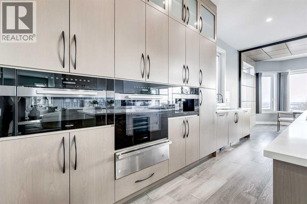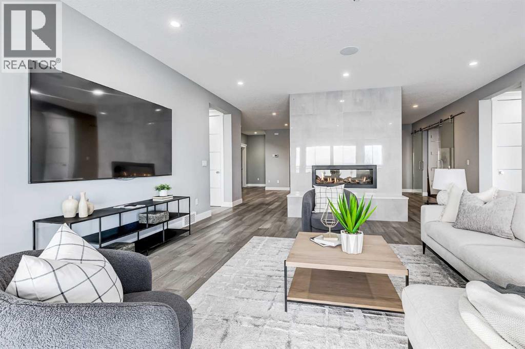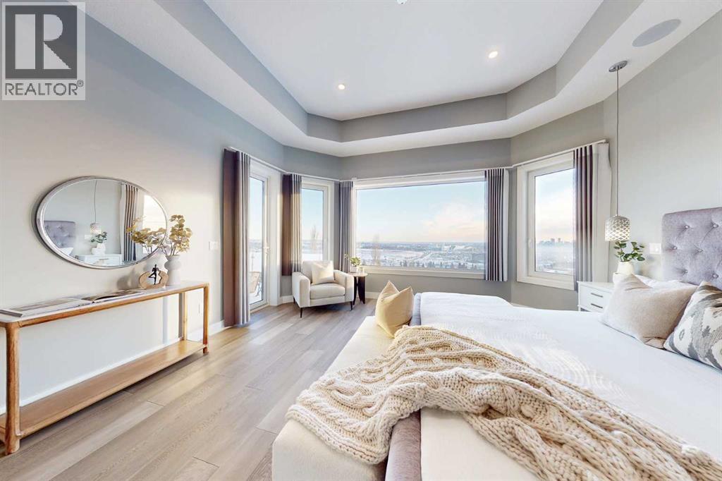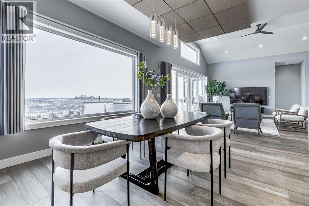 Perched high above the city in the prestigious community of Patterson, this custom luxury bungalow offers unobstructed, panoramic views of downtown Calgary and the skyline from all three fully developed walkout levels. Architecturally designed and built to a high standard, the home blends refined design, functionality, and long-term livability in a private, elevated setting just minutes from the city core.The main level is designed for sophisticated single-level living, with expansive windows that flood the home with natural light and frame breathtaking city views. The open-concept living and dining areas are anchored by a striking see-through gas fireplace, creating warmth and architectural interest while maintaining uninterrupted sightlines. Vaulted and tray ceilings enhance the sense of scale, complemented by wide-plank engineered hardwood flooring and timeless finishes. The chef-inspired kitchen features premium cabinetry, a large central island, high-end appliances, and seamless flow into the dining area, ideal for entertaining. A fully equipped spice kitchen provides additional prep space and storage. The primary suite is a private retreat with panoramic views and a spa-inspired ensuite featuring heated floors, a deep soaker tub, steam shower, and walk-in closet. A private office or den, powder room, breakfast nook, and functional mudroom with direct garage access complete this level.The first lower level is fully developed and walkout, offering excellent flexibility while maintaining the same level of finish. This level includes a spacious recreation room, family lounge with city views, a dedicated home gym with custom flooring and sliding glass barn doors, two generously sized bedrooms, beautifully finished bathrooms, a full laundry room, and direct outdoor access.The lowest level is designed for entertainment and guests, featuring a large media and theatre room with golf simulator capability, a kitchenette or wet bar, additional bedrooms, a full bathr oom, second laundry area, and integrated storage and mechanical spaces.Additional highlights include a heated triple attached garage with exceptional ceiling height allowing for a vehicle lift, epoxy flooring, side wall-mounted openers, and space for up to four vehicles. The home is roughed-in for a future elevator and offers multiple walkout patios and decks with glass railings and gas connections. Integrated audio, smart lighting, premium mechanical systems, and an optional landscaping package further enhance the property.Located in one of Calgary’s most desirable westside communities, Patterson is known for its elevated setting, mature surroundings, city views, and proximity to downtown, parks, and amenities. (31486635)