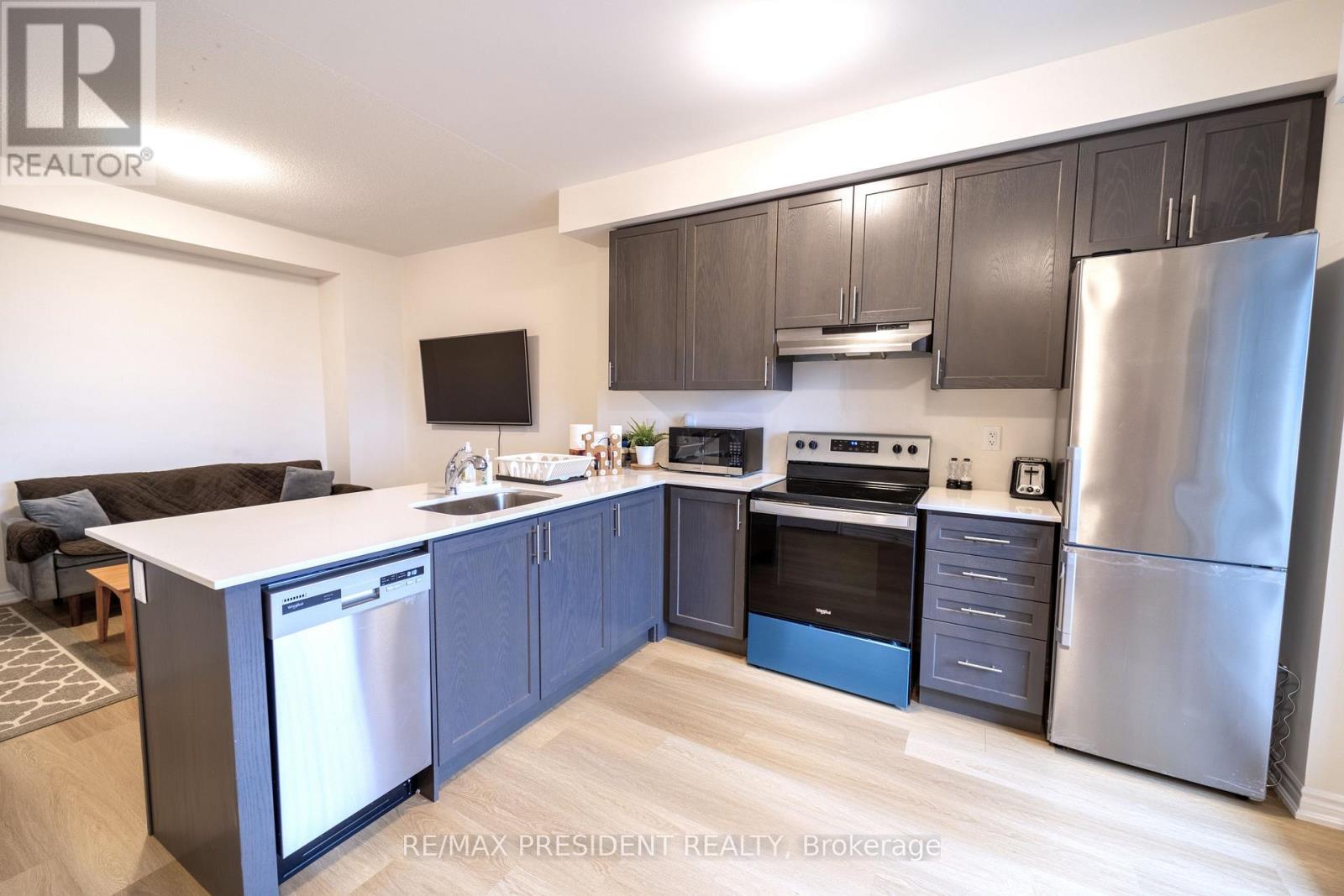TWO-PARKINGS INCLUDED.... This stunning, nearly new home, features two spacious bedrooms and an open-concept family room layout, creating a fresh and welcoming atmosphere. As you enter, you're greeted by a light-filled living/family room adjacent to a spacious kitchen. The kitchen boasts a large island with a breakfast bar, quartz countertops, and stainless steel appliances. The dining area is conveniently located next to the kitchen, with a walkout balcony perfect for enjoying beautiful sunlight. The main floor's open layout features 9-foot ceilings and hardwood flooring, enhancing the sense of space and elegance. Downstairs, you'll find two roomy bedrooms with double sliding door closets and large windows, ensuring plenty of natural light. Additional storage is available in the utility room. A unique highlight of this property is the inclusion of 2 Parking Spots are a rare find! This townhouse also offers ample visitor parking, ideal for family gatherings. Located just 1 minute to 401 and 9 mins to Go-Station (41869473)