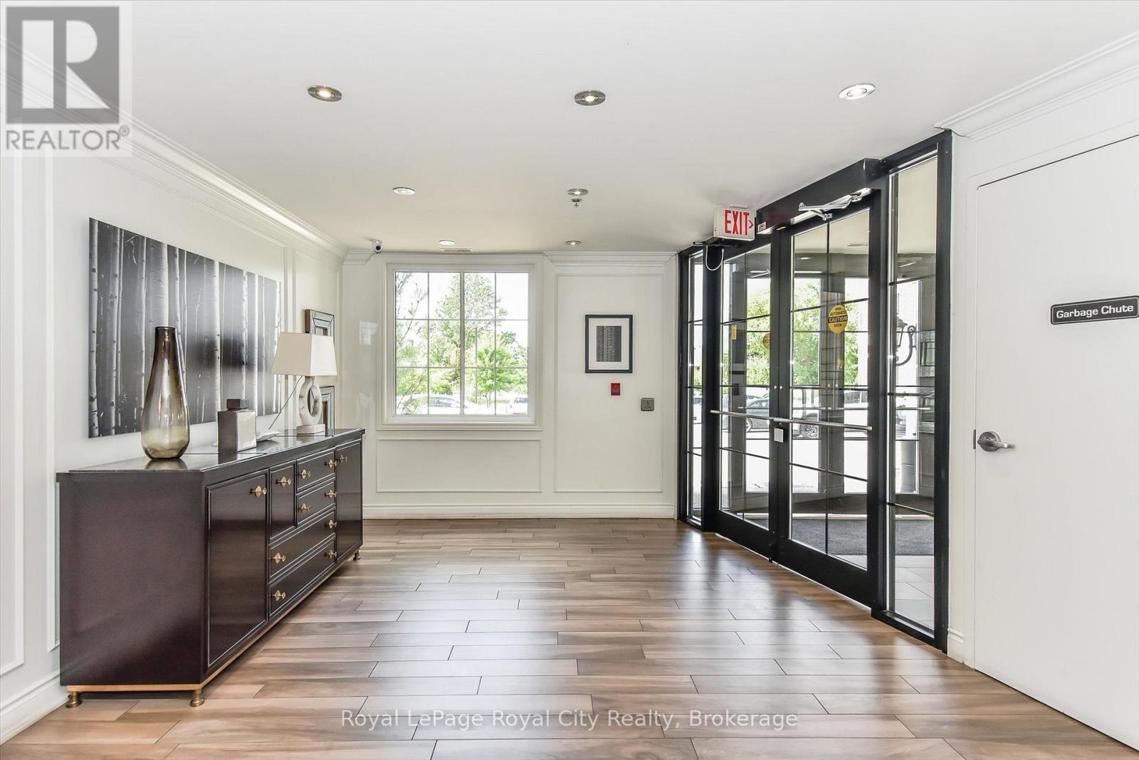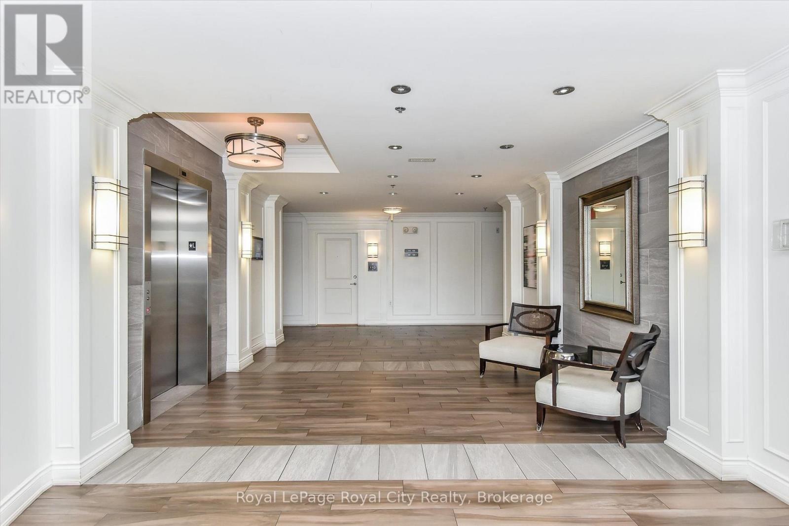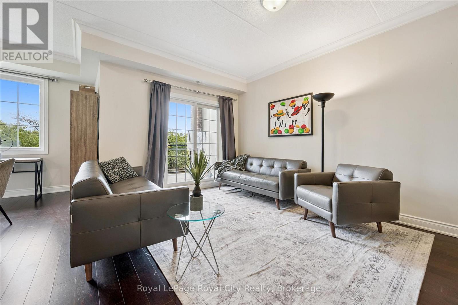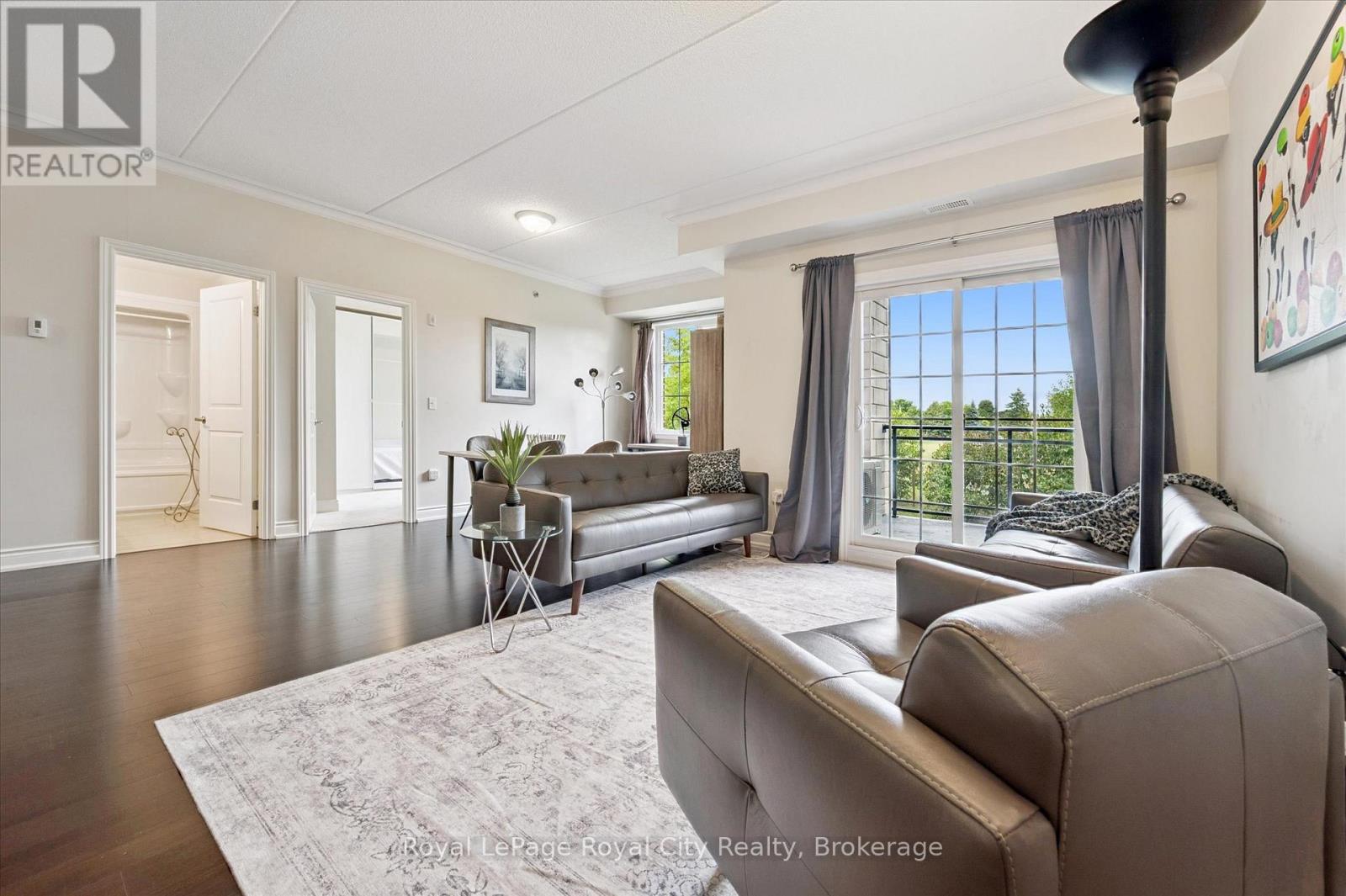 This main-floor executive suite offers the perfect blend of luxury, convenience, and location. Situated in an amazing east-facing position overlooking the park, this spacious 1,192 sqft unit- the largest in the building- showcases beautiful sunrises from its private balcony. Just a 15-minute bus ride to the University of Guelph, the unit features a bright open-concept floor plan with soaring 9' ceilings, creating a modern and airy feel throughout. The updated kitchen is a chef's dream, complete with rich cabinetry, a marble backsplash, stainless steel appliances, granite countertops, and an island with a breakfast bar. The living and dining areas boast engineered wood flooring and flow seamlessly together, ideal for entertaining or relaxing at home. The primary bedroom offers a walk-in closet and a luxurious 5-piece ensuite with a corner tub and separate shower, wood cabinetry and granite countertops, while the second bedroom also enjoys ensuite privilege to a 4-piece bathroom with granite. Additional highlights include in-suite laundry, an owned on-demand gas water heater, a storage locker, and a secure underground parking spot. (41878301)