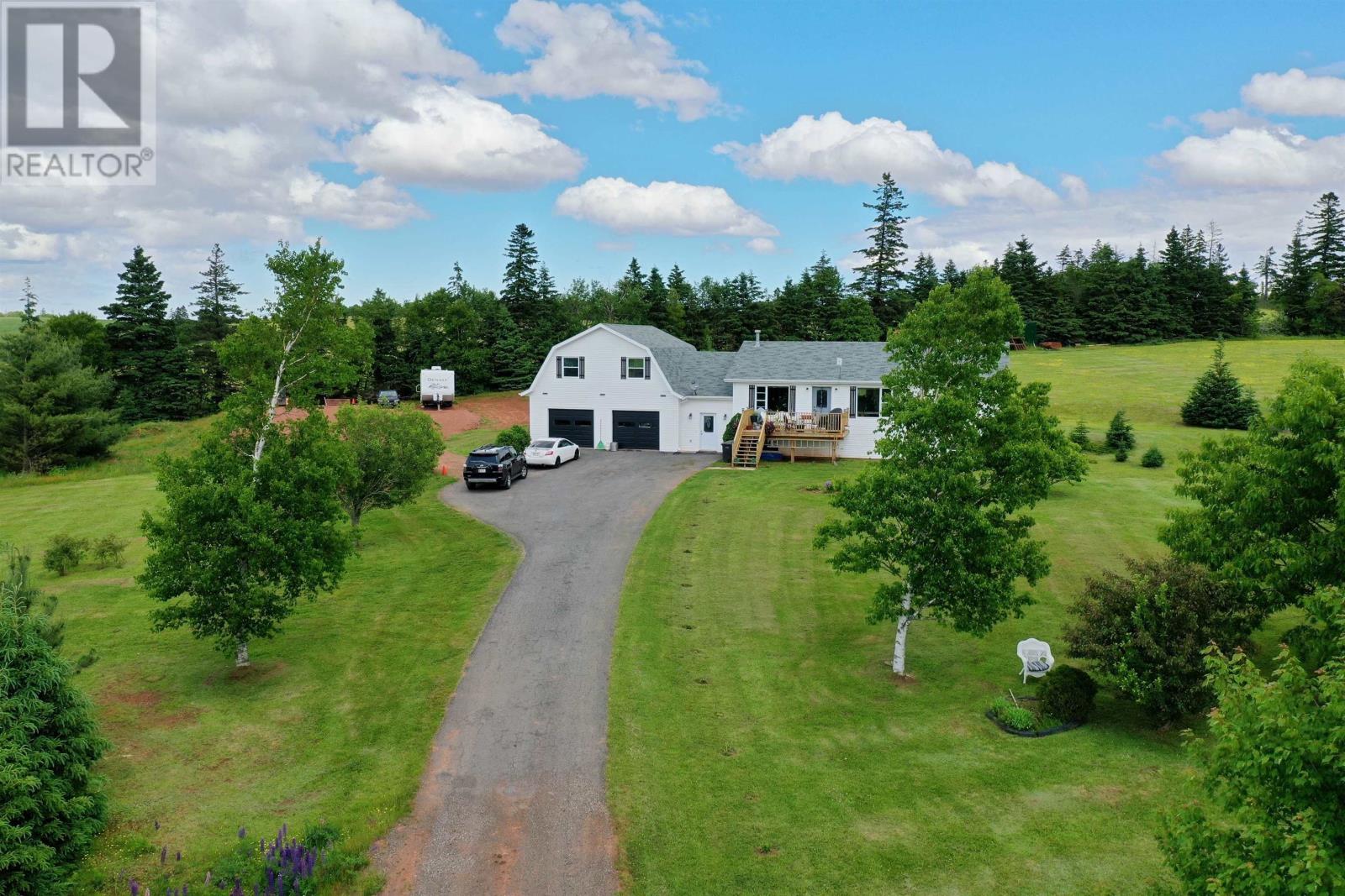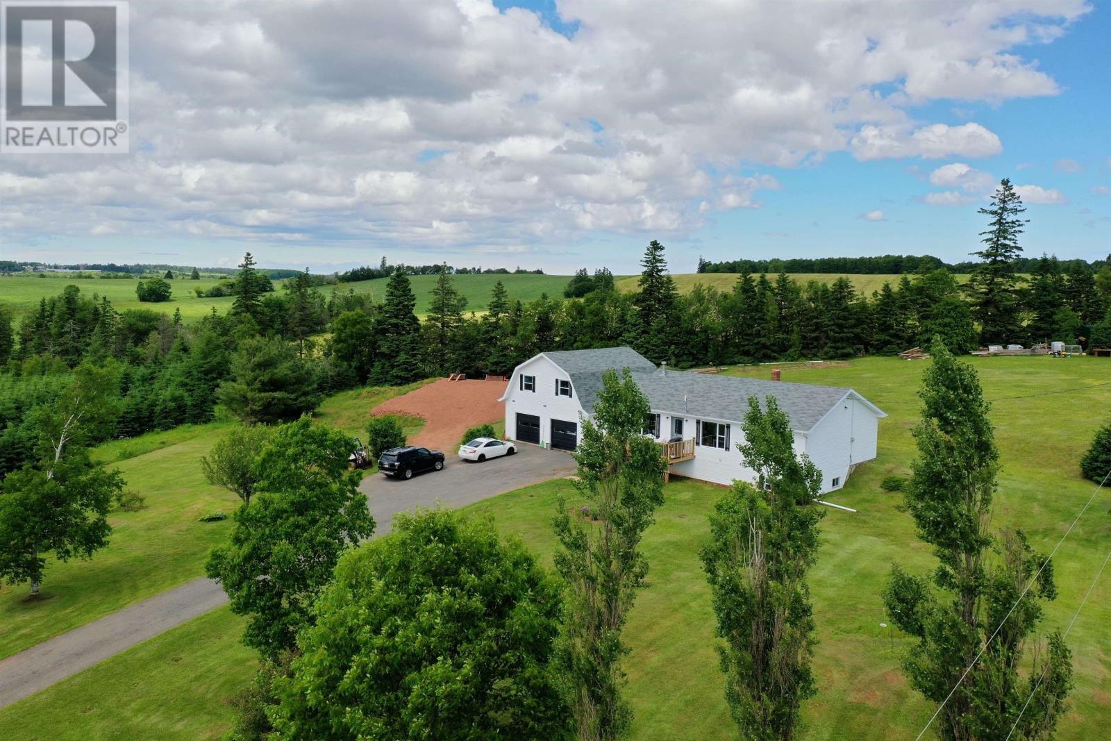 Gorgeous 5 bedroom home on 6.77 private acres in central PEI. Only a short 20 minute drive to the city of Charlottetown for shopping, airport and QEH. Incredible countryside views nestled on a private setting among the rolling hills in Hunter River and close to everything such as beaches, golf courses, gas stations, parks, stores, schools, churches, banks, walk trails, restaurants, coffee shops, Harmony House & Lions club, community centre and so much more. This beautiful home features attached large 2 car garage, an open concept kitchen, dining & living room with new floors, fully equipped kitchen with fridge, oven, cooktop and dishwasher and a beautiful cozy propane fireplace in the living room. Main level laundry room and space off the entrance for an office. Wake up every morning and enjoy your coffee in this beautiful country setting on 6.77 acres. This well-appointed home has todays most desired features, impressive primary bedroom with large closets, heat pump and a patio door that leads to a private back deck. Main level also has 2 guest bedrooms and there is 2 more bedrooms downstairs with a second bathroom. The lower level has a wonderful entertaining area in a beautiful finished lower level. This fabulous 5 bedroom home is in an exceptional location only 15 minutes from Charlottetown and is very spacious throughout, plus has many fabulous features such as a gorgeous yard and easy access to the 2 car garage. There is already a large shale pad to build a large shop or barn. Here are some of the great updates: Heat pump 2021, Septic pumped NOV 24, 2025, added septic riser and green cover, newer flooring in kitchen, dining and living room 2021, Shale pad 40x40 for barn/ workshop 2021, New automatic garage doors 2021, washer and dryer 2021, New hot-water tank 2021, new window panes in the primary bedroom. All measurements are approximate and to be verified by the Purchaser if deemed necessary.. (231816046)