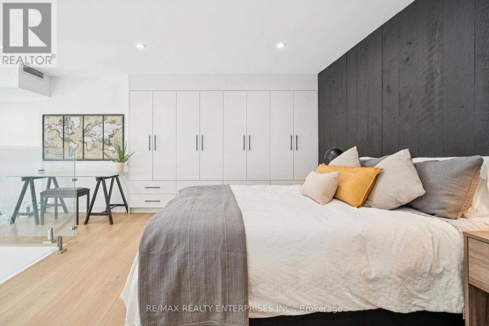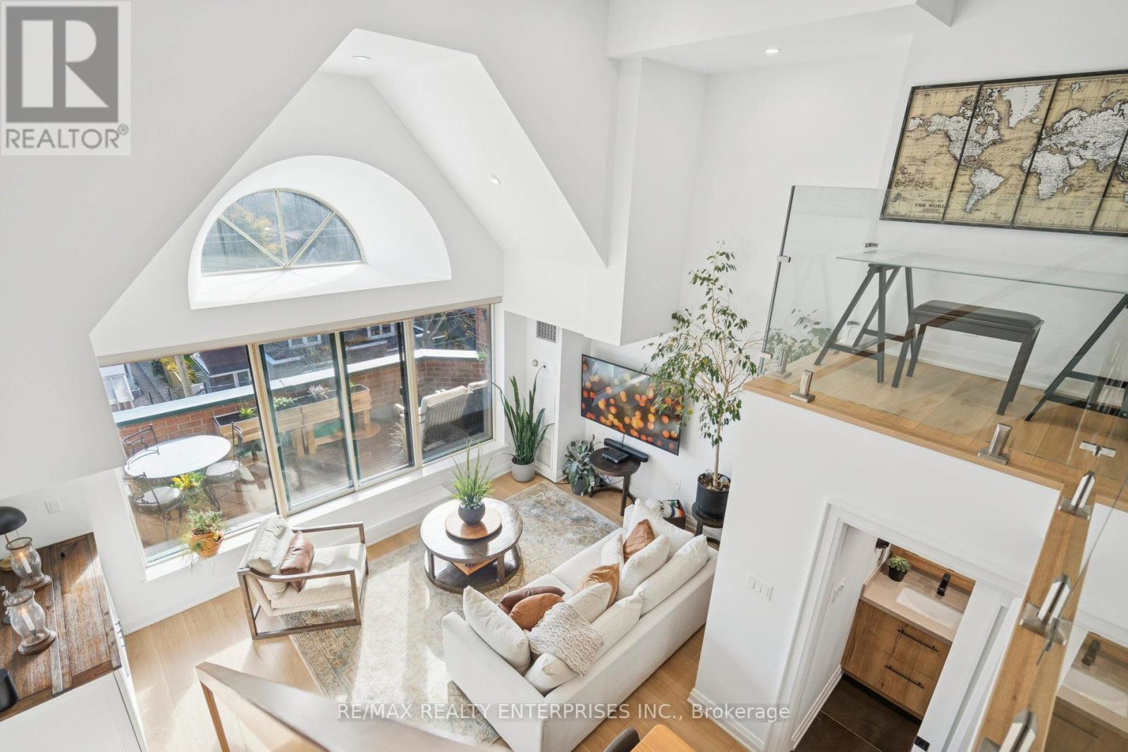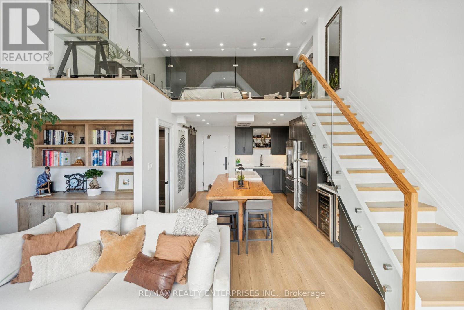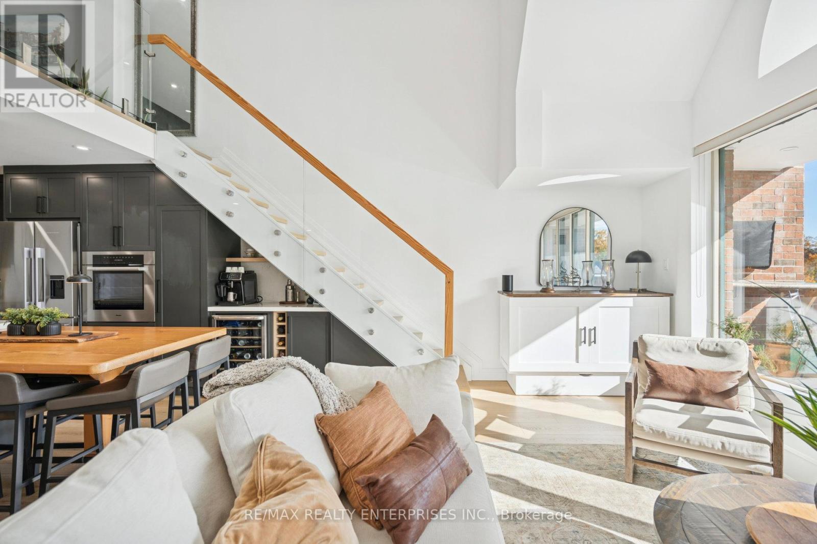 Nestled in the heart of Downtown Oakville, at Towne Square, this Penthouse retreat at The Ashbury, fully renovated in 2025, redefines executive luxury living. This extraordinary, 1,100sqft 1-bedroom + Den, blends historic character with modern sophistication. This grand suite, crowned by soaring 18-foot ceilings and expansive windows, is bathed in lots of natural light, creating a serene and inviting atmosphere. The chef-inspired kitchen is a true masterpiece, featuring an iconic 1896 reclaimed wood beam island from Toronto's original Simpson's Store (the first department store in Canada), outfitted with high-end full-sized appliances,including a Miele built-in oven and Fisher & Paykel range and fridge. Thoughtfully designed tomaximize space, this unit includes a custom Beverage Station complete with an espresso machineand wine fridge, ideal for refined entertaining or quiet indulgence. The graceful glass andwood staircase leads to a bright open-concept bedroom with abundant closet space and a spaciousden overlooking the grand room, perfect for inspired work or relaxation. Step outside to the private balcony, equipped with a built-in TV and planters for herb gardening for dining and entertainment. Located steps from Oakville's finest boutiques, Michelin-starred restaurants,the Marina, Oakville Club, Library, and Performing Arts Centre. This unit offers an unmatched urban-lakeside lifestyle, including One Parking spot with an EV charger and a Storage Locker. A rare opportunity to lease Oakville's most historic district, where design and luxury living unite. (41883081)