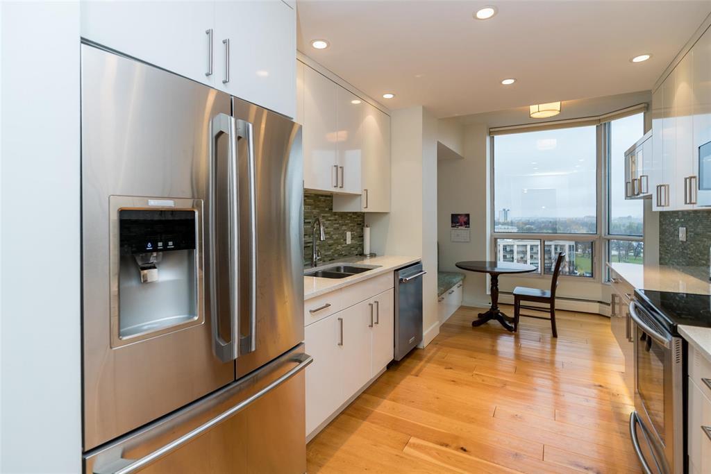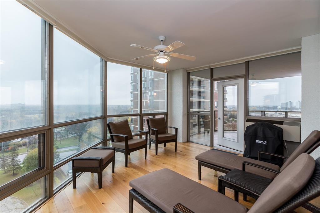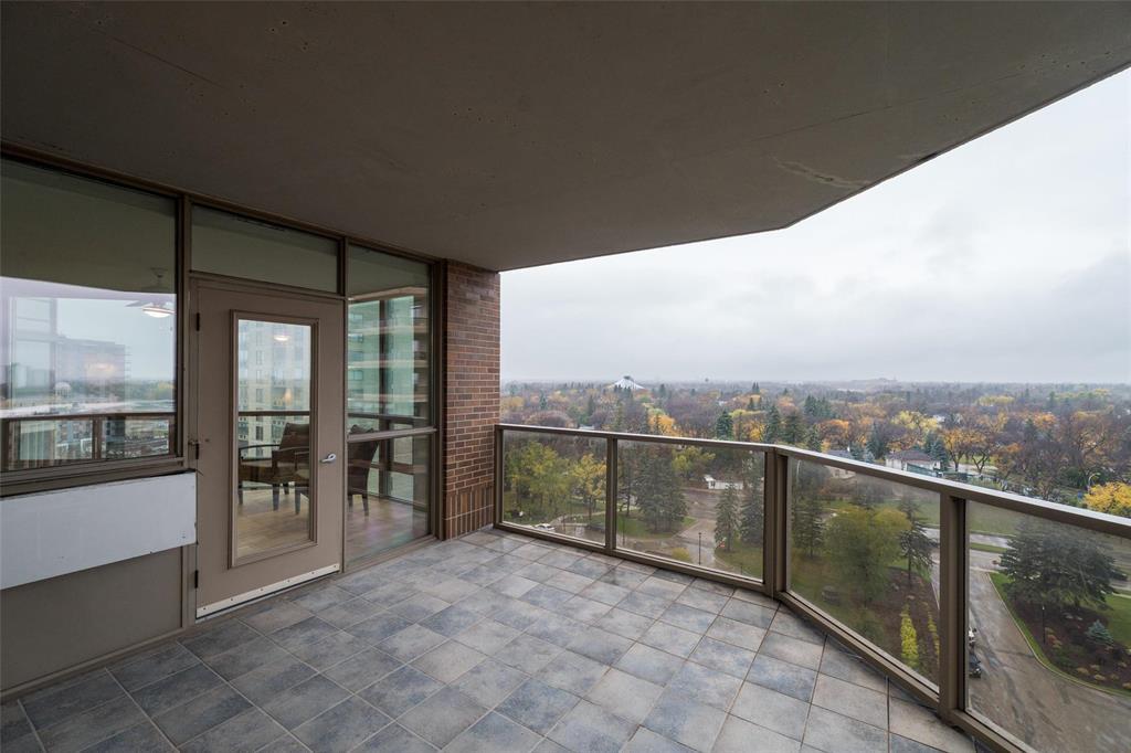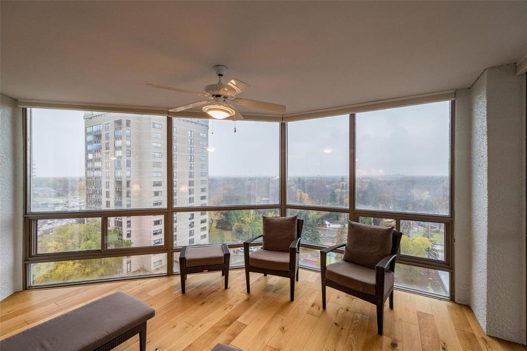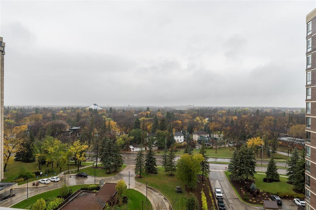 1E//Winnipeg/This is a fabulous condo in this highly desirable building. The condo has been tastefully updated throughout featuring amazing kitchen with high end appliances quartz countertops and spacious and bright breakfast area, The generous primary bedroom offers a deluxe spacious ensuite with walk-in spa tub and large glass walled shower. The main living area is open concept great room style with dining area and living room area entering onto a spacious den and to a four season sunroom. There is a large open balcony off the sunroom both of which offer spectacular views to the west/northwest/Assiniboine Park. All the huge exterior windows have custom Hunter Douglas remote control blinds. There is a an additional 2 piece bathroom and large ensuite laundry room with Miele appliances. There is an underground parking space with valet service if require. This is an absolutely wonderful condo home. Check it out soon you will love it! Contact the listing agent re the condo fee explanation (231818834)