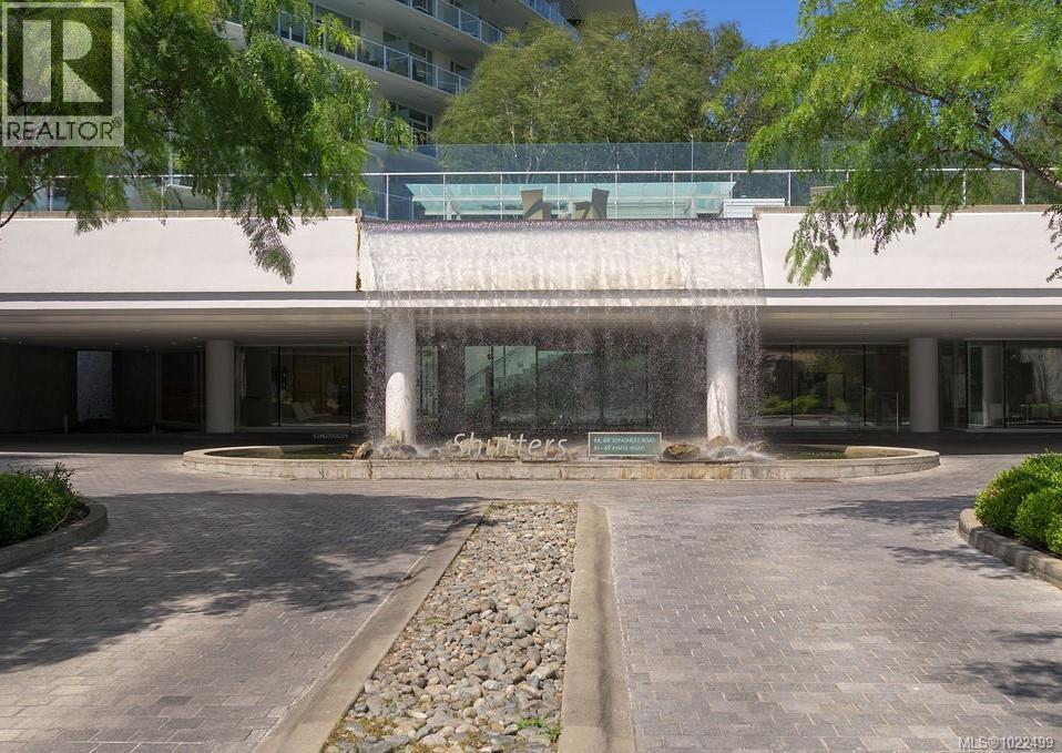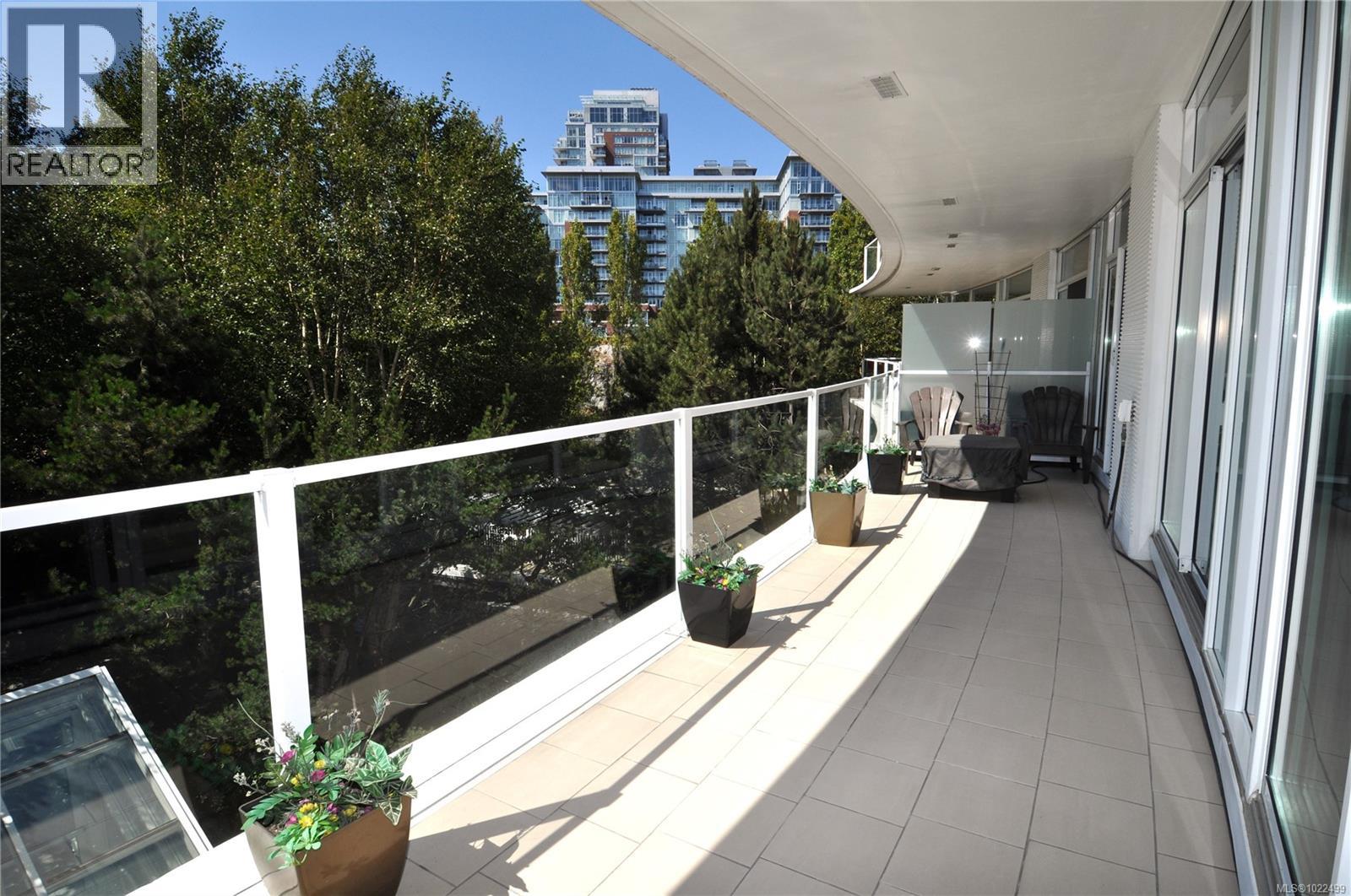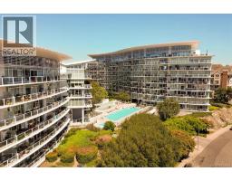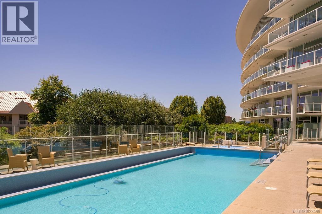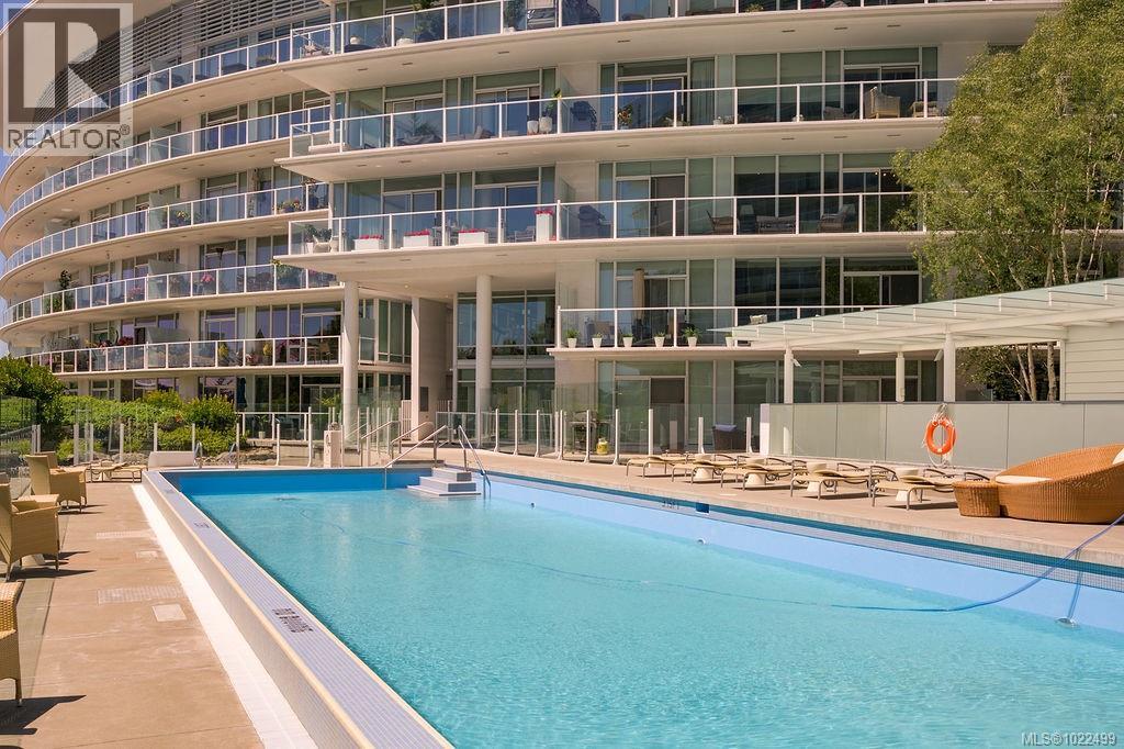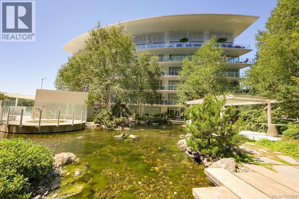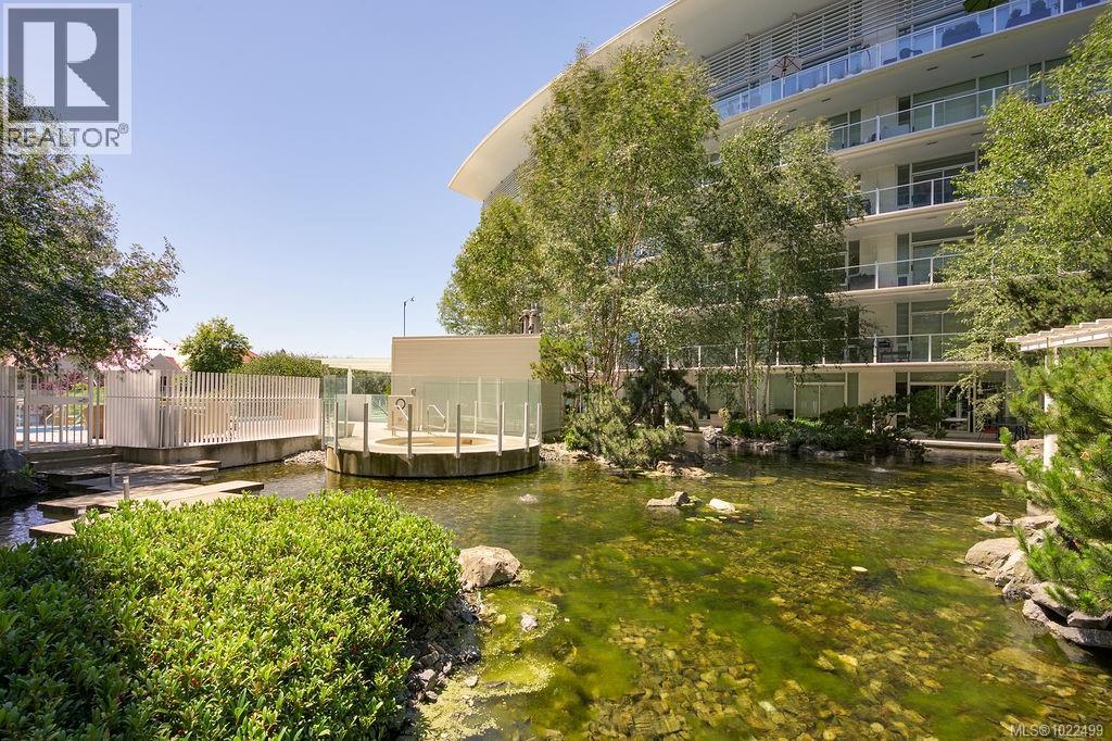 BEST of the SONGHEES - Discover Shutters Residences - A prestigious address in Victoria's Inner-Harbour. Premier 3-acre architecturally unique property enhanced by tranquil water gardens and resort-styled amenities: Heated outdoor seasonal lap pool, 2 hot tubs, steam room, sauna & fitness centre available year-round. This exquisite 3rd floor 2 bedroom suite with seasonal Middle-Harbour views comes with striking contemporary interior, 2 full bathrooms-both with transom windows for natural lights, 3 sets of sliding glass doors presenting floor to ceiling windows in living room & both bedrooms, bonus 3 sets of disappearing retractable phantom screens provide energy efficient crossed ventilation to improve air quality and thermal comfort as needed, engineered wood-floors thru-out living/dining, hallway and bedrooms including W-I closet, heated marble floor in spa-liked ensuite, high quality S.S. appliances with granite tops kitchen and 215 S/F entertainment sized balcony with serene views over water garden comes with power and natural gas hose bib for the BBQ and/or Fire Pit to add to the ambience. Come enjoy the beauty of Victoria's vibrant waterfront surrounded by sea-walks, just minutes stroll to downtown yet removed from hustle/bustle of the core. Cycle, kayak, walk - everything is moments from your door. Suite has been used very lightly past number of years - Shows BEAUTIFULLY and priced sensibly well under 2026 BCAA Assessment of $917,000 and available for quick possession! (30242722)