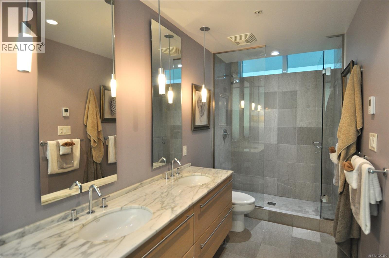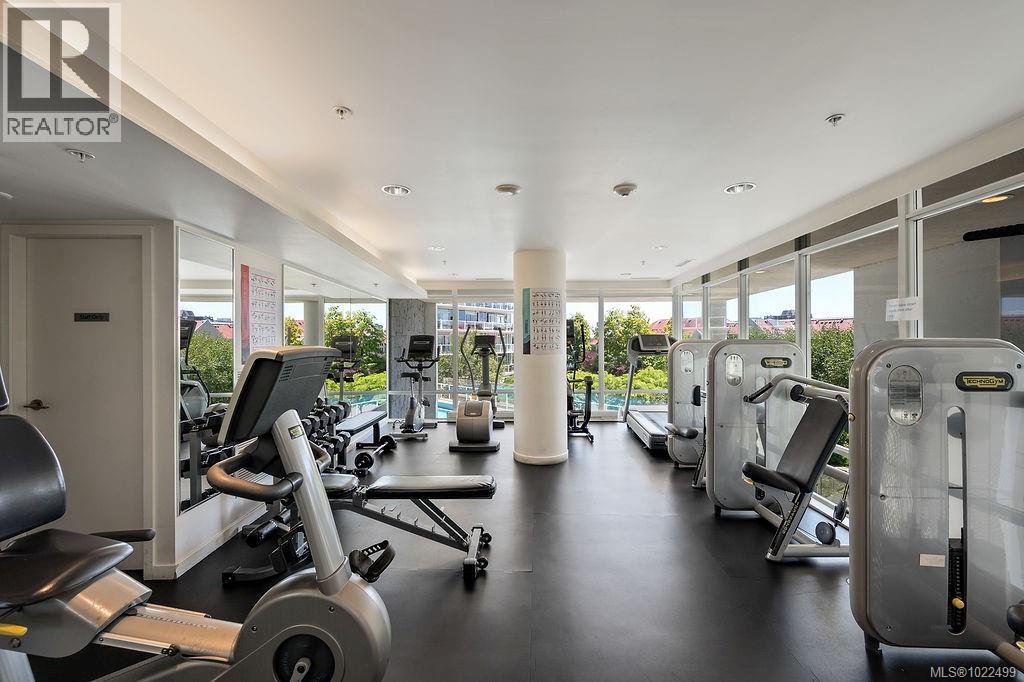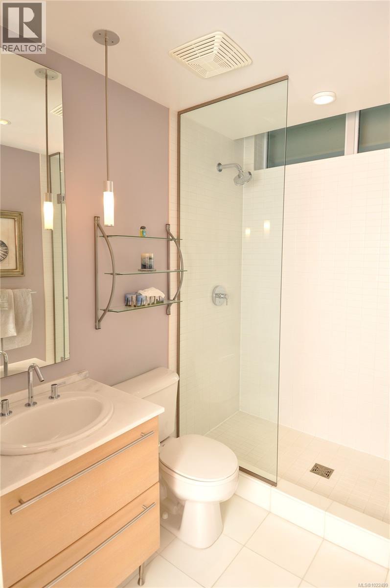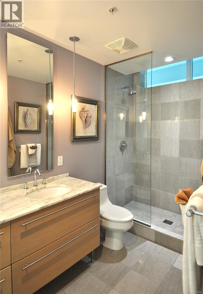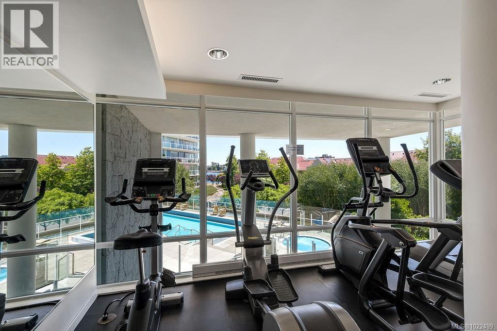 BEST of the SONGHEES - Discover Shutters Residences - A prestigious address in Victoria's Inner-Harbour. Premier 3-acre architecturally unique property enhanced by tranquil water gardens and resort-styled amenities: Heated outdoor seasonal lap pool, 2 hot tubs, steam room, sauna & fitness centre available year-round. This exquisite 3rd floor 2 bedroom suite with seasonal Middle-Harbour views comes with striking contemporary interior, 2 full bathrooms-both with transom windows for natural lights, 3 sets of sliding glass doors presenting floor to ceiling windows in living room & both bedrooms, bonus 3 sets of disappearing retractable phantom screens provide energy efficient crossed ventilation to improve air quality and thermal comfort as needed, engineered wood-floors thru-out living/dining, hallway and bedrooms including W-I closet, heated marble floor in spa-liked ensuite, high quality S.S. appliances with granite tops kitchen and 215 S/F entertainment sized balcony with serene views over water garden comes with power and natural gas hose bib for the BBQ and/or Fire Pit to add to the ambience. Come enjoy the beauty of Victoria's vibrant waterfront surrounded by sea-walks, just minutes stroll to downtown yet removed from hustle/bustle of the core. Cycle, kayak, walk - everything is moments from your door. Suite has been used very lightly past number of years - Shows BEAUTIFULLY and priced sensibly well under 2026 BCAA Assessment of $917,000 and available for quick possession! (30242722)