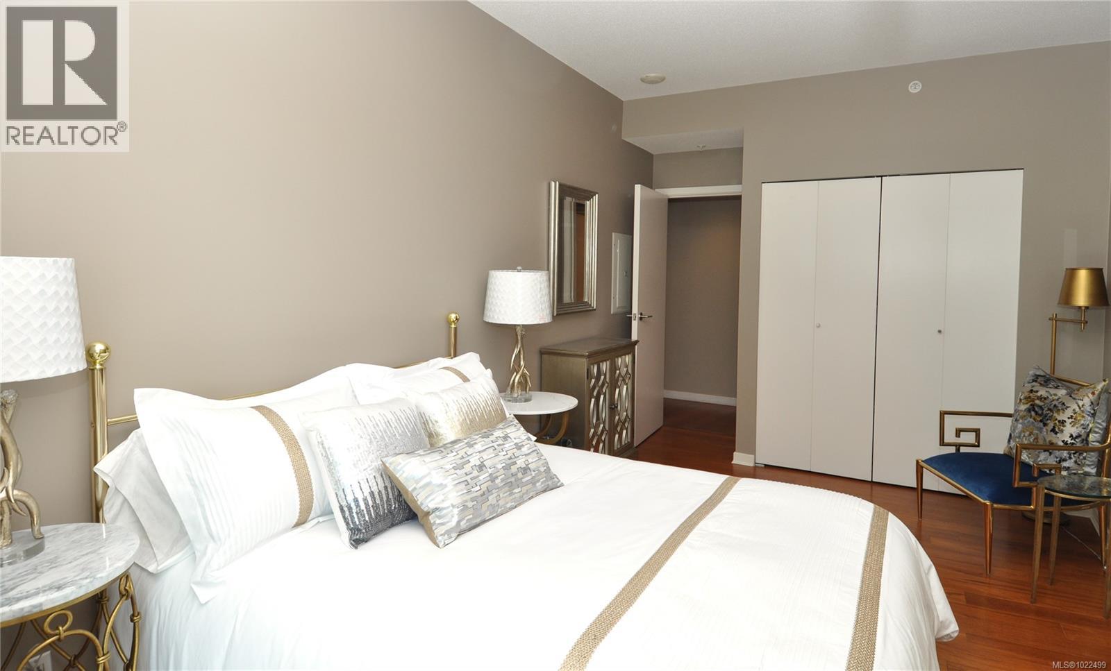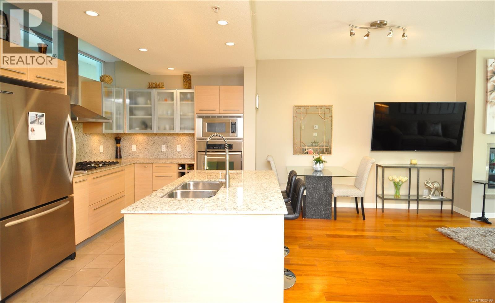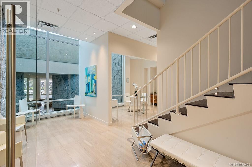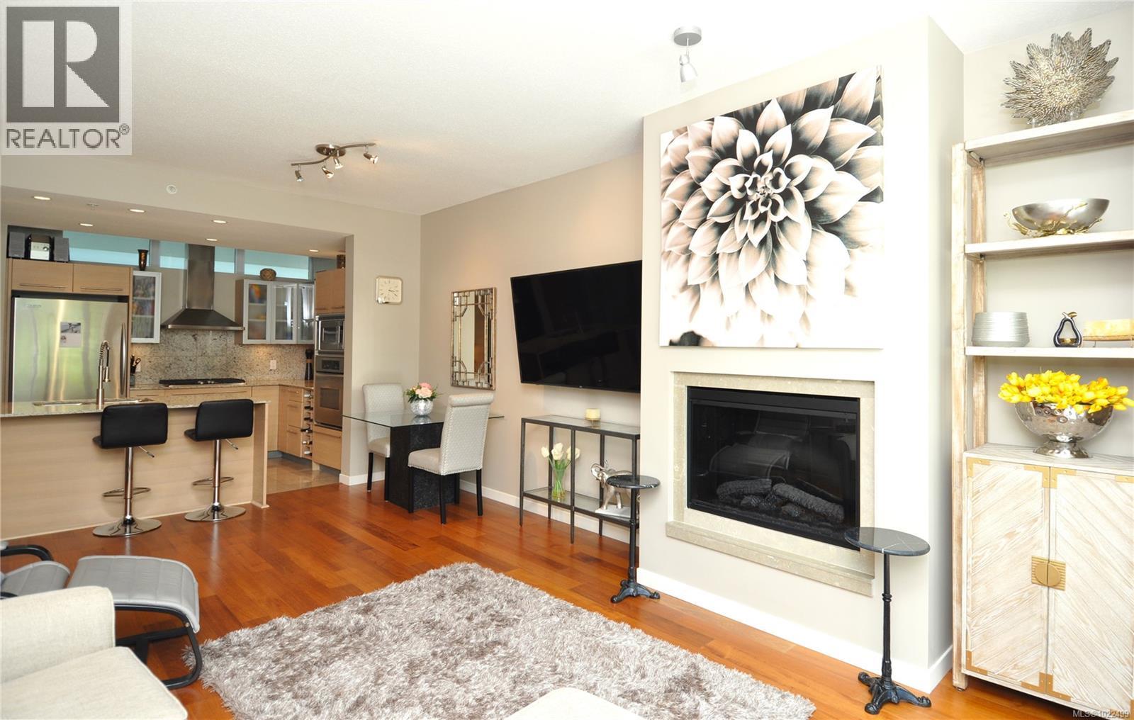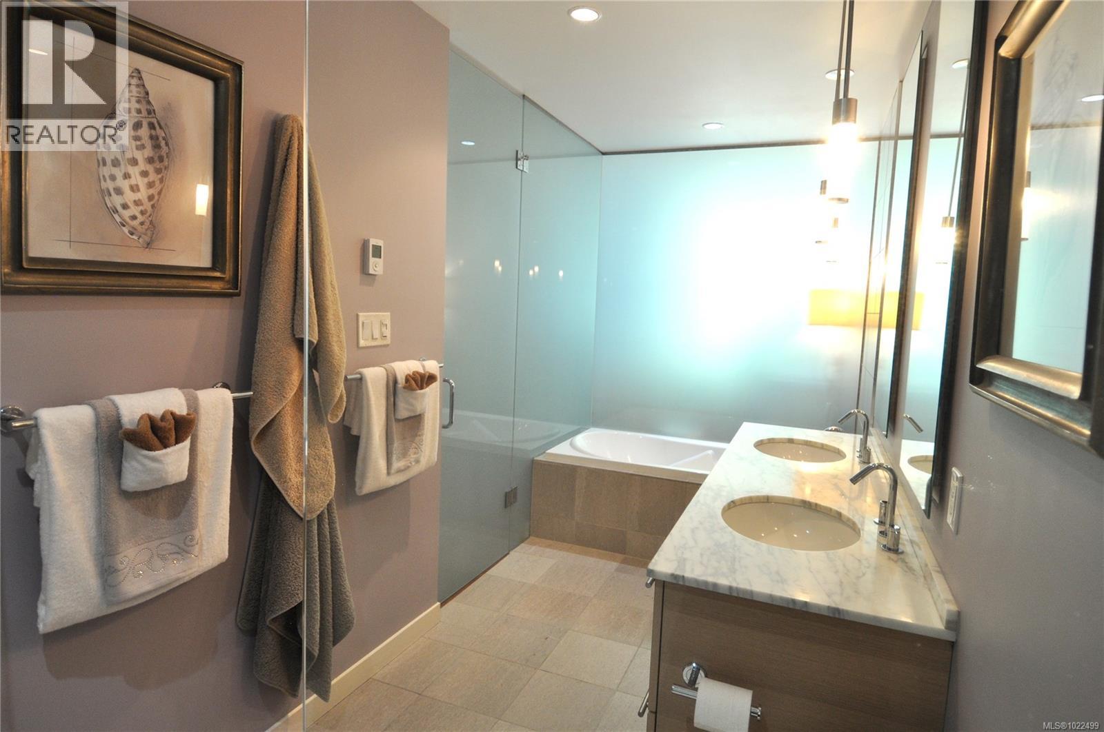 BEST of the SONGHEES - Discover Shutters Residences - A prestigious address in Victoria's Inner-Harbour. Premier 3-acre architecturally unique property enhanced by tranquil water gardens and resort-styled amenities: Heated outdoor seasonal lap pool, 2 hot tubs, steam room, sauna & fitness centre available year-round. This exquisite 3rd floor 2 bedroom suite with seasonal Middle-Harbour views comes with striking contemporary interior, 2 full bathrooms-both with transom windows for natural lights, 3 sets of sliding glass doors presenting floor to ceiling windows in living room & both bedrooms, bonus 3 sets of disappearing retractable phantom screens provide energy efficient crossed ventilation to improve air quality and thermal comfort as needed, engineered wood-floors thru-out living/dining, hallway and bedrooms including W-I closet, heated marble floor in spa-liked ensuite, high quality S.S. appliances with granite tops kitchen and 215 S/F entertainment sized balcony with serene views over water garden comes with power and natural gas hose bib for the BBQ and/or Fire Pit to add to the ambience. Come enjoy the beauty of Victoria's vibrant waterfront surrounded by sea-walks, just minutes stroll to downtown yet removed from hustle/bustle of the core. Cycle, kayak, walk - everything is moments from your door. Suite has been used very lightly past number of years - Shows BEAUTIFULLY and priced sensibly well under 2026 BCAA Assessment of $917,000 and available for quick possession! (30242722)